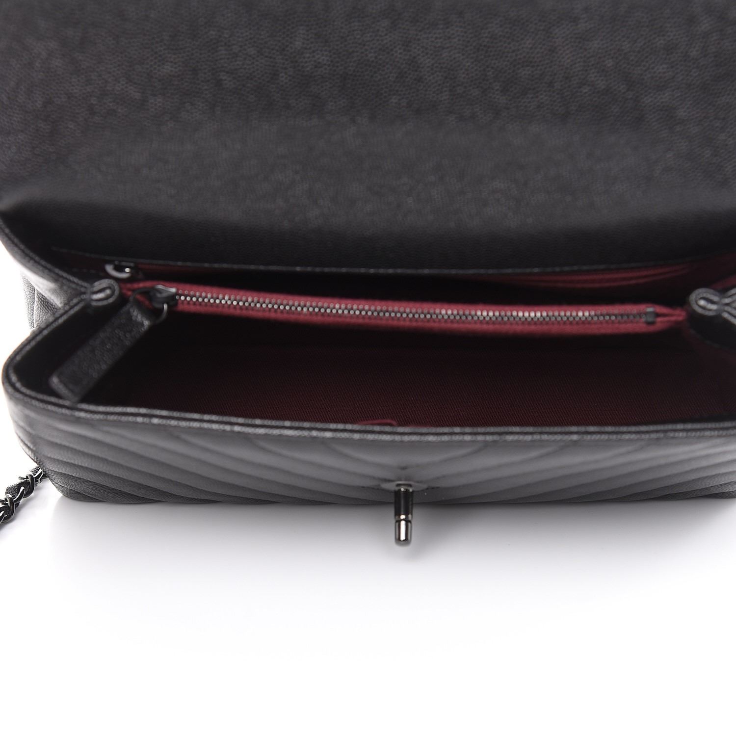 Ccrafted of chevron quilted grained caviar calfskin leather in black. The shoulder bag features a sturdy black leather top handle, a back chain link leather threaded shoulder strap with a shoulder pad, a rear patch pocket, and so black CC turn lock closure. This opens the flap to a partitioned burgundy fabric interior with a center zipper compartment, zipper and patch pockets.
