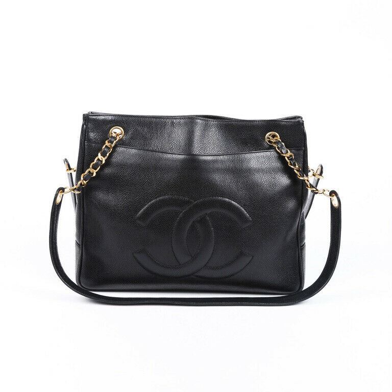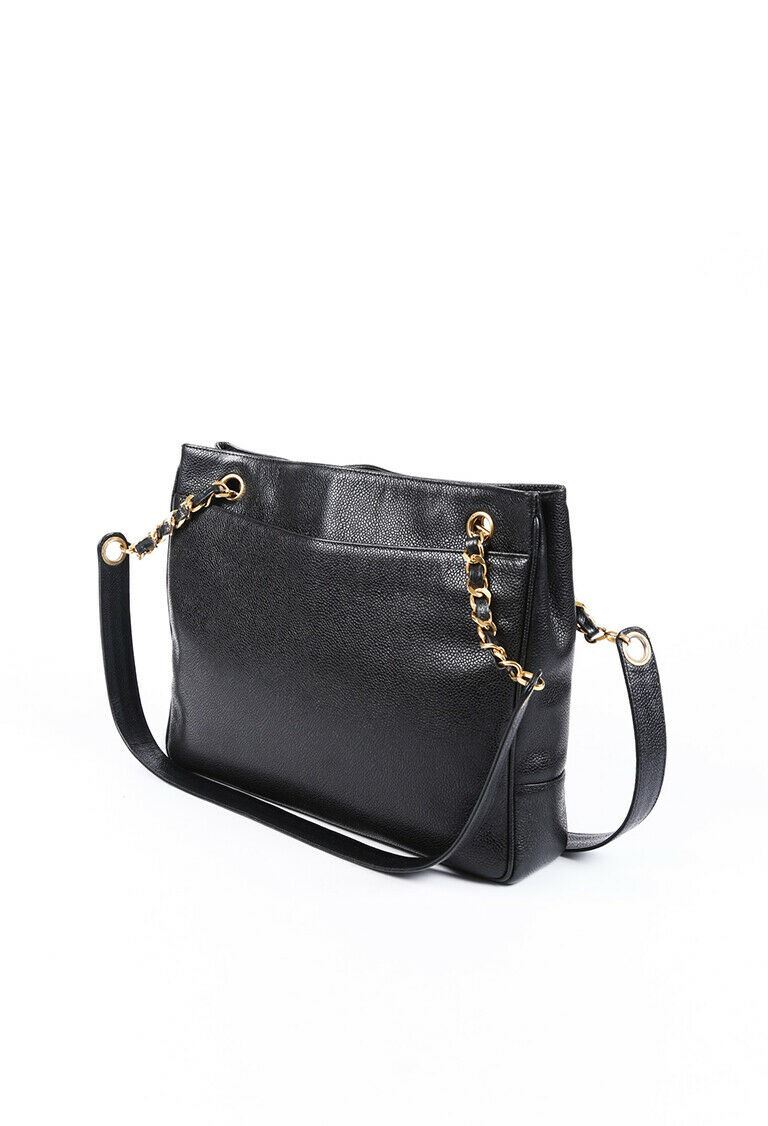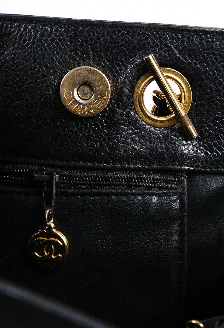 Circa 1989-1991. Vintage Chanel Timeless tote bag is crafted from caviar leather and features gold tone hardware, interwoven chain straps, CC logo emblem, outer slip pockets, magnetic closure, and a leather interior with pockets.