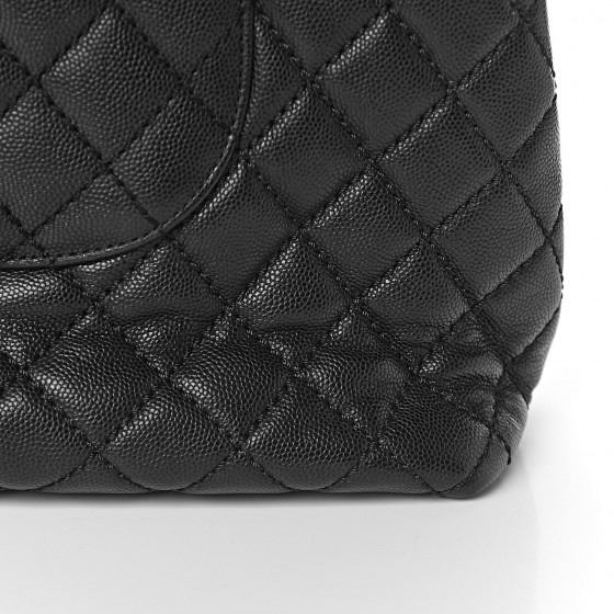Black classic tote is crafted of diamond quilted caviar leather . The shoulder bag features a rolled leather top handle, a leather threaded ruthenium chain shoulder strap with a shoulder pad and a CC turn lock closure. This opens the flap to a partitioned burgundy fabric interior with two zipper compartments and patch pockets.