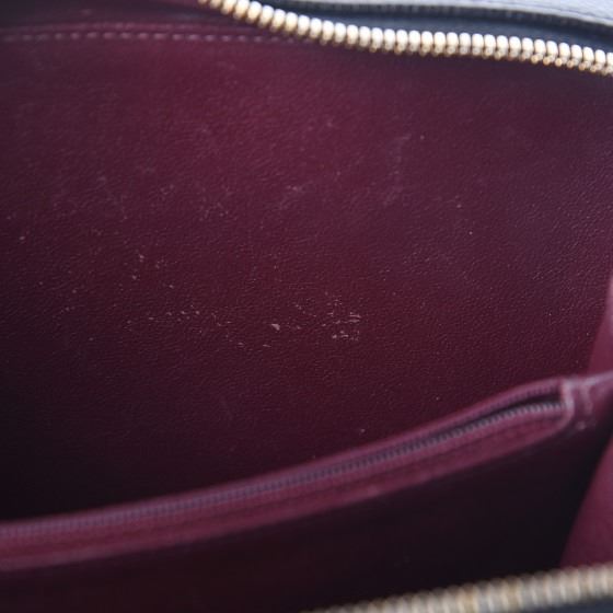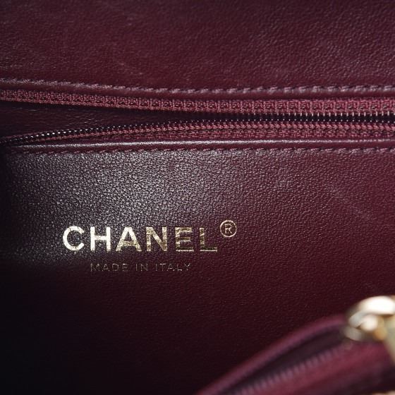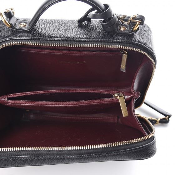 Black travel bag is crafted of luxurious diamond quilted caviar leather . This elegant shoulder bag features gold chain link black leather threaded shoulder strap, a black handle and a large Chanel CC stitched logo with gold accents on the front. The two zippers open all around to a partitioned burgundy leather interior with a central zipper compartment.