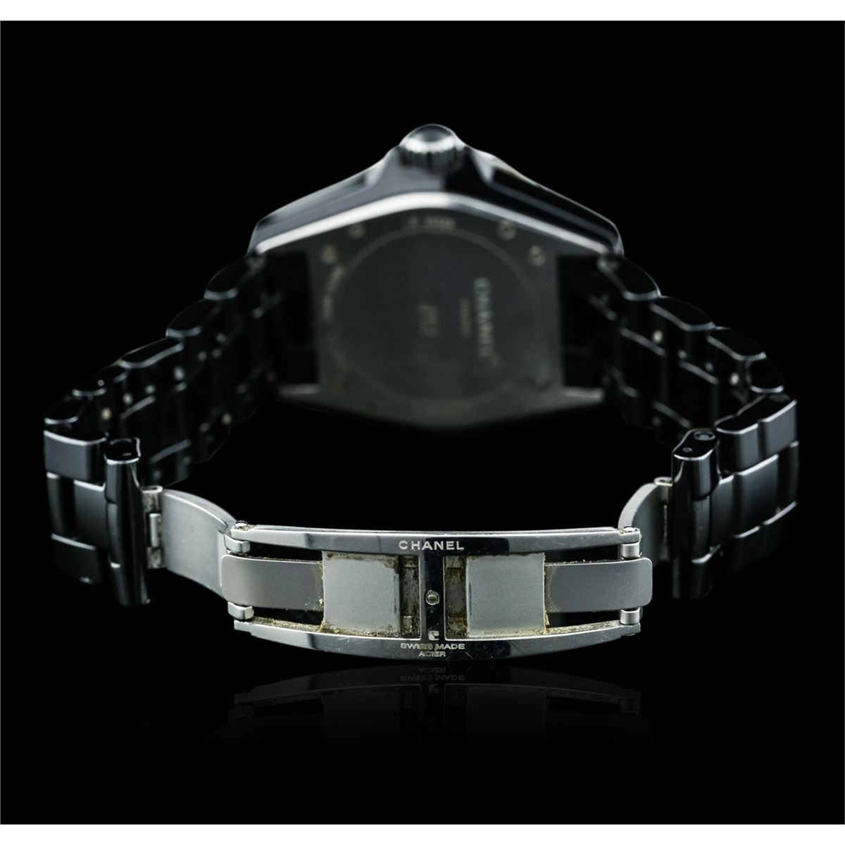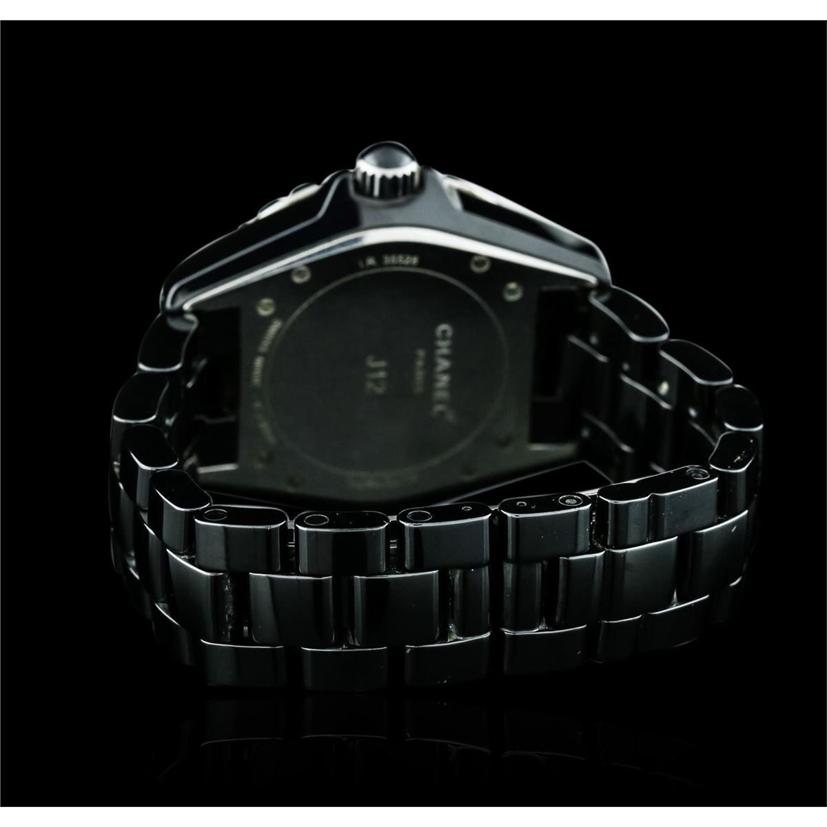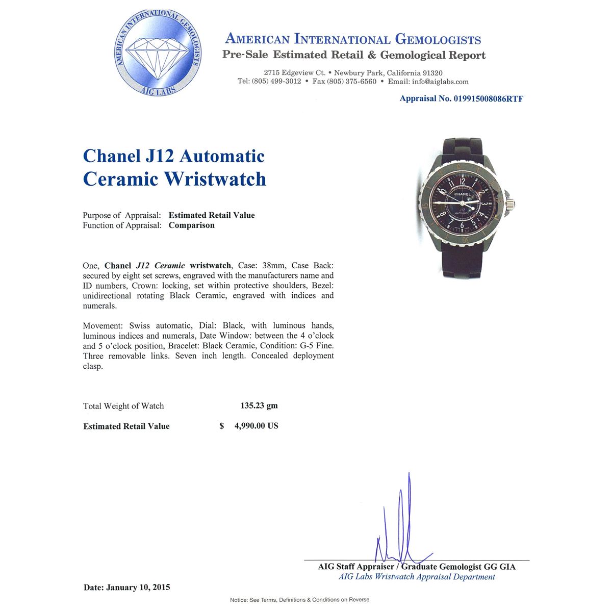 One, Chanel J12 Ceramic wristwatch, Case: 38mm, Case Back: secured by eight set screws, engraved with the manufacturers name and ID numbers, Crown: locking, set within protective shoulders, Bezel: unidirectional rotating Black Ceramic, with indices and numerals. Movement: Swiss automatic, Dial: Black, with luminous hands, luminous indices and numerals, Date Window: between the 4 o'clock and 5 o'clock position, Bracelet: Black Ceramic, Condition: G-5 Fine. Three removable links. Seven inch length. Concealed deployment clasp. Total Weight of Watch 135.23 grams. AIG Appraised at $4,990.00.