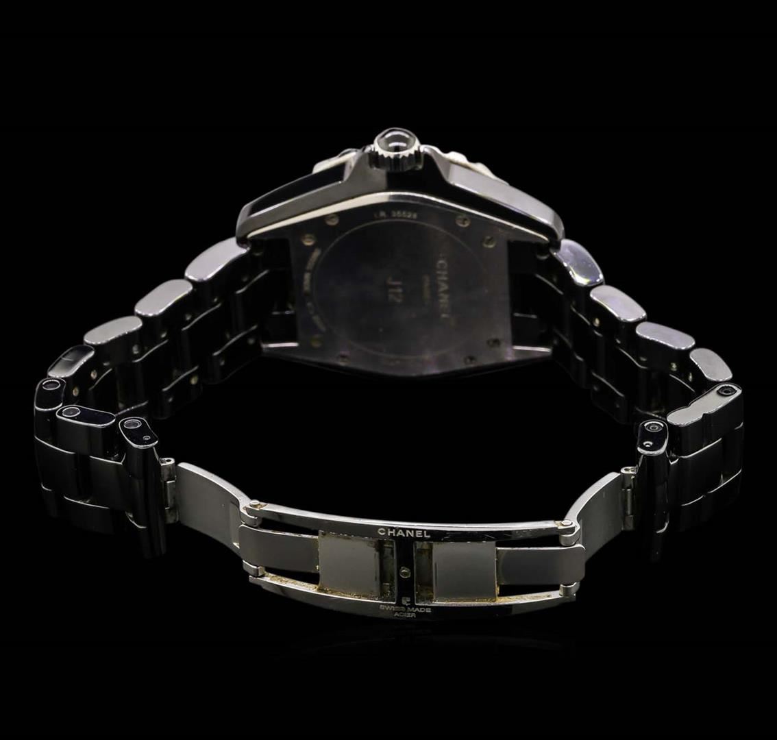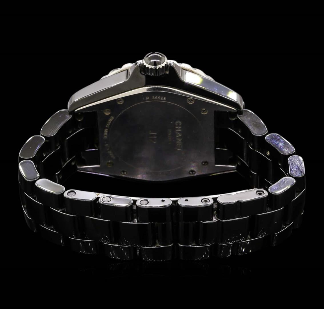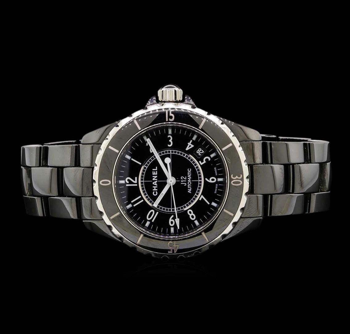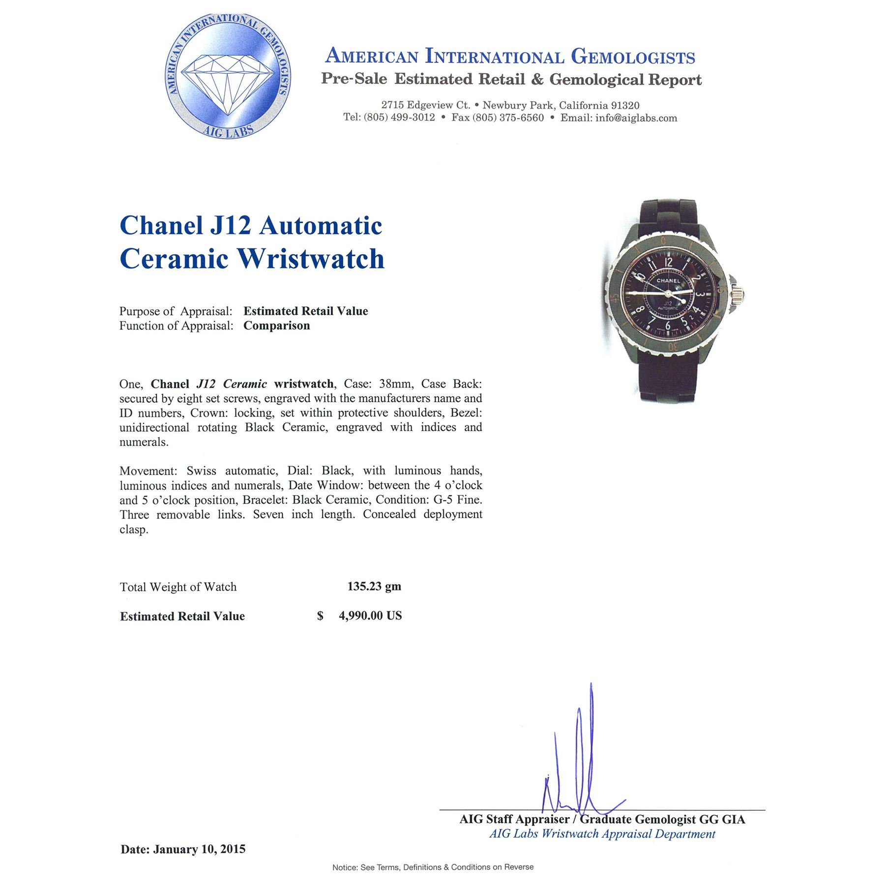 One, Chanel J12 Ceramic wristwatch, Case: 38mm, Case Back: secured by eight set screws, engraved with the manufacturers name and ID numbers, Crown: locking, set within protective shoulders, Bezel: unidirectional rotating Black Ceramic, with indices and numerals. Movement: Swiss automatic, Dial: Black, with luminous hands, luminous indices and numerals, Date Window: between the 4 o'clock and 5 o'clock position, Bracelet: Black Ceramic, Condition: G-5 Fine. Three removable links. Seven inch length. Concealed deployment clasp. Total Weight of Watch 135.23 grams. AIG Appraised at $4,990.00.