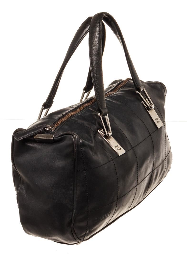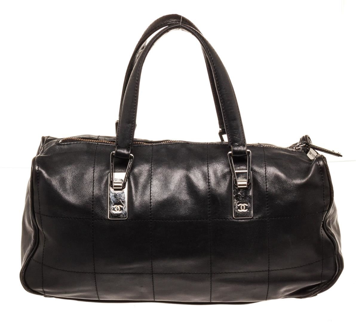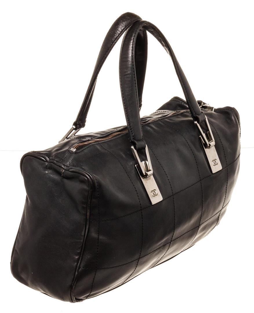 Chanel Chocolate Bar Boston Bag Boston Bag. Brand: Chanel, Style: Chocolate Bar Boston Bag, Type: Boston Bag, Exterior color: Black, Exterior material: Lambskin, Interior color: Black, Interior material: Fabric, Length: 14.5, Width: 4, Height: 7. Item is