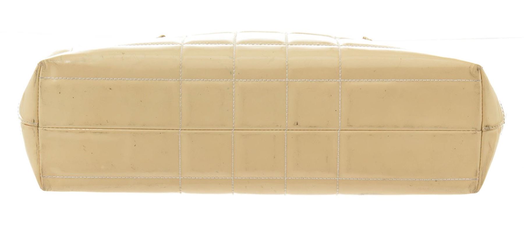 Chanel Chocolate Bar Tote Tote. Brand: Chanel, Style: Chocolate Bar Tote, Type: Tote, Exterior color: Ivory, Exterior material: Patent Leather, Interior color: White, Interior material: Canvas, Length: 15", Width: 4 1/2", Height: 9 7/8". Item is sold AS-I
