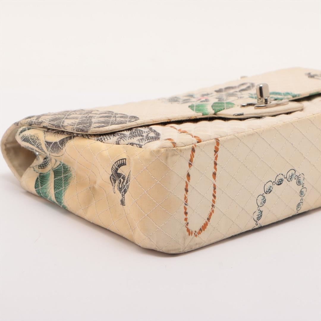 One Chanel Classic Beige Multicolor Quilted Canvas Flower Art Print Single Flap Shoulder Bag. Item is sold AS-IS. All available information is listed in the description and shown in the photo. Chanel Classic flap bag features diamond quilted canvas in beige with drawings of some Chanel icons (CC logo, Camelia flowers, bows, pearl necklaces, quilted bags and shoes), silver-tone hardware, CC turn-lock at front, interlaced chain with canvas shoulder strap and an open pocket on the back side of the bag. The interior of the bag is made from white leather with one slip pocket and one pocket that closes with a zipper. 10"L x 2.5"W x 6.5"H