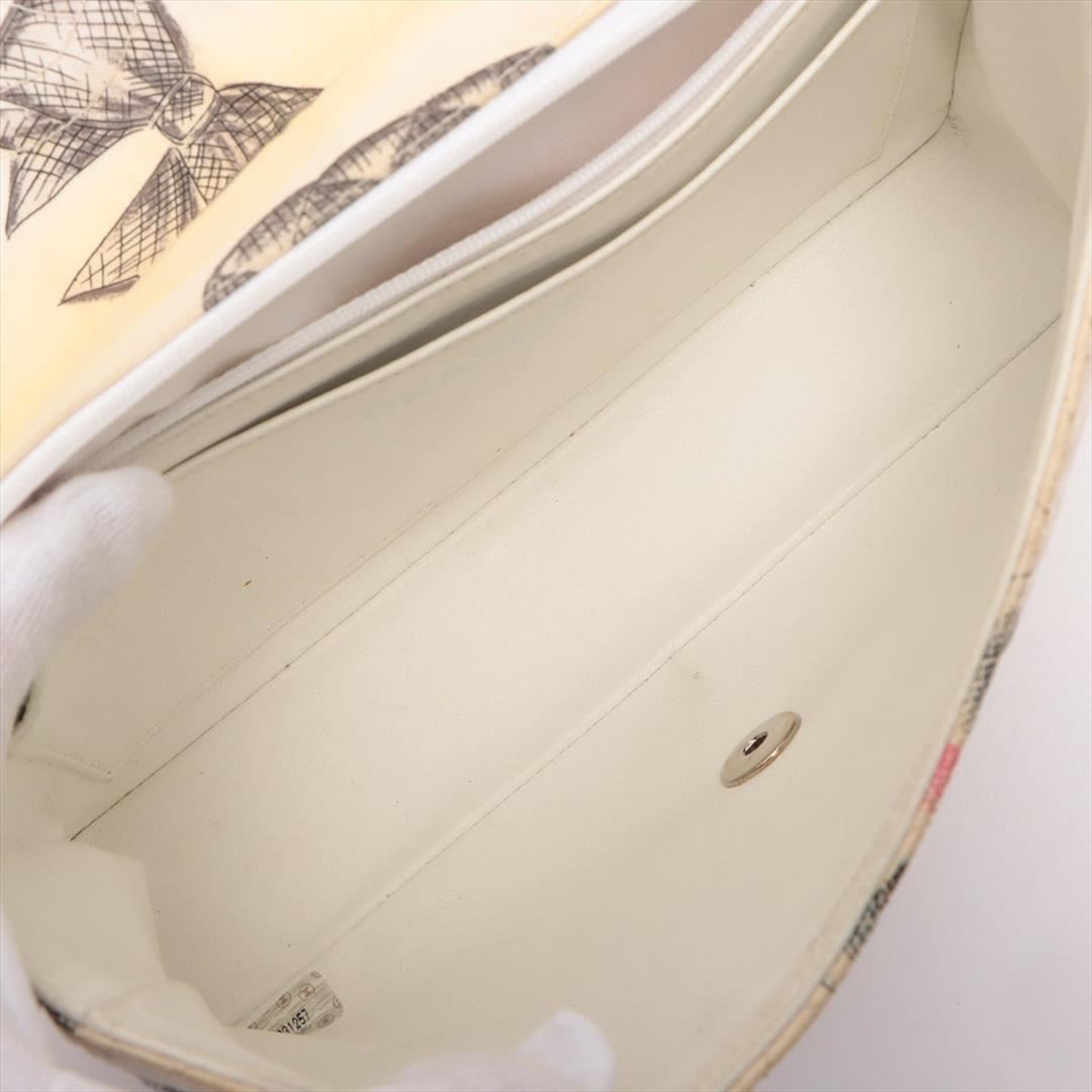 One Chanel Classic Beige Multicolor Quilted Canvas Flower Art Print Single Flap Shoulder Bag. Item is sold AS-IS. All available information is listed in the description and shown in the photo. Chanel Classic flap bag features diamond quilted canvas in beige with drawings of some Chanel icons (CC logo, Camelia flowers, bows, pearl necklaces, quilted bags and shoes), silver-tone hardware, CC turn-lock at front, interlaced chain with canvas shoulder strap and an open pocket on the back side of the bag. The interior of the bag is made from white leather with one slip pocket and one pocket that closes with a zipper. 10"L x 2.5"W x 6.5"H