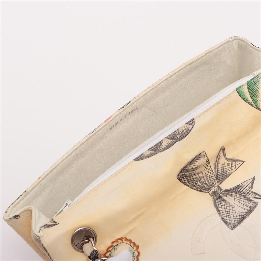 One Chanel Classic Beige Multicolor Quilted Canvas Flower Art Print Single Flap Shoulder Bag. Item is sold AS-IS. All available information is listed in the description and shown in the photo. Chanel Classic flap bag features diamond quilted canvas in beige with drawings of some Chanel icons (CC logo, Camelia flowers, bows, pearl necklaces, quilted bags and shoes), silver-tone hardware, CC turn-lock at front, interlaced chain with canvas shoulder strap and an open pocket on the back side of the bag. The interior of the bag is made from white leather with one slip pocket and one pocket that closes with a zipper. 10"L x 2.5"W x 6.5"H
