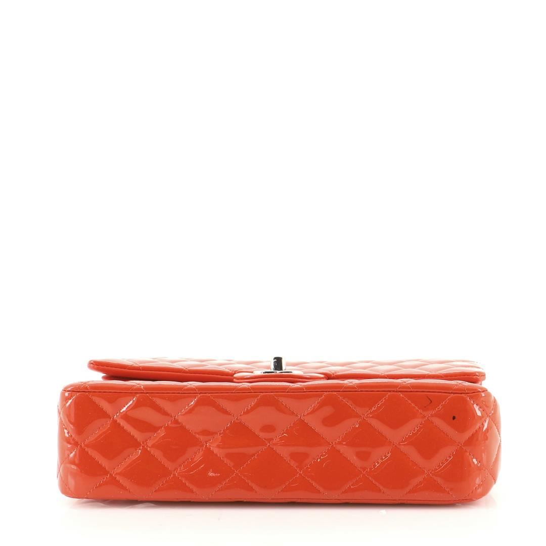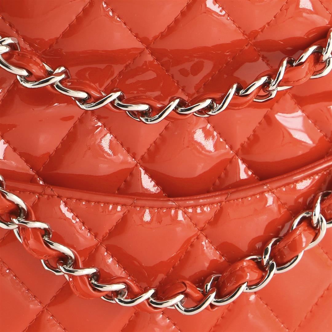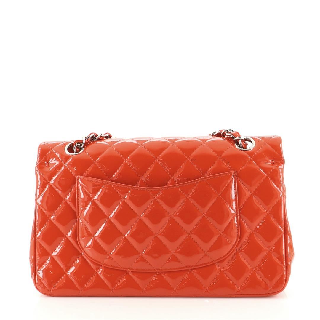 Chanel Classic Double Flap Bag Quilted Patent Medium. All available information is listed in the description and shown in the photos. Chanel Classic Double Flap Bag Quilted Patent Medium. Light scuffs on exterior, minor creasing on front, underneath flap and in interior, slight darkening on rear pocket edge. Pen mark on base, indentations on interior flap, peeling on strap, scratches on hardware.