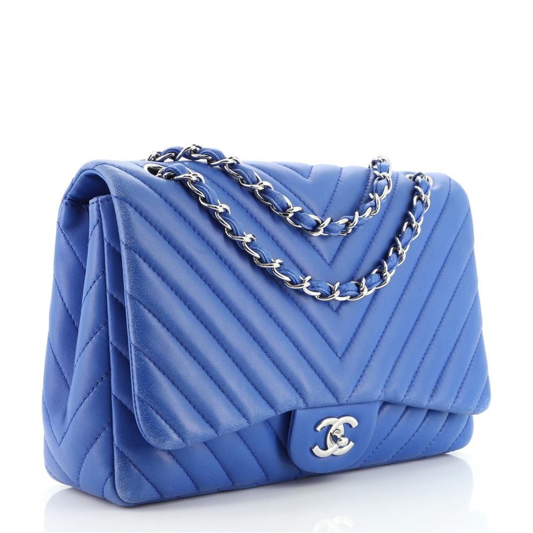 One Chanel Classic Single Flap Bag Chevron Lambskin Jumbo. Item is sold AS-IS. All available information is listed in the description and shown in the photo. Chanel Classic Single Flap Bag Chevron Lambskin Jumbo. Odor in interior. Creasing, wear and scuffs on exterior, underneath flap and in interior, small indentations on base and rear pocket, heavy wear on exterior and flap edges. Moderate wear on strap, scratches on hardware. 78848
