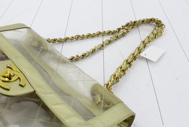 One Chanel Classic Vintage Naked Flap Quilted PVC with Gold Leather Maxi Flap Shoulder Bag. Item is sold AS-IS. All available information is listed in the description and shown in the photo. Clear quilted PVC Chanel Naked Maxi Flap shoulder bag with gold-tone hardware, gold lambskin leather trim, woven chain-link and leather long shoulder strap and interlocking CC turn-lock closure at the front flap. Handle Drop 12.5", Height 9", Width 12.5", Depth 3.5", Strap Drop 21.5"
