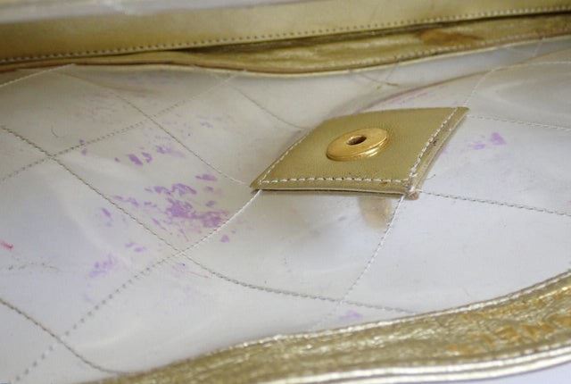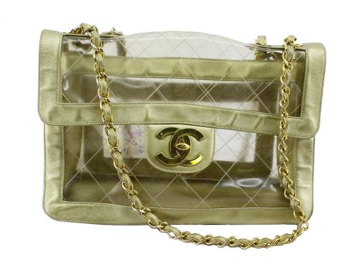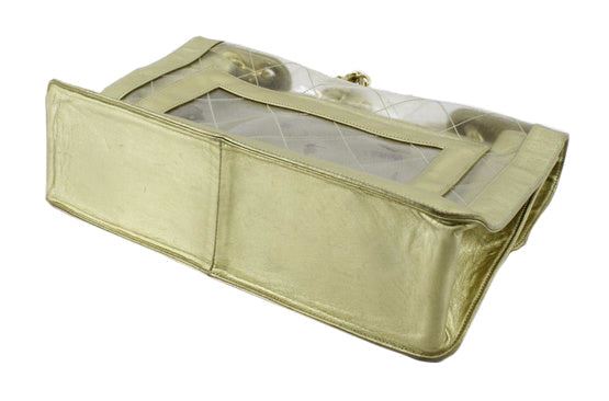 One Chanel Classic Vintage Naked Flap Quilted PVC with Gold Leather Maxi Flap Shoulder Bag. Item is sold AS-IS. All available information is listed in the description and shown in the photo. Clear quilted PVC Chanel Naked Maxi Flap shoulder bag with gold-tone hardware, gold lambskin leather trim, woven chain-link and leather long shoulder strap and interlocking CC turn-lock closure at the front flap. Handle Drop 12.5", Height 9", Width 12.5", Depth 3.5", Strap Drop 21.5"