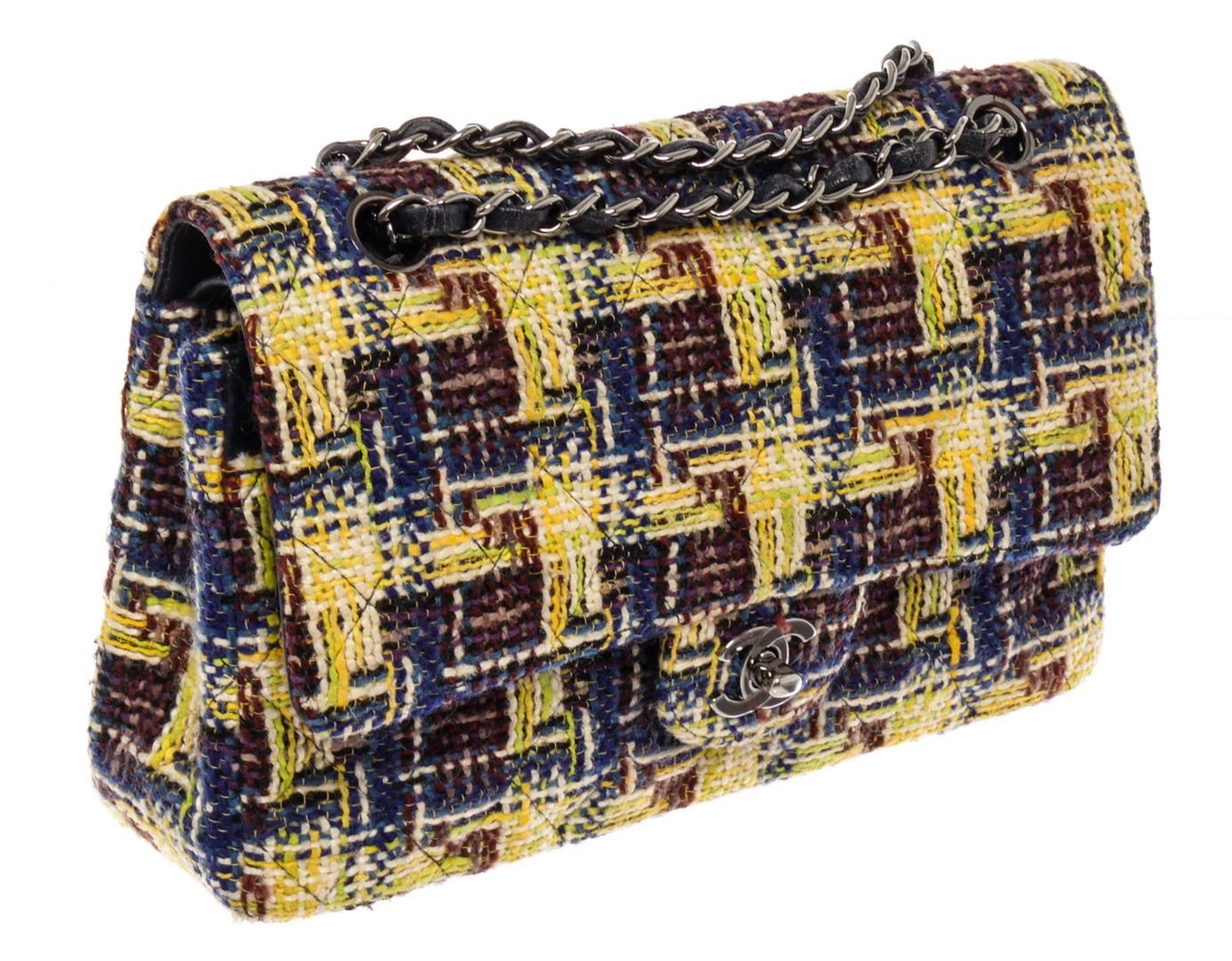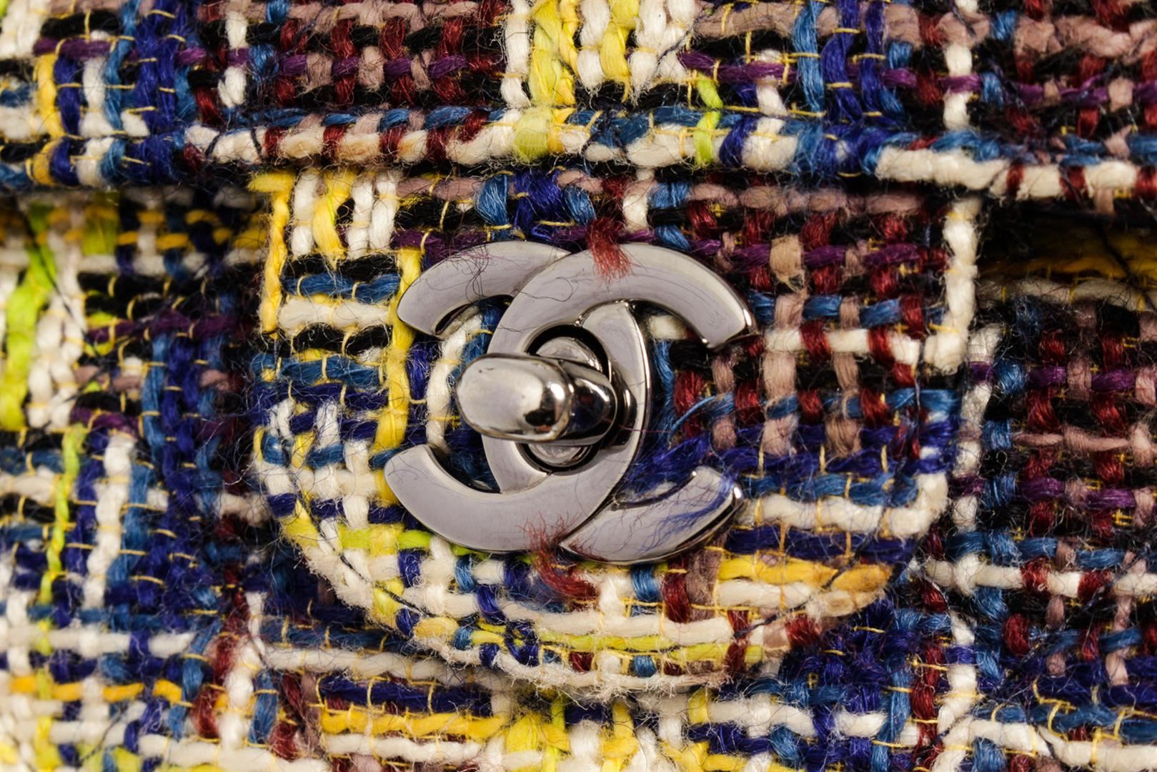 Yellow multicolor quilted tweed Chanel Double Flap shoulder bag with gunmetal hardware, woven leather and chain-link shoulder strap, patch pocket at exterior back, interlocking CC turn-lock at front flap that will open to navy blue leather-lined interior