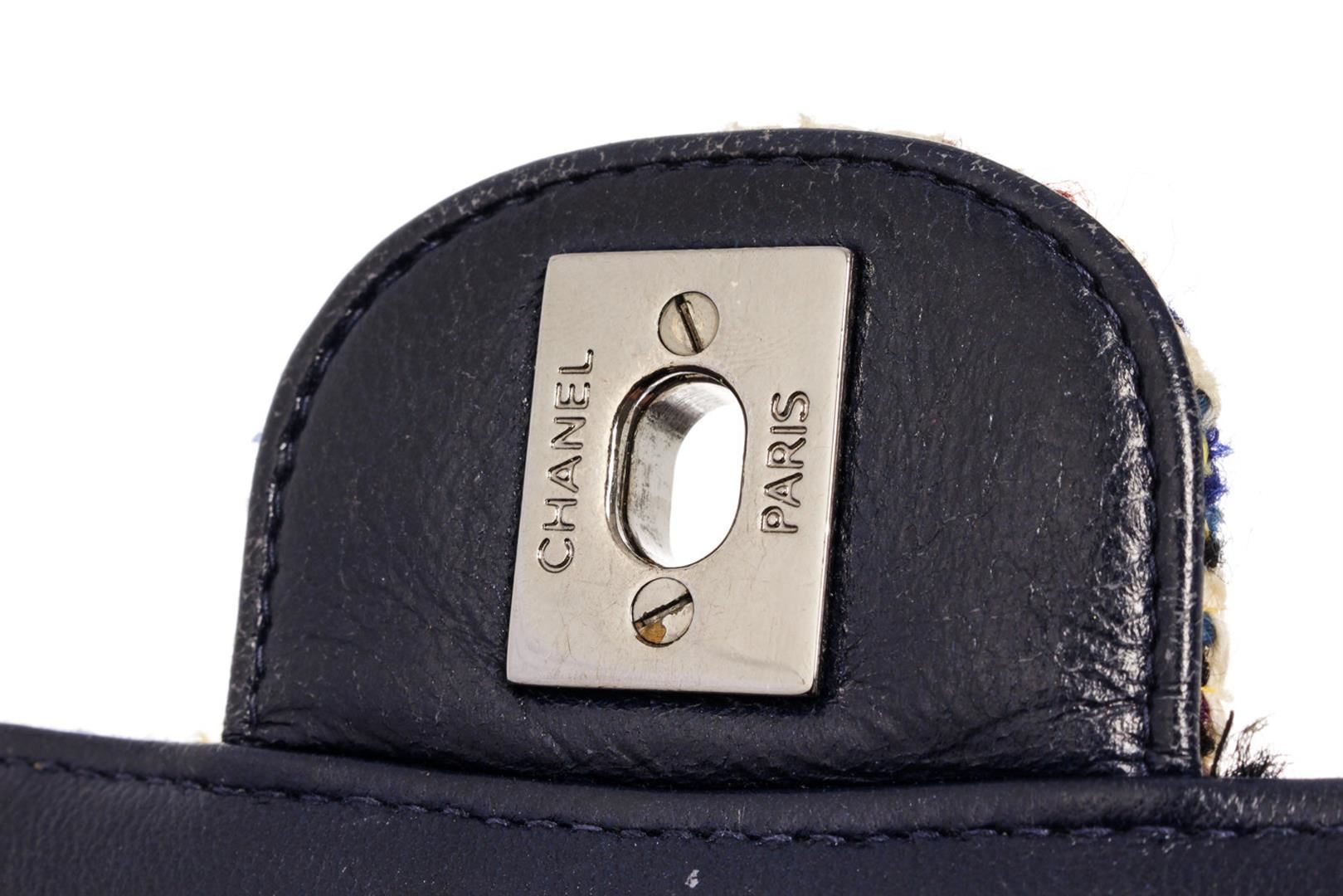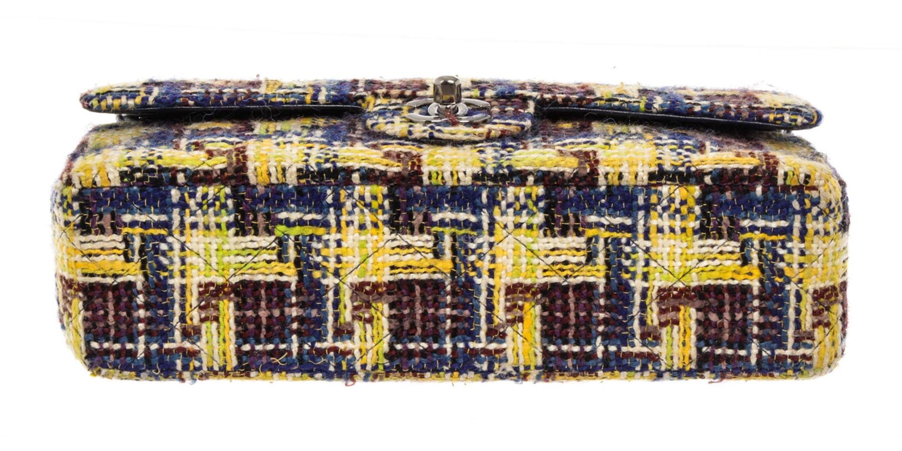 Yellow multicolor quilted tweed Chanel Double Flap shoulder bag with gunmetal hardware, woven leather and chain-link shoulder strap, patch pocket at exterior back, interlocking CC turn-lock at front flap that will open to navy blue leather-lined interior