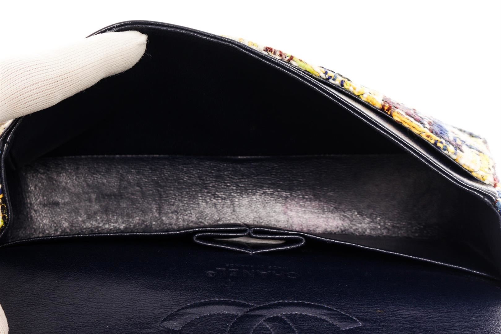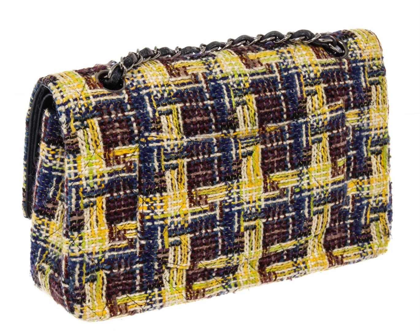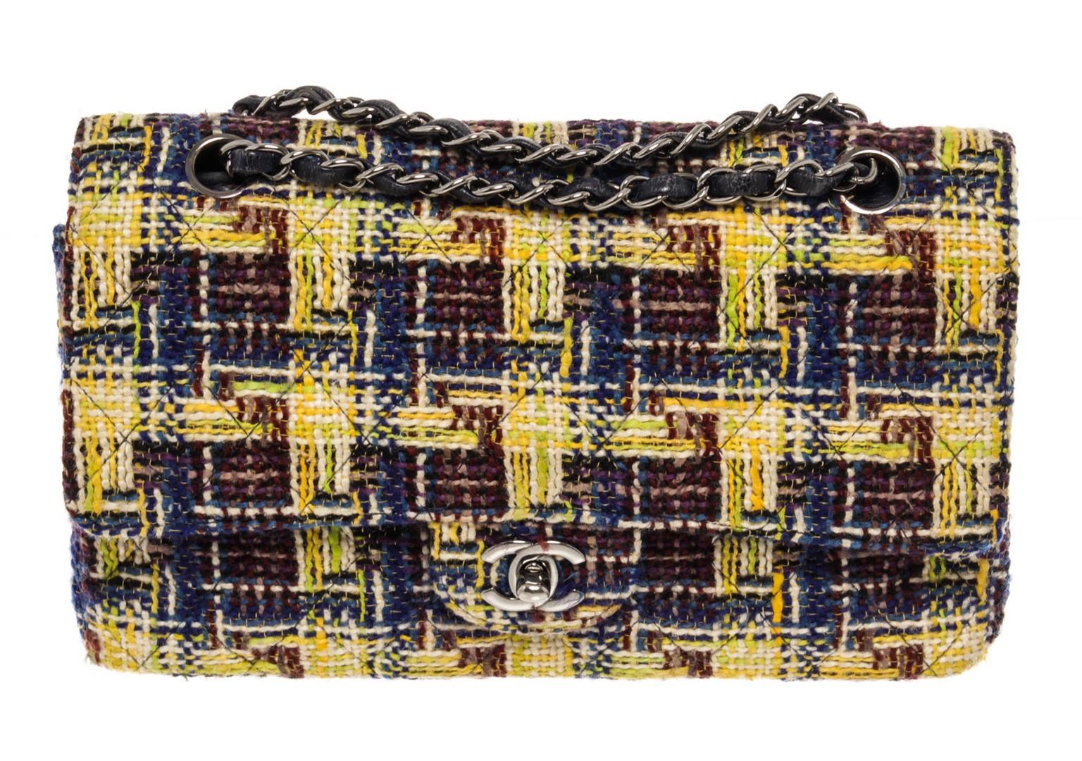 Yellow multicolor quilted tweed Chanel Double Flap shoulder bag with gunmetal hardware, woven leather and chain-link shoulder strap, patch pocket at exterior back, interlocking CC turn-lock at front flap that will open to navy blue leather-lined interior