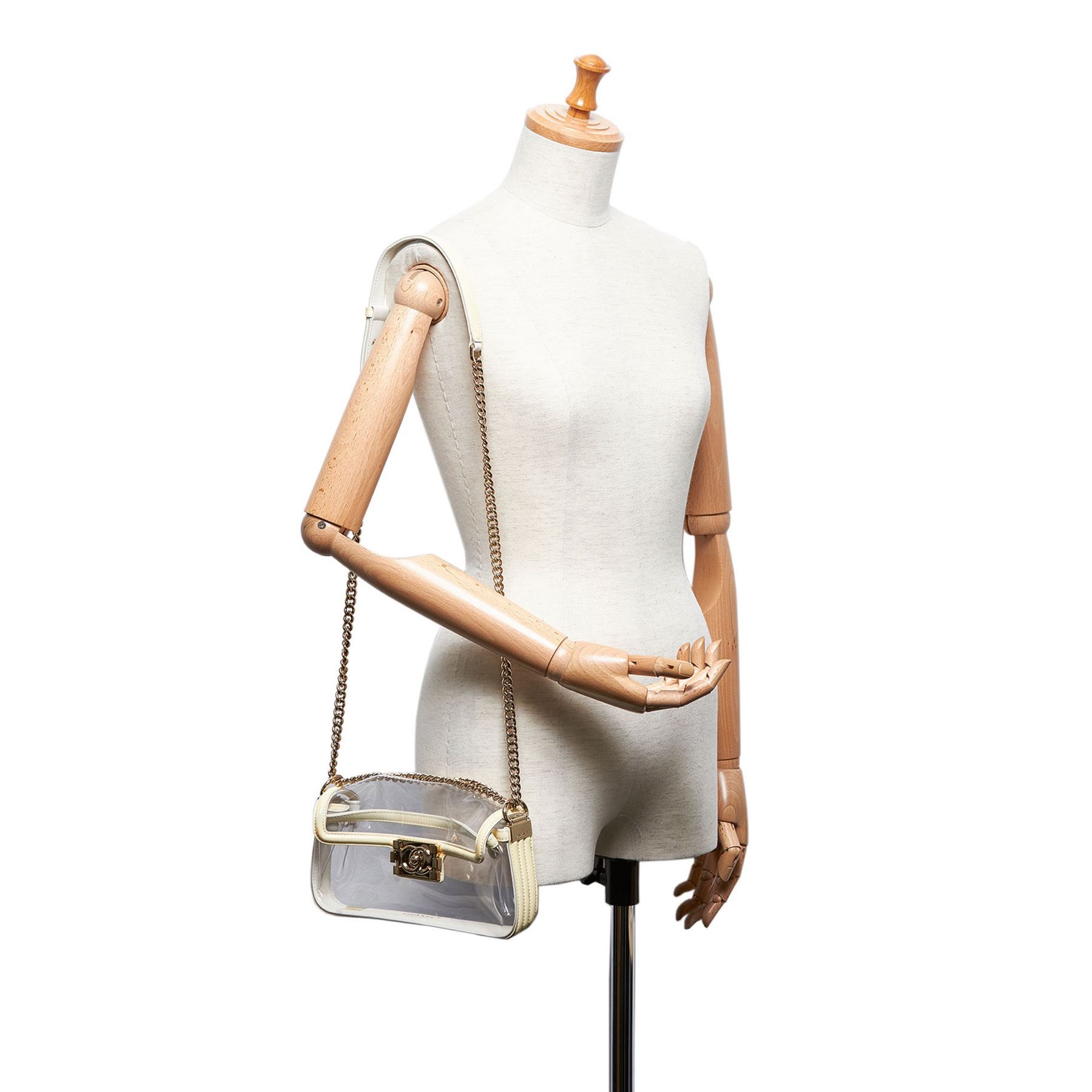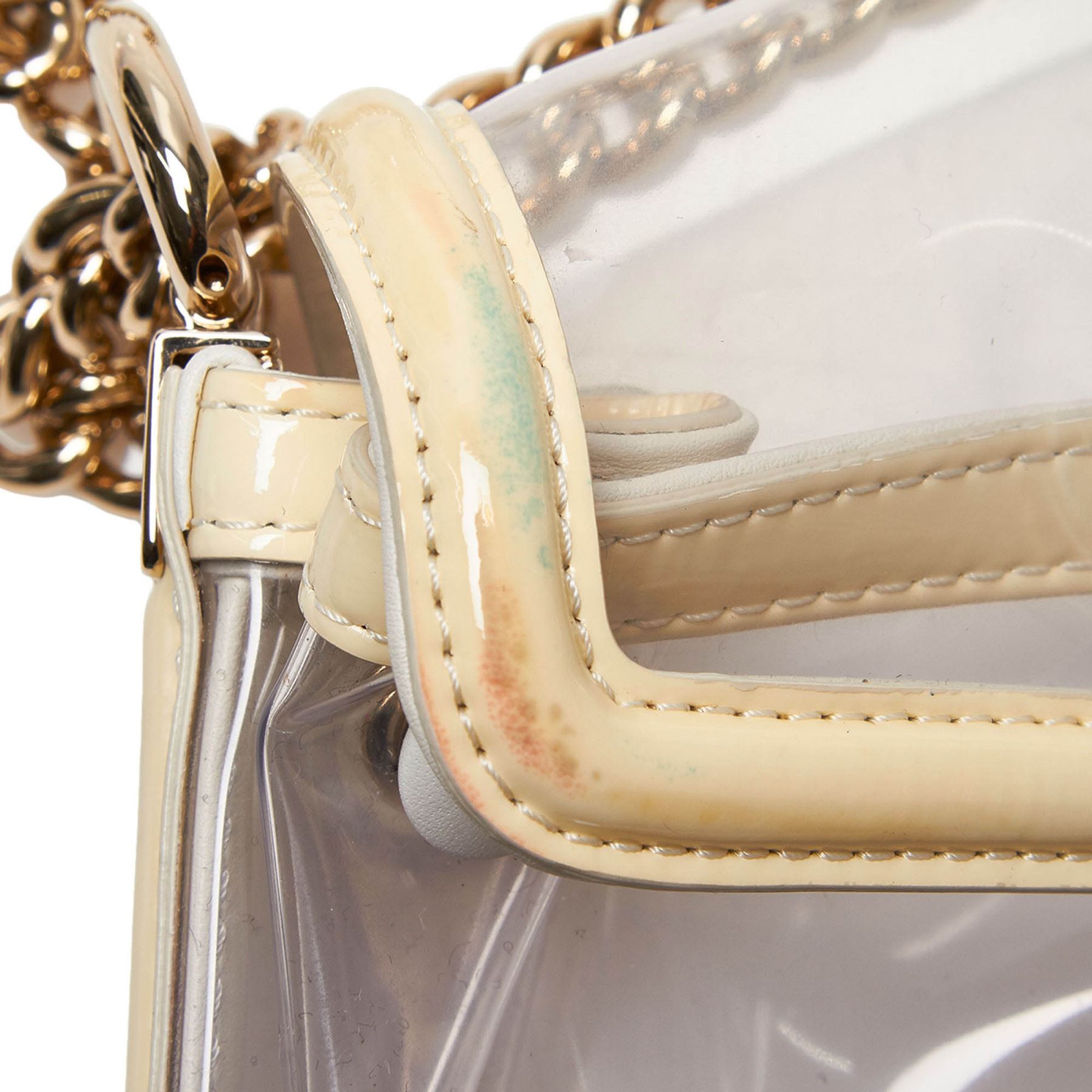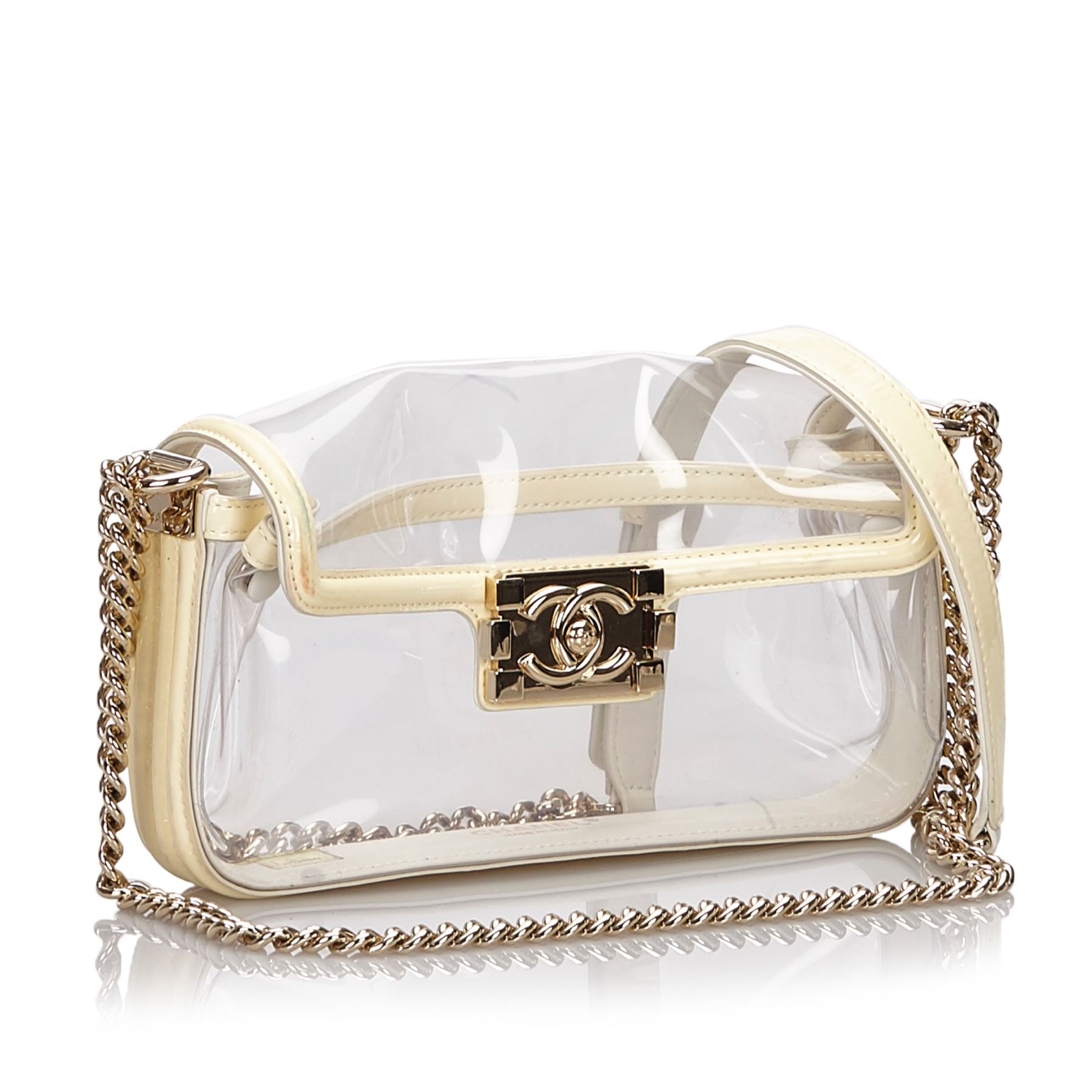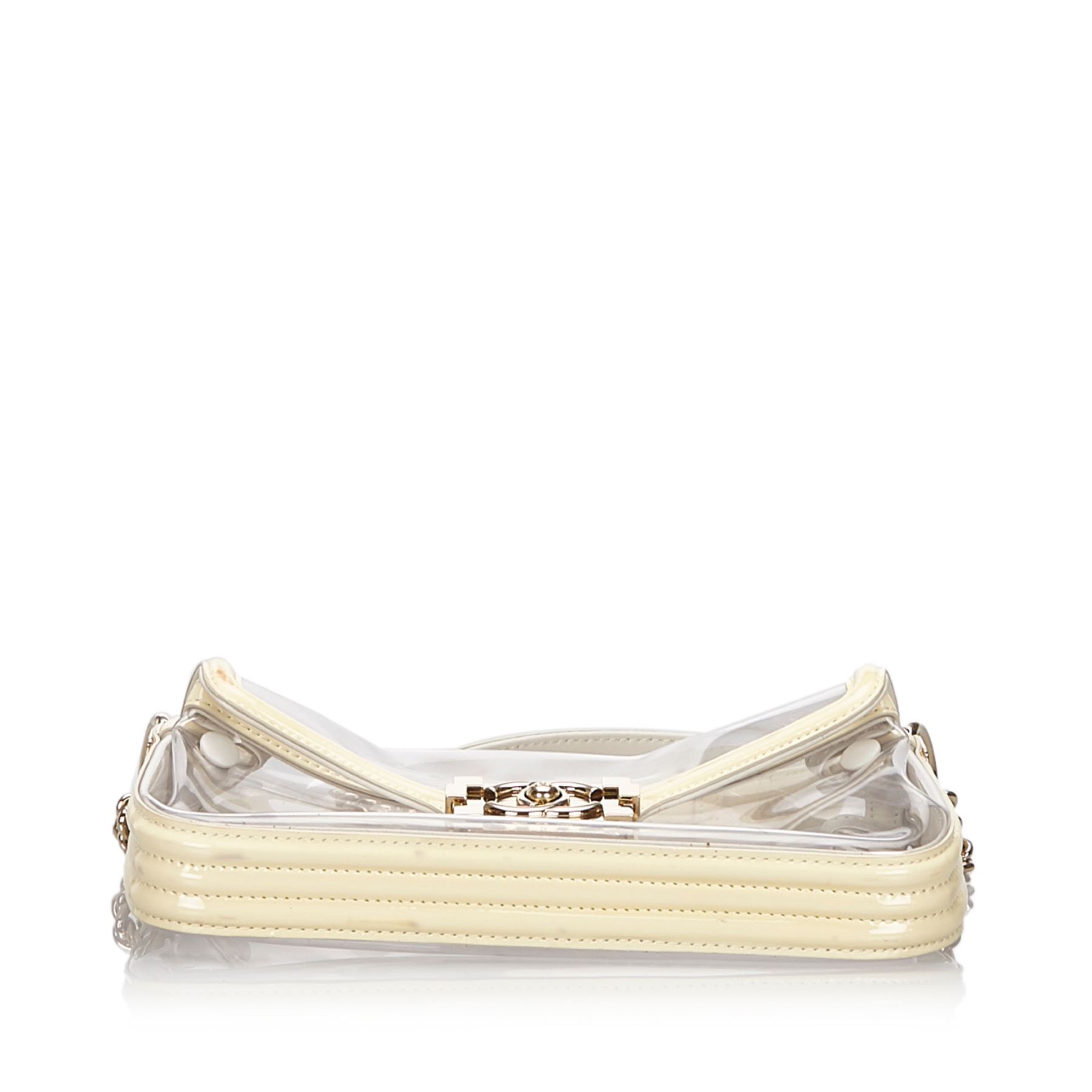The Boy crossbody bag features a vinyl body with patent leather trim, a curb chain strap, and a front flap with a magnetic snap button closure. Plastic x Vinyl x Leather x Patent Leather White Exterior front is stained with transfer of color and discolored. Exterior back is stained with transfer of color and discolored. Exterior bottom is stained with transfer of color and discolored. Exterior handle is stained with transfer of color and discolored. Exterior side is stained with transfer of color and discolored. Size: 13 x 23 x 3.5 Card: NO Made in: ITALY