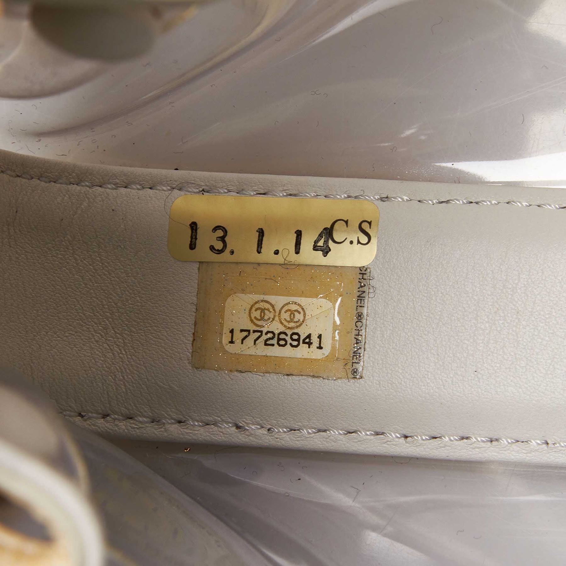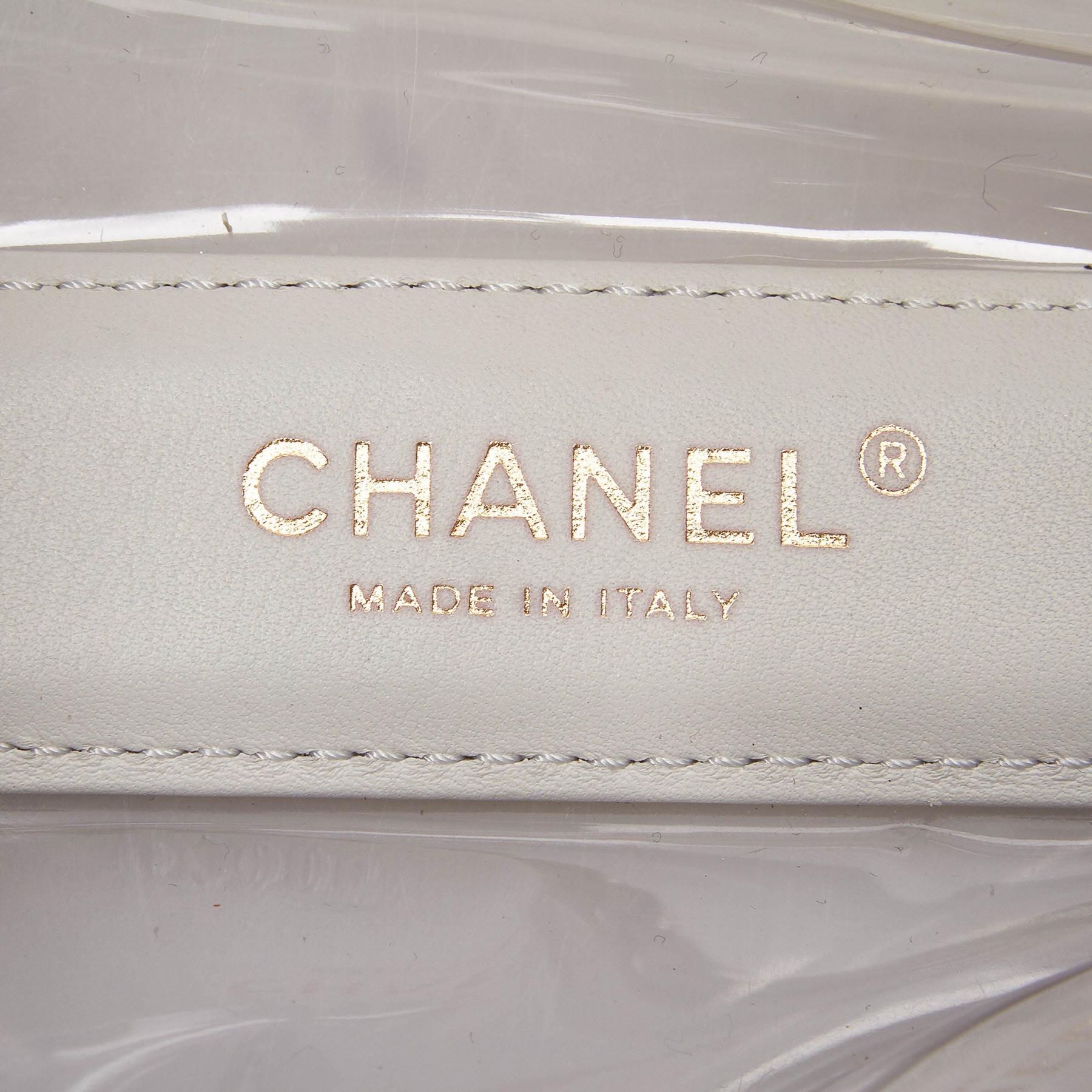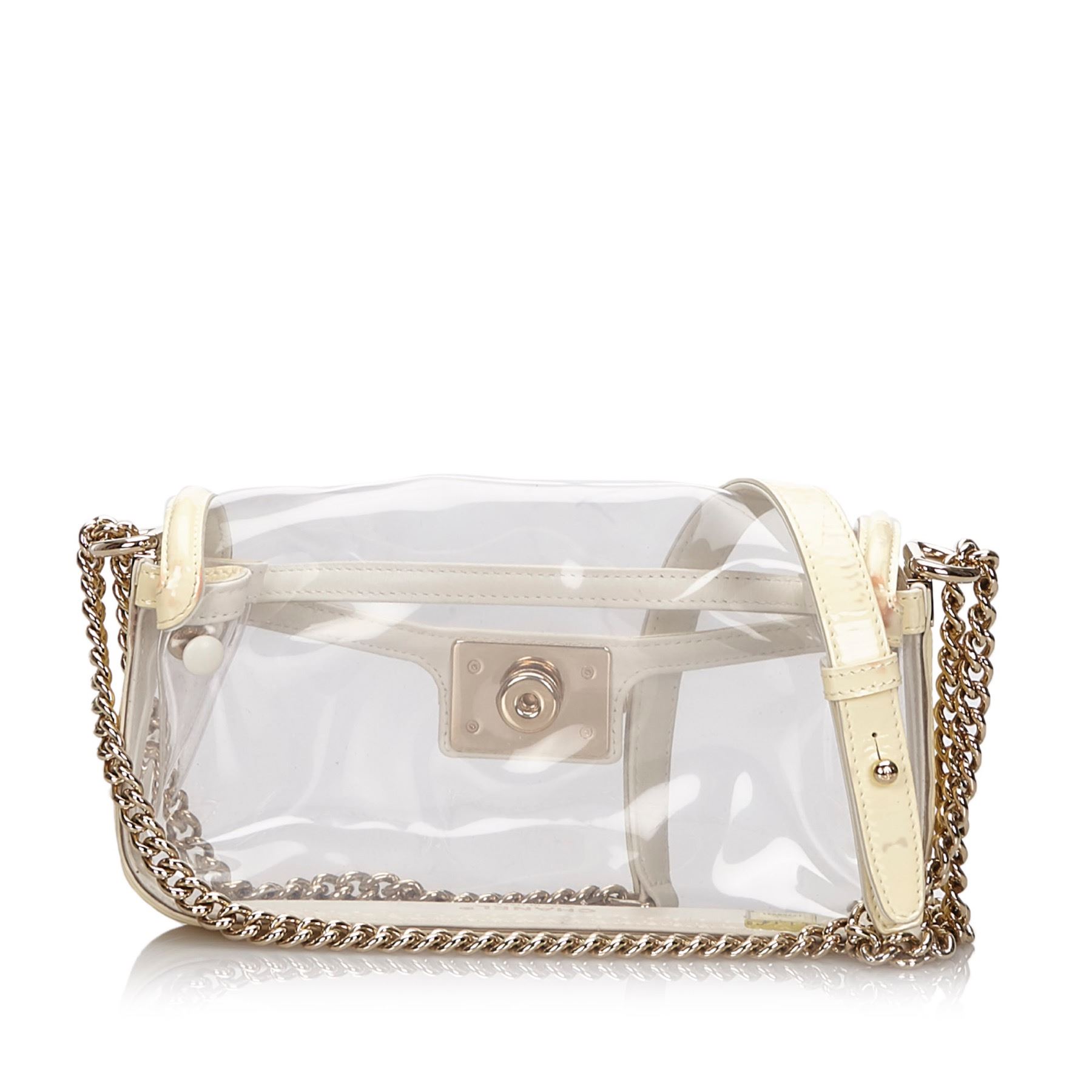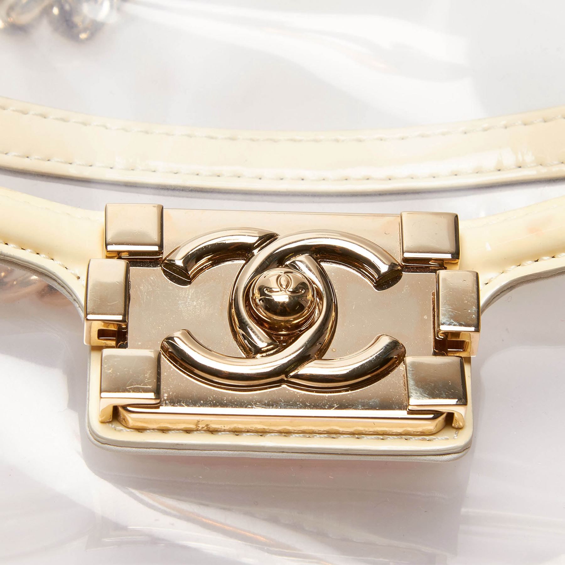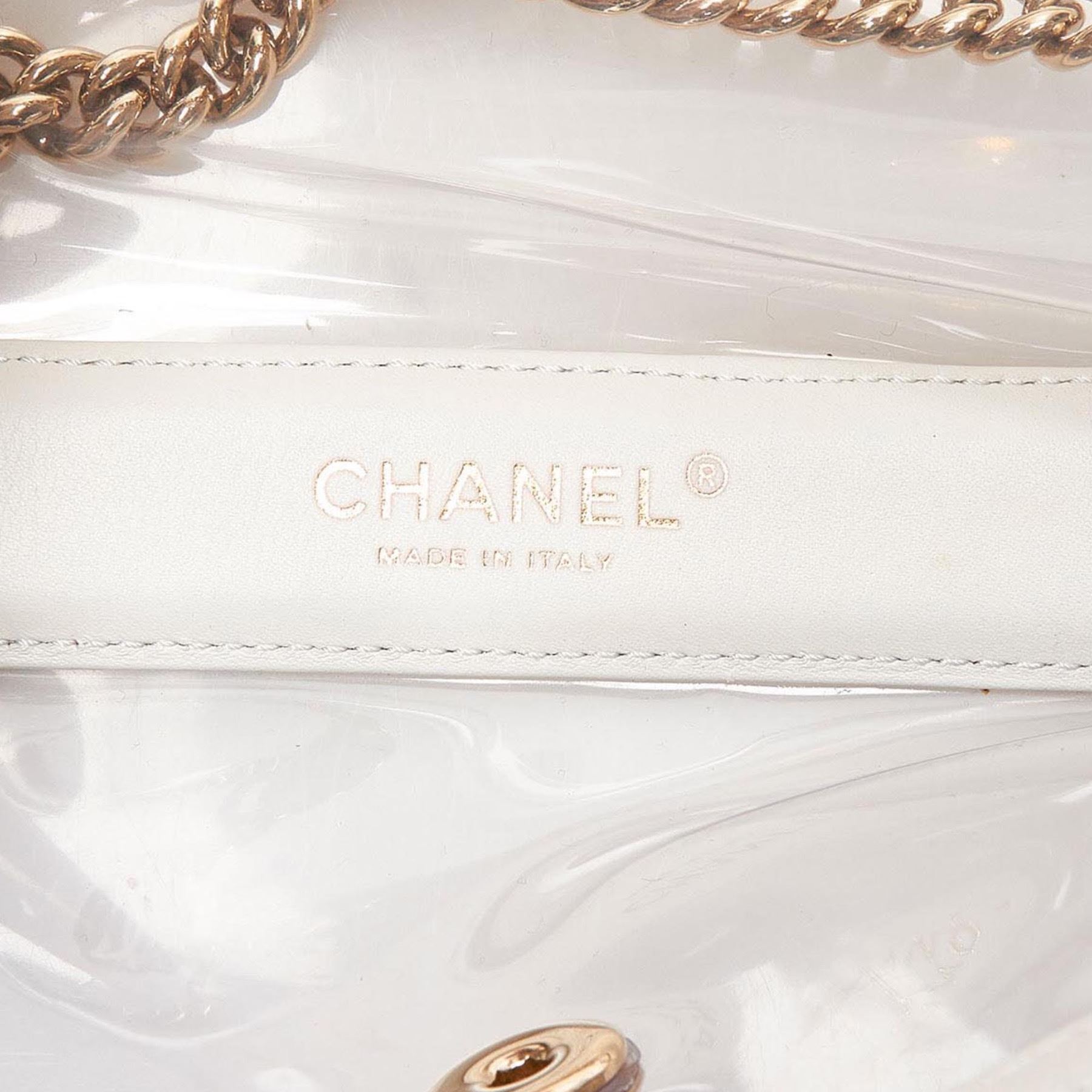 The Boy crossbody bag features a vinyl body with patent leather trim, a curb chain strap, and a front flap with a magnetic snap button closure. Plastic x Vinyl x Leather x Patent Leather White Exterior front is stained with transfer of color and discolored. Exterior back is stained with transfer of color and discolored. Exterior bottom is stained with transfer of color and discolored. Exterior handle is stained with transfer of color and discolored. Exterior side is stained with transfer of color and discolored. Size: 13 x 23 x 3.5 Card: NO Made in: ITALY