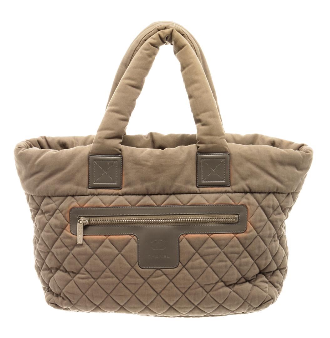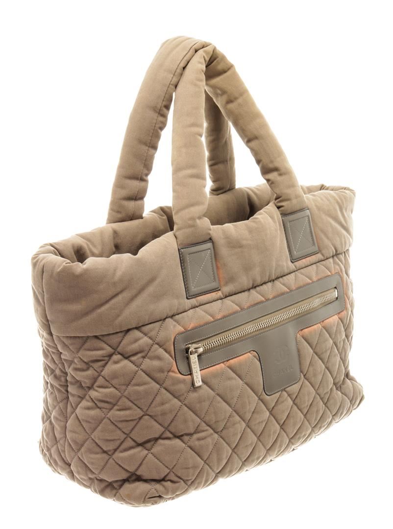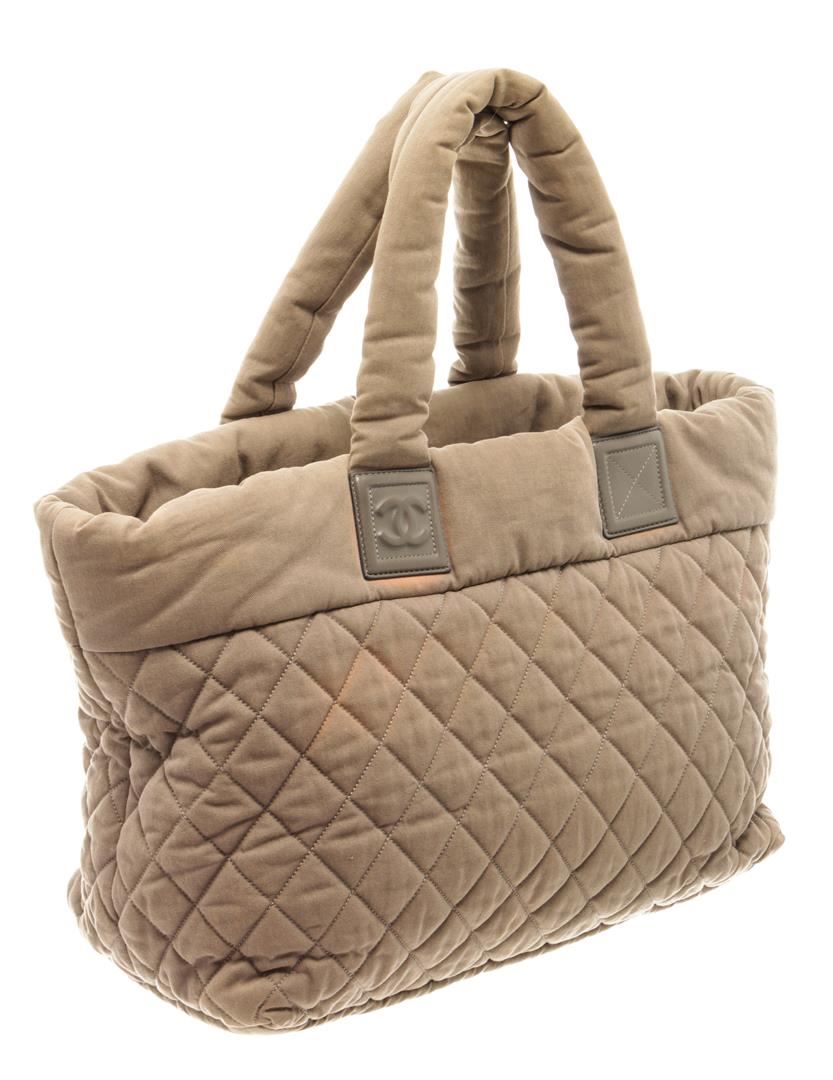 Chanel Coco Cocoon Tote. Brand: Chanel, Style: Coco Cocoon, Type: Tote, Exterior color: Green, Exterior material: Nylon, Interior color: Red, Interior material: Nylon, Length: 6.5, Width: 15, Height: 11.5. Item is sold AS-IS and all information pertaining