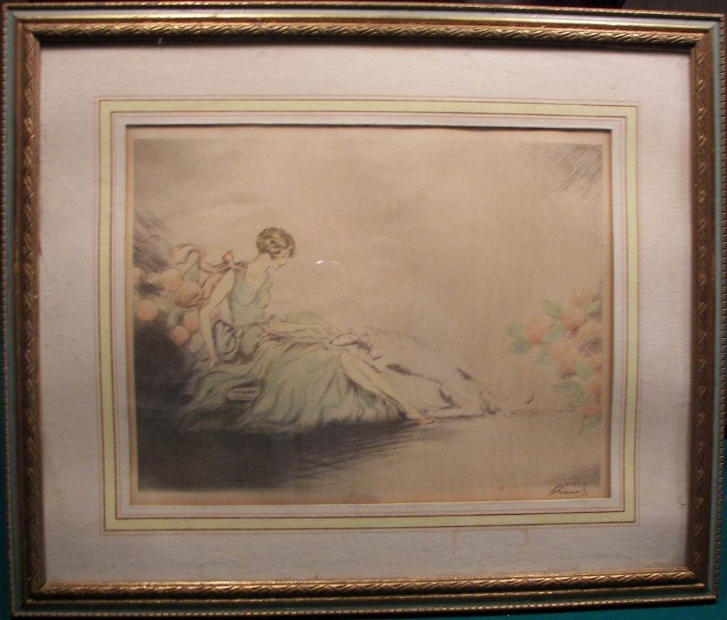 Chanel, Colored drypoint etching Chanel, 1934, Color drypoint etching, Seated woman with whippet, 9-1/2" x 12-1/2", Pencil signed lower right, Paper and mat both water damaged,gold on frame has been lost due to water damage, original French mat and frame,