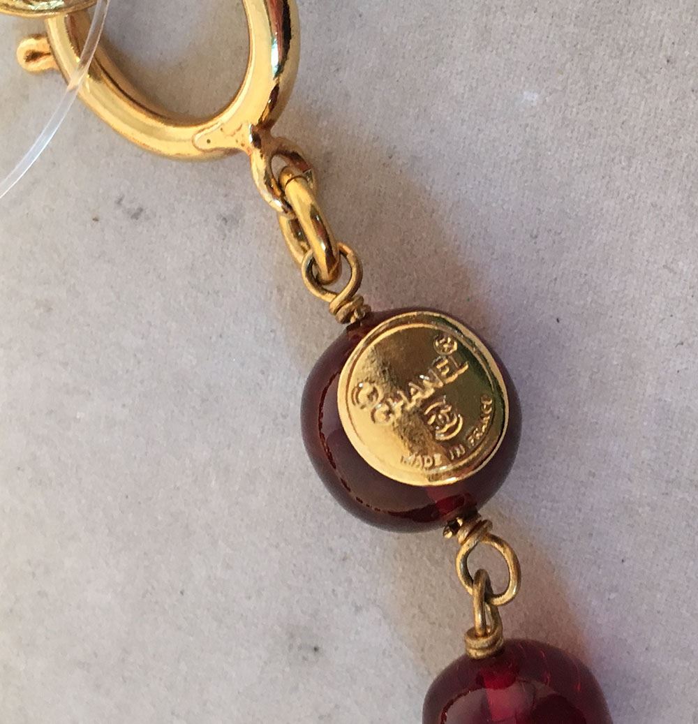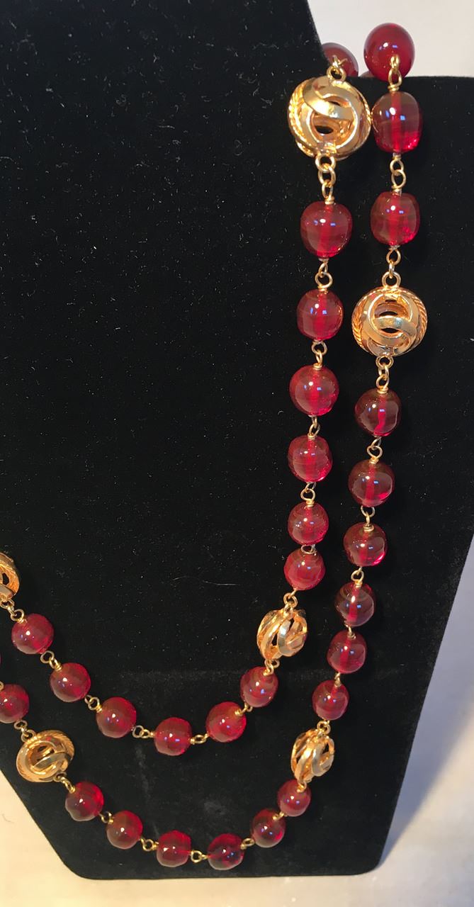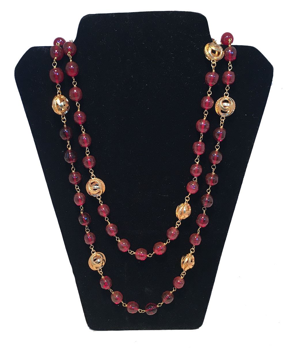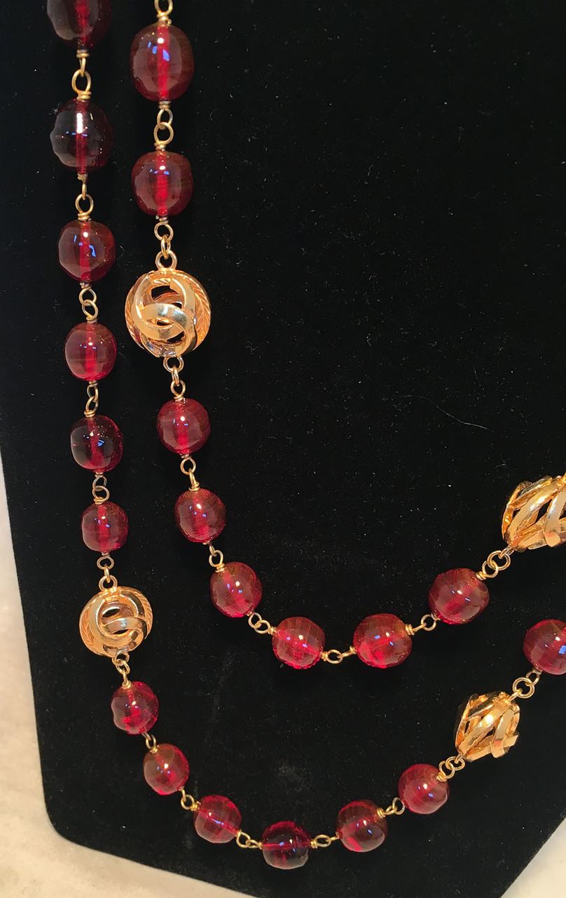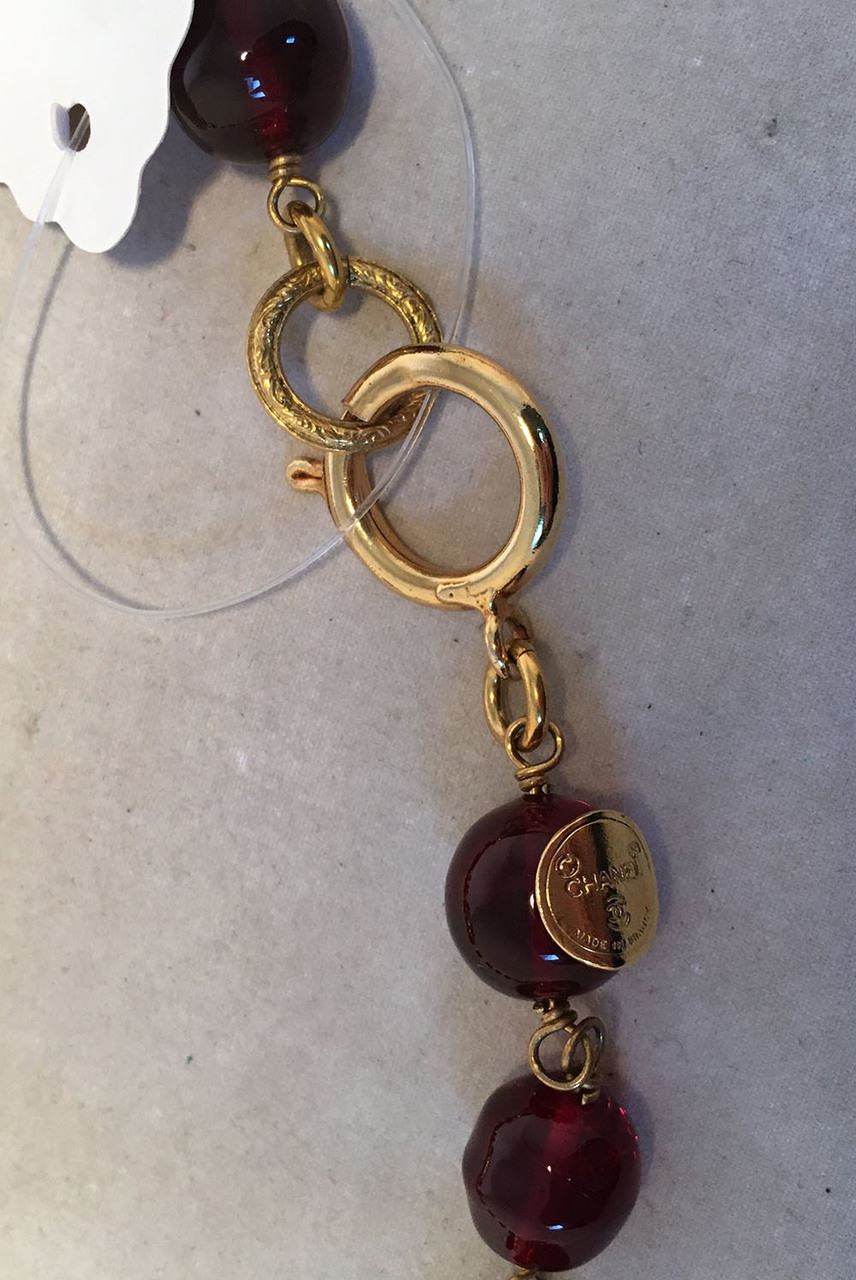 GORGEOUS Chanel Dark Red and Gold CC Beaded Long Necklace in excellent condition. Dark red glass beads with larger gold CC logo cut out beads strung throughout. Spring ring closure. Original logo made in France charm attached. No scuffs, scratches, or chips. Rare dark red beads add a classy touch of color to any ensemble. Can be worn long or wrapped and layered for multiple looks and styles. Total length=68"#Bags1174