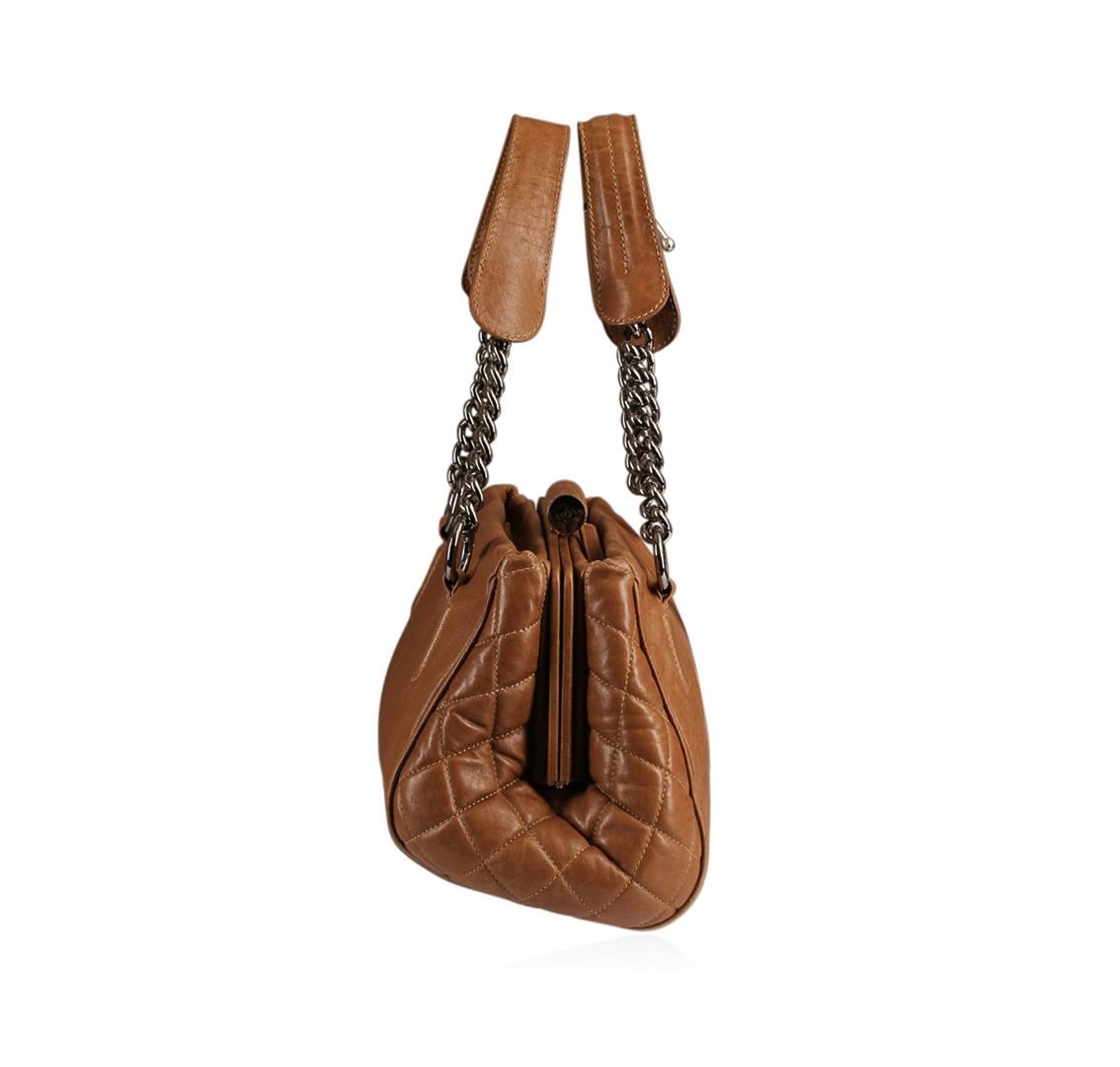 One Chanel Day Brown Handbag. This roomy tote epitomizes everyday sophistication and makes a perfect everyday bag, large enough to hold all your essentials in style. Measurements for this handbag: Length 14in, Width 7in. Interior contains 2 open pockets and 1 enclosed pocket with zipper. The interior is clean and in good condition.