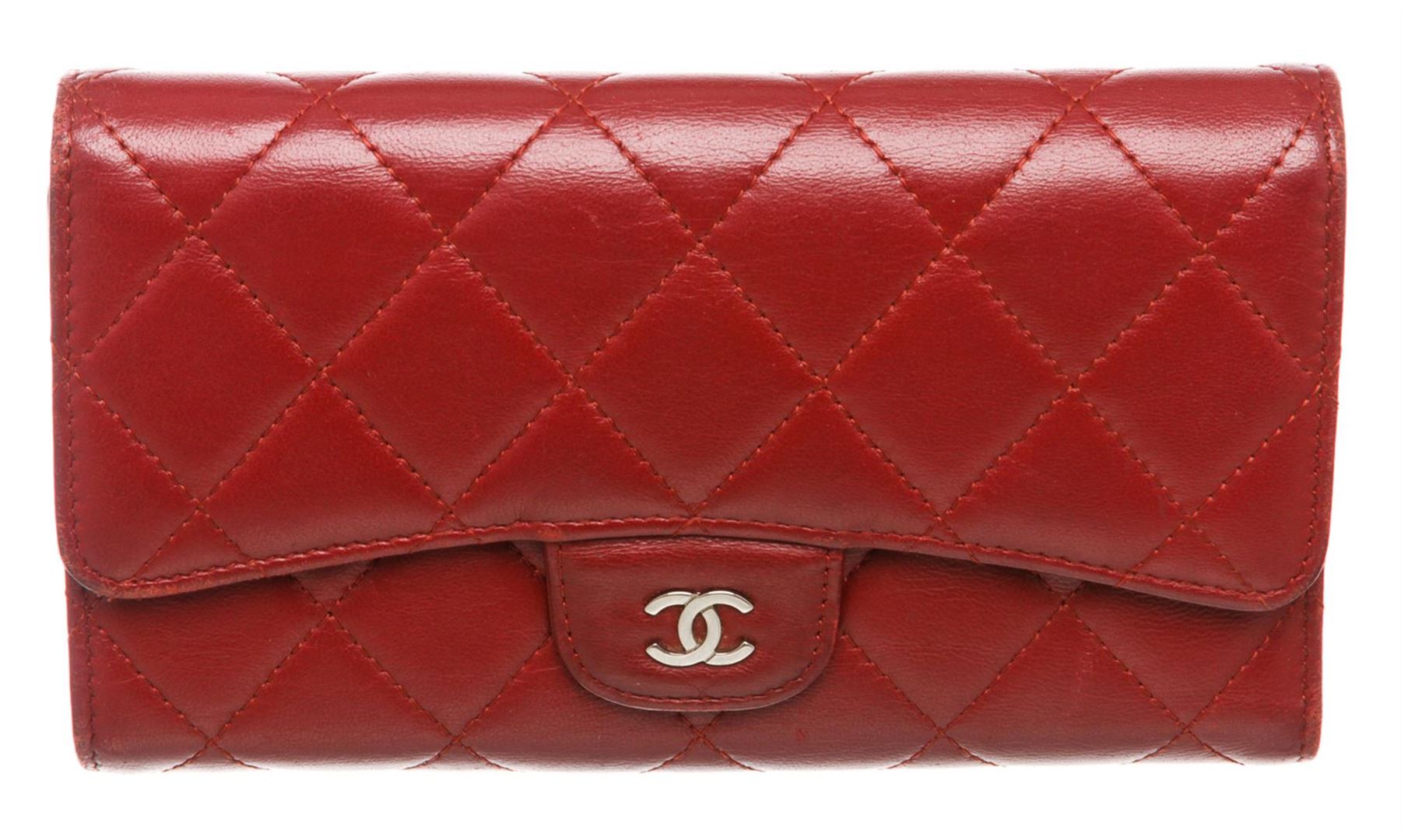 Chanel deep red quilted lambskin leather Classic Long Flap Wallet with silver-tone hardware, side pocket, three bill pockets, flap pocket, six card slot, flap with snap closure. Authentic.