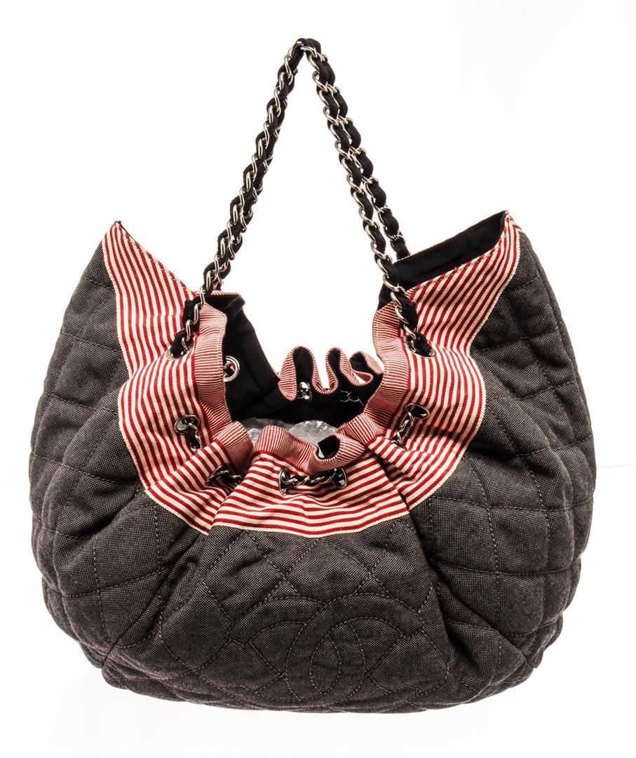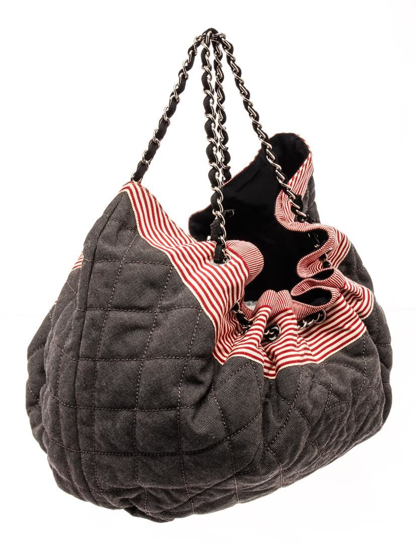 Chanel Denim Cabas XL Stretch Spirit Shoulder Bag. All available information is listed in the description and shown in the photos. Chanel Denim Cabas XL Stretch Spirit Shoulder Bag with scratches on hardware, moderate wear on handles and in interior, small marks on opening trim, Drawstring closure. Height: 13 in (33.02 cm), Width: 18 in (45.72 cm), Depth: 5 in (12.7 cm)