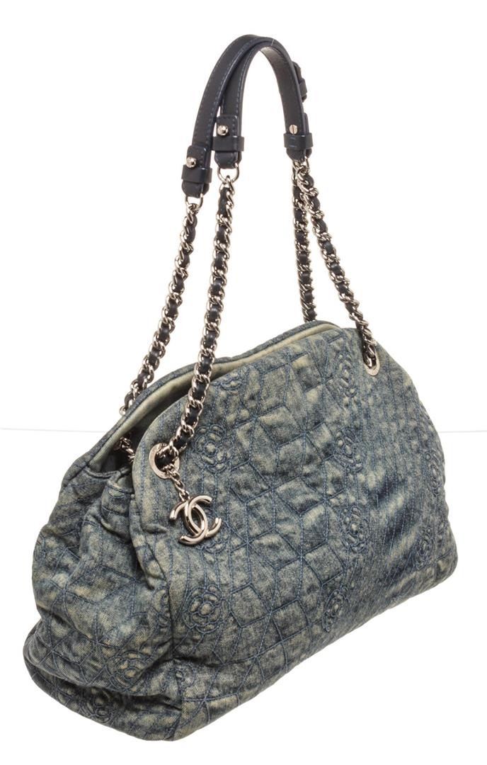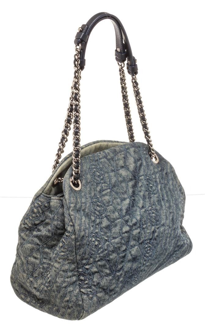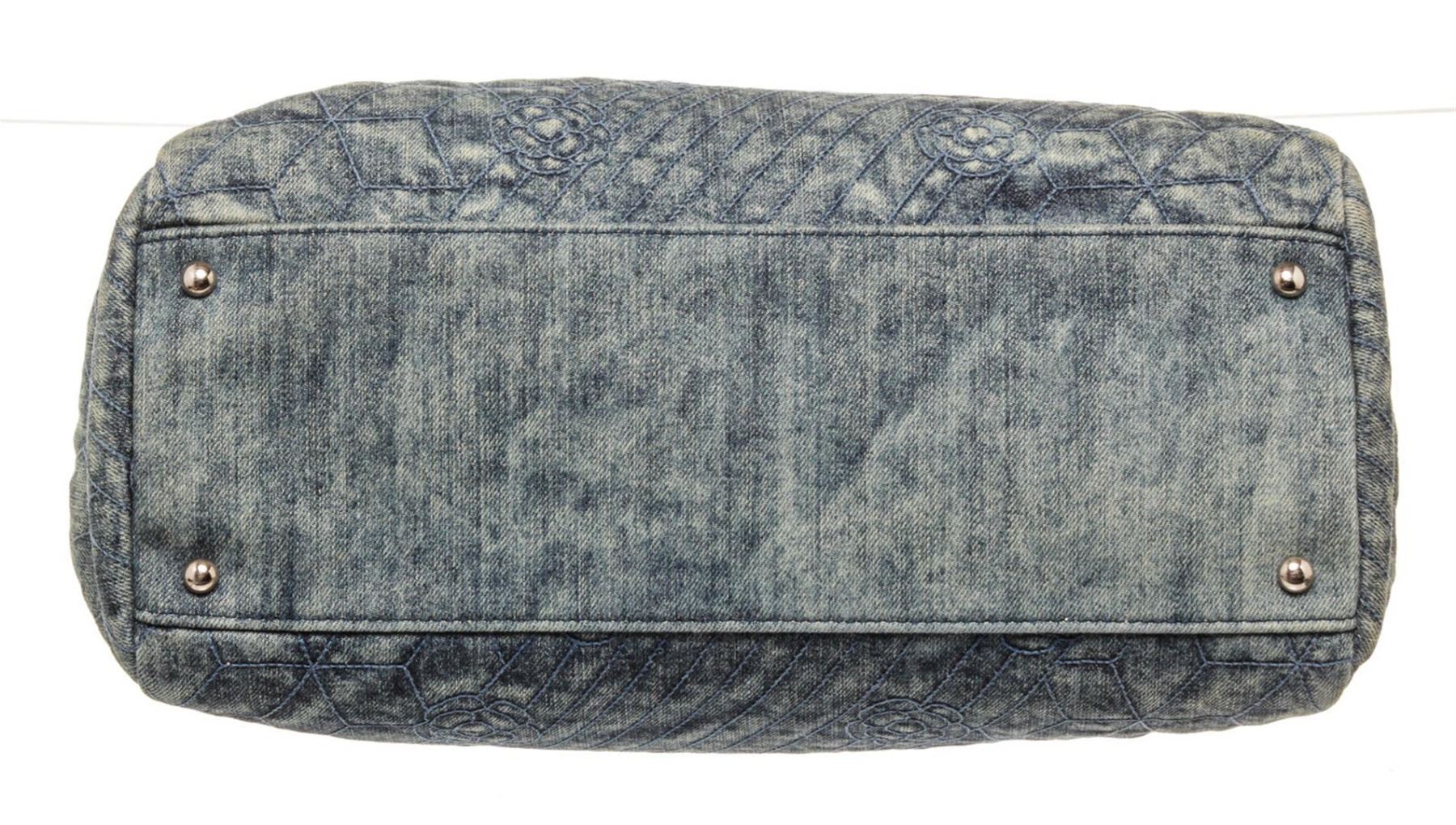 Chanel Denim Camelia Large Shoulder Bag with material fabric, silver-tone hardware, interior slip pocket, chain shoulder strap and flap closure.