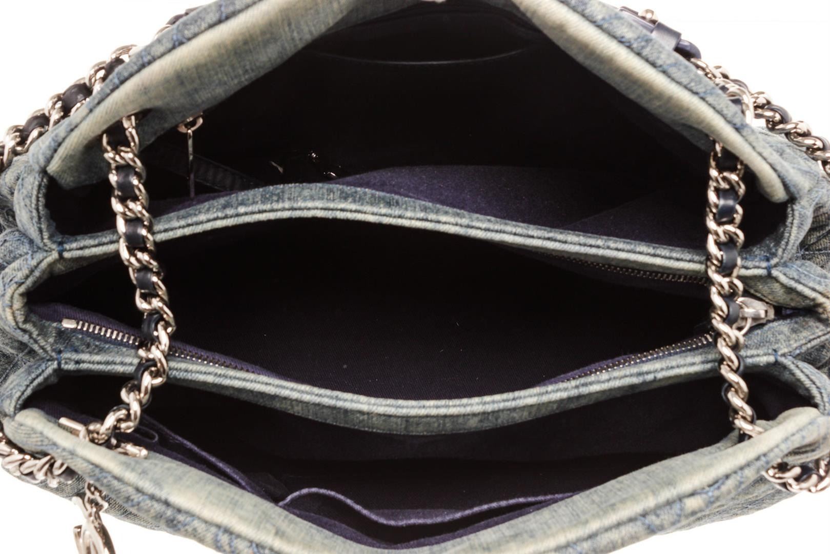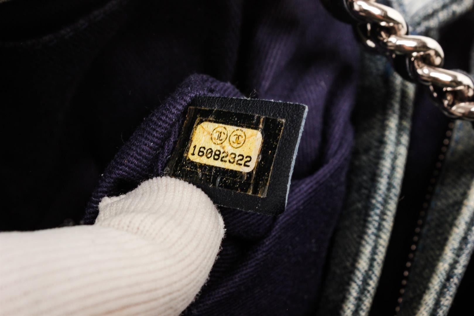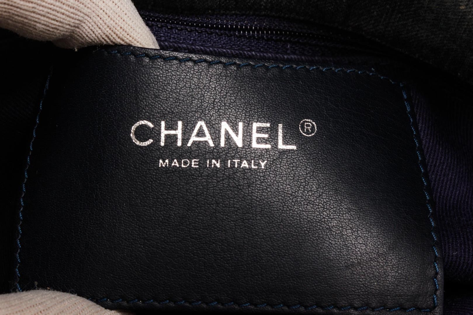 Chanel Denim Camelia Large Shoulder Bag with material fabric, silver-tone hardware, interior slip pocket, chain shoulder strap and flap closure.