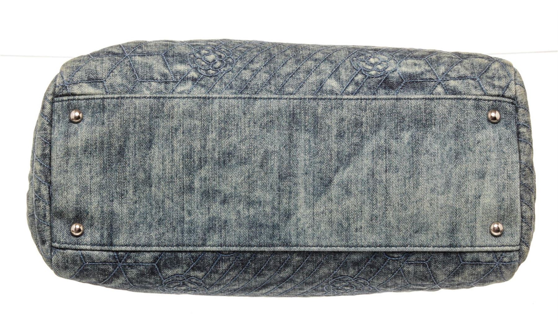 Chanel Denim Camelia Large Shoulder Bag with material fabric, silver-tone hardware, interior slip pocket, chain shoulder strap and flap closure.
