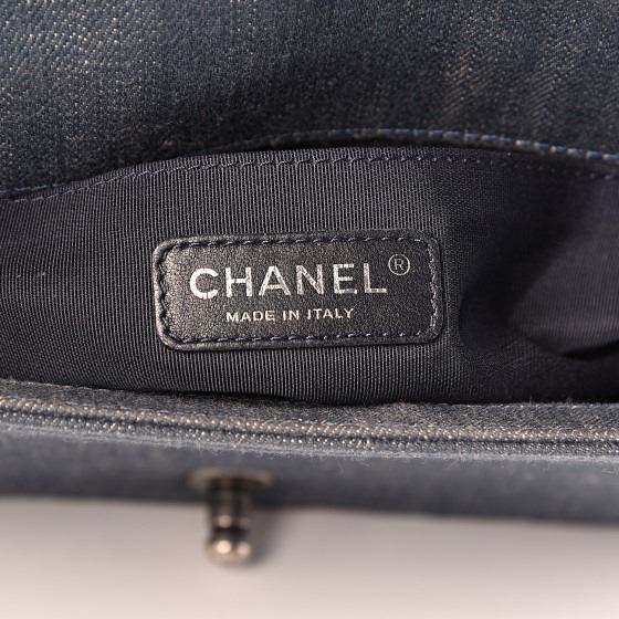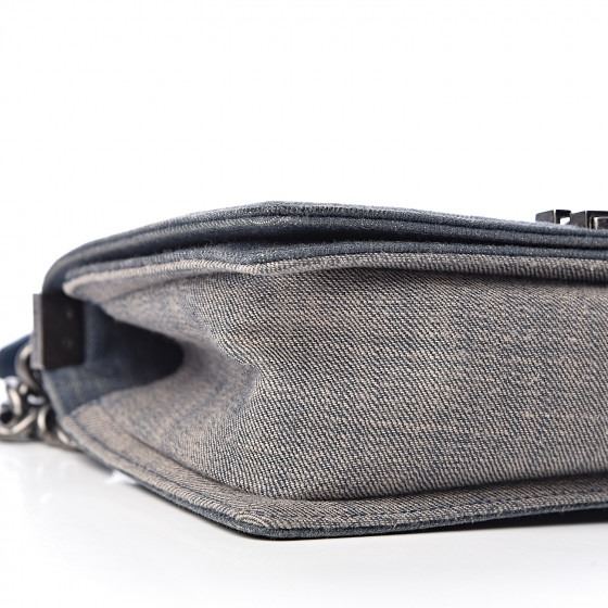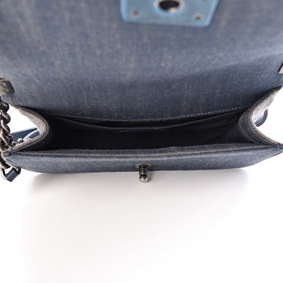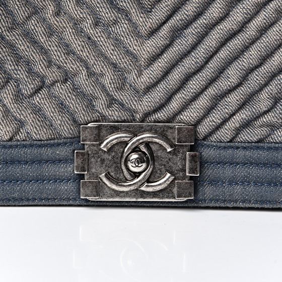Blue stylish shoulder bag features chevron quilted denim and is framed by linear quilted darker washed denim. The bag features an aged ruthenium chain link shoulder strap and matching Chanel boy CC push lock that opens the bag to a navy blue fabric interior with a patch pocket.