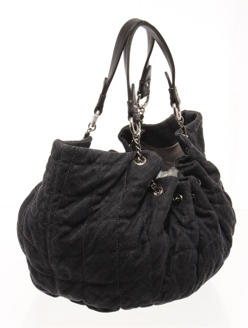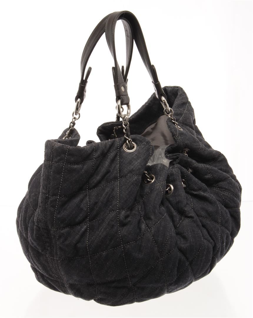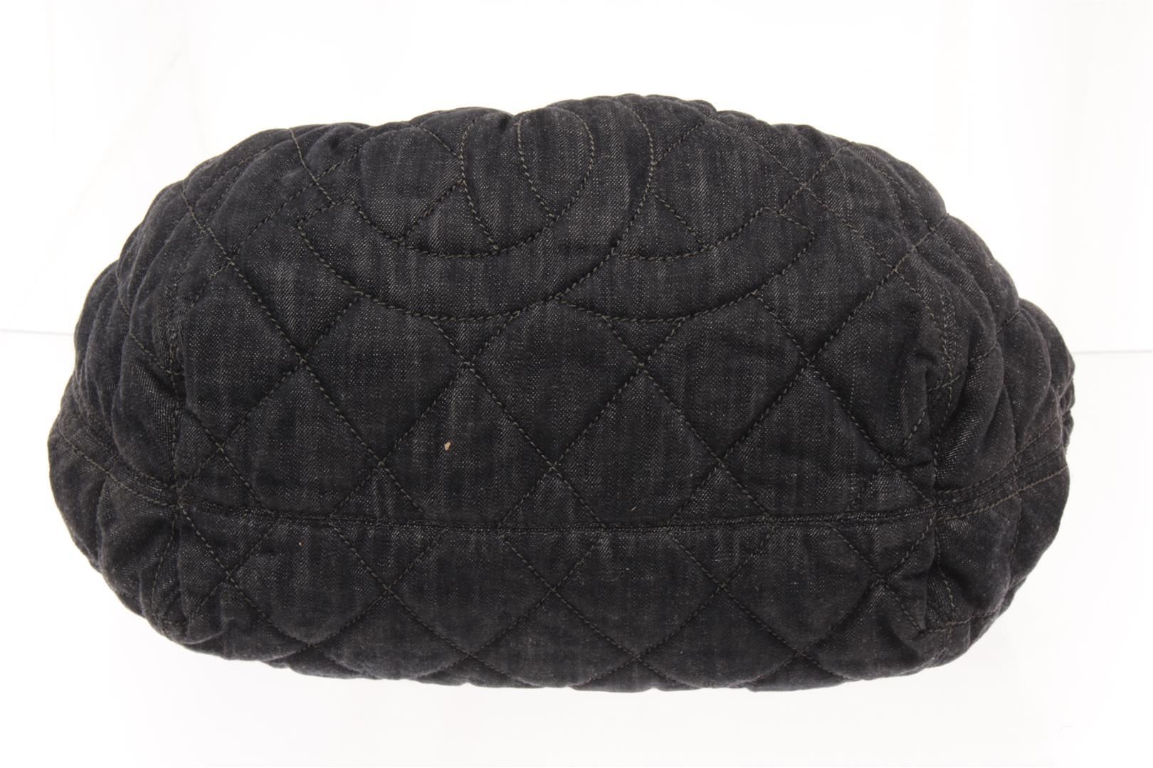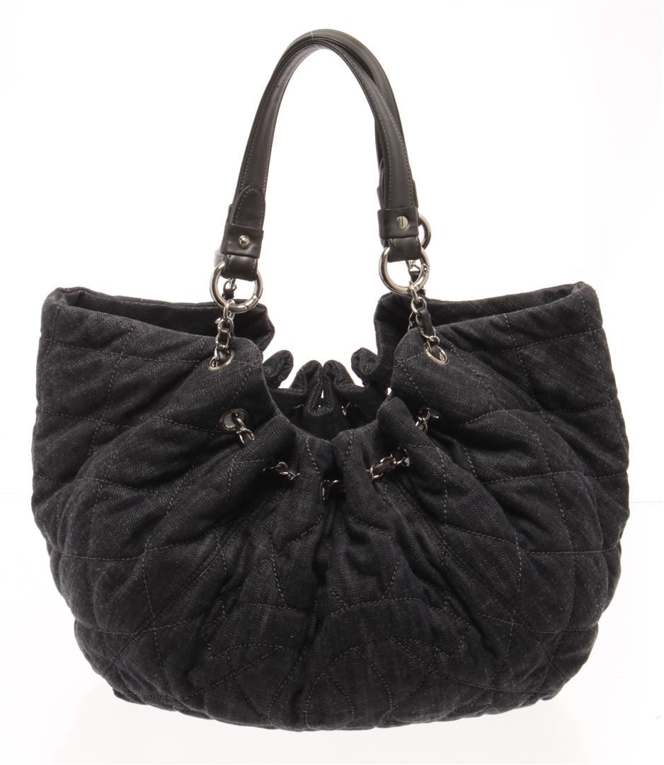One Chanel Denim Coco Cabas Chain Hobo Bag. Item is sold AS-IS. All available information is listed in the description and shown in the photo. Chanel Denim Coco Cabas Chain Hobo Bag with brushed gold-tone hardware, indigo blue, black, cotton, leather trim, dual chain-link and denim top handles, tan contrast stitching, stitched interlocking cc logo at front, tan logo jacquard lining, three pockets at interior wall; two featuring zip closure and magnetic snap closure at top. Height: 5.9 in (14.99 cm), Width: 12.59 in (31.98 cm), Length: 23.62 in (60 cm)