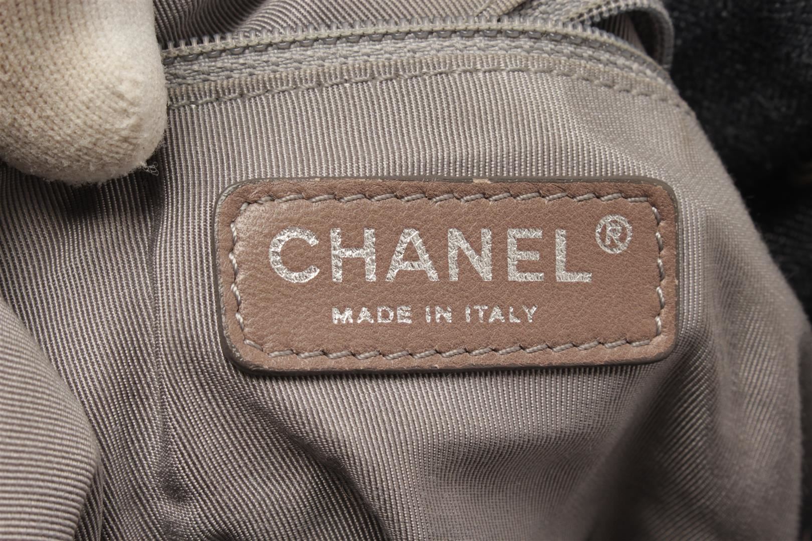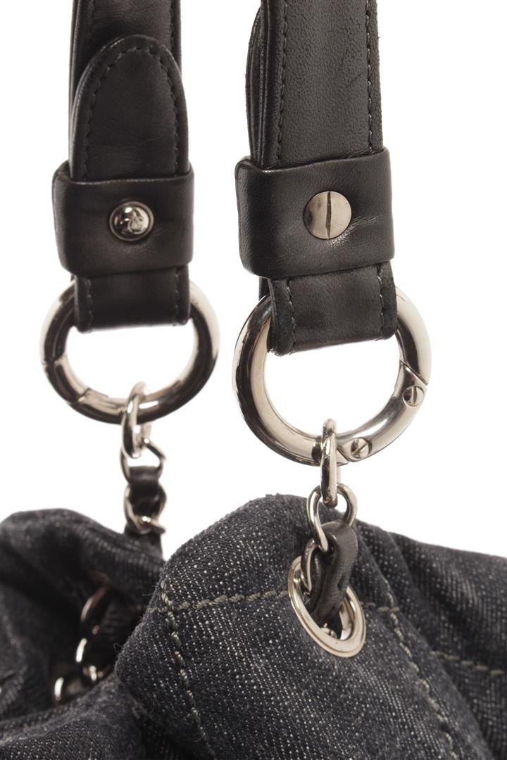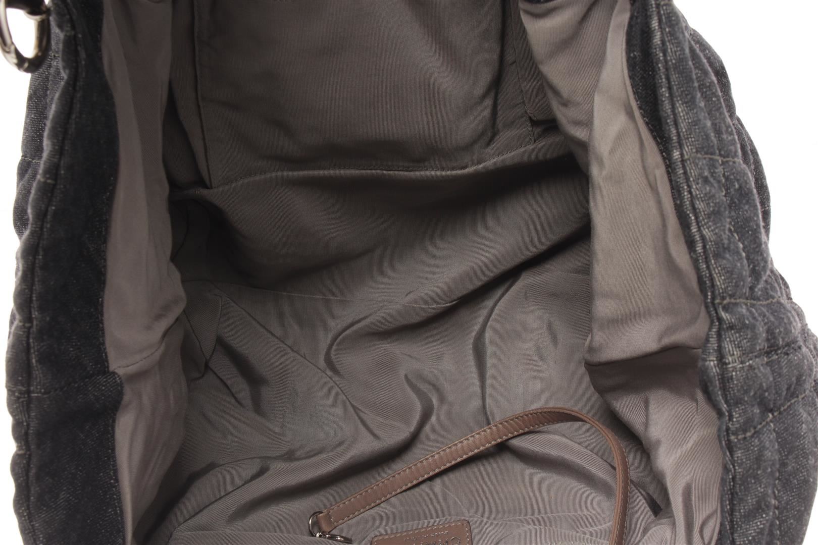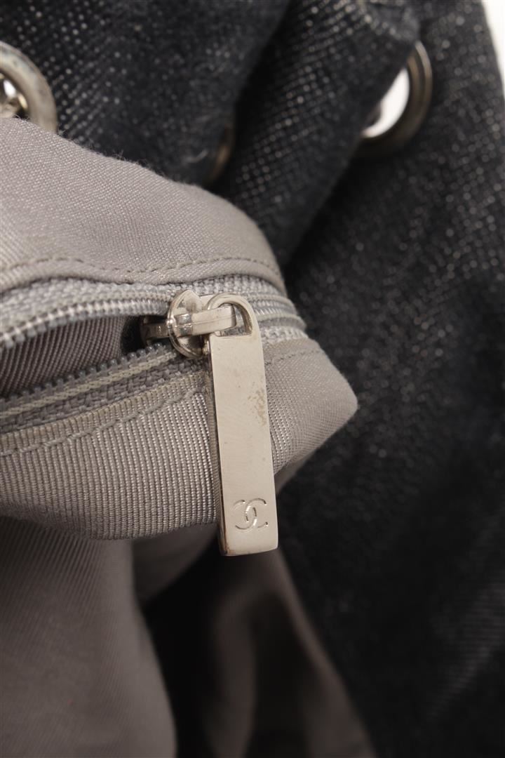 One Chanel Denim Coco Cabas Chain Hobo Bag. Item is sold AS-IS. All available information is listed in the description and shown in the photo. Chanel Denim Coco Cabas Chain Hobo Bag with brushed gold-tone hardware, indigo blue, black, cotton, leather trim, dual chain-link and denim top handles, tan contrast stitching, stitched interlocking cc logo at front, tan logo jacquard lining, three pockets at interior wall; two featuring zip closure and magnetic snap closure at top. Height: 5.9 in (14.99 cm), Width: 12.59 in (31.98 cm), Length: 23.62 in (60 cm)