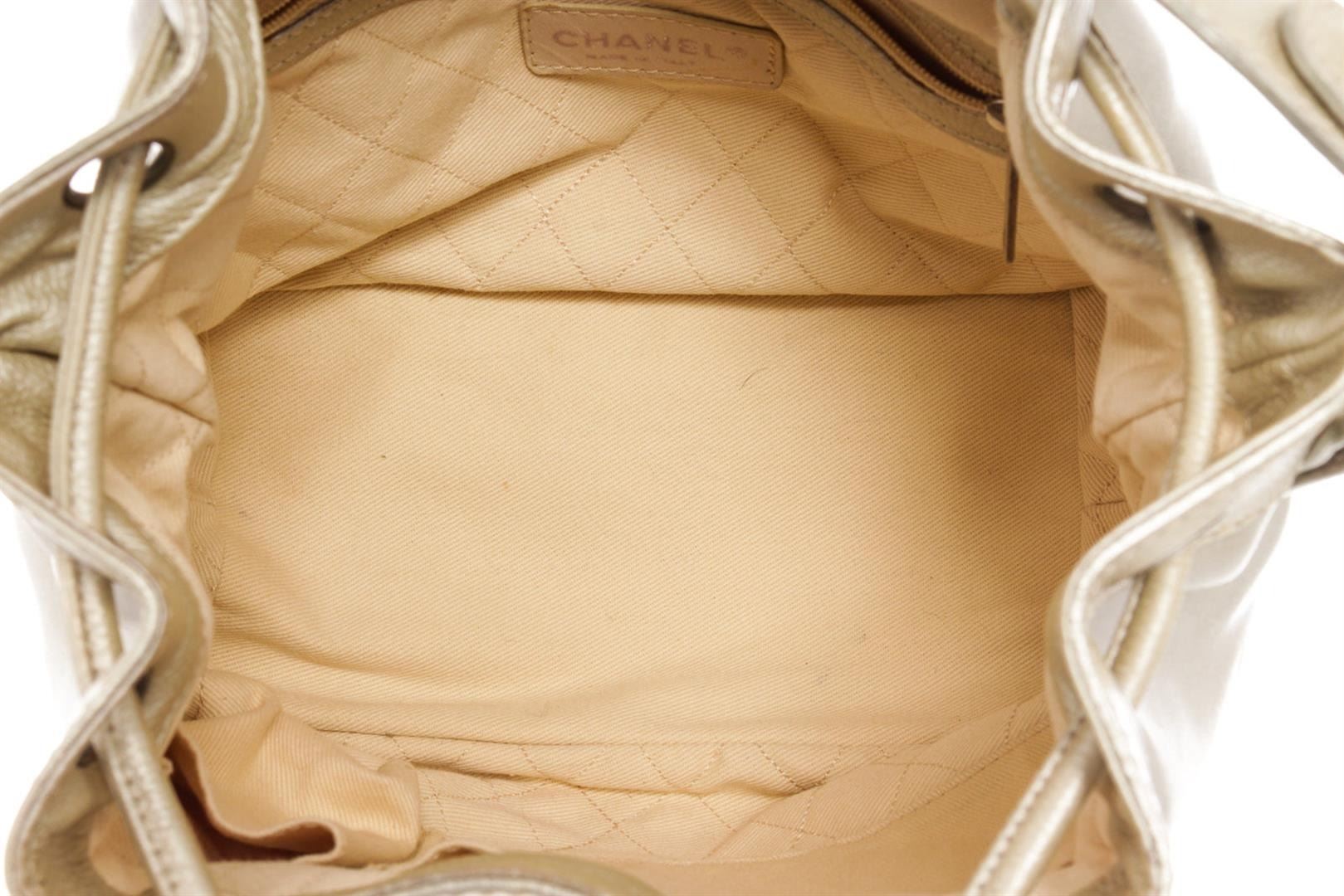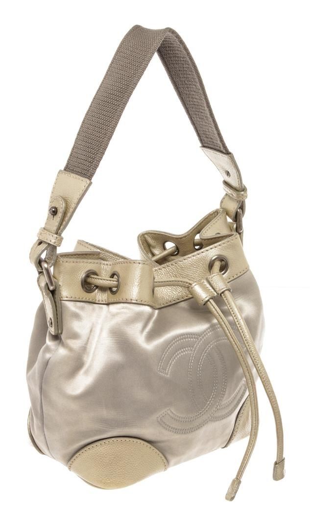 Chanel Drawsting Bucket Bag Silver Satin/Leather. Brand: Chanel, Style: Drawsting, Type: Bucket Bag, Exterior Color: Silver, Exterior Material: Satin/Leather, Exterior Pockets: None, Interior Color: Cream, Interior Material: Fabric, Interior Pockets: One Zip/ Two Slip, Closure: Drawstring, Handle/Strap Type: Shoulder Strap, Length: 9, Width: 5.5, Height: 7.75, Strap Drop: 14. Item is sold AS-IS and all information pertaining to this lot is available in the photos or this description.