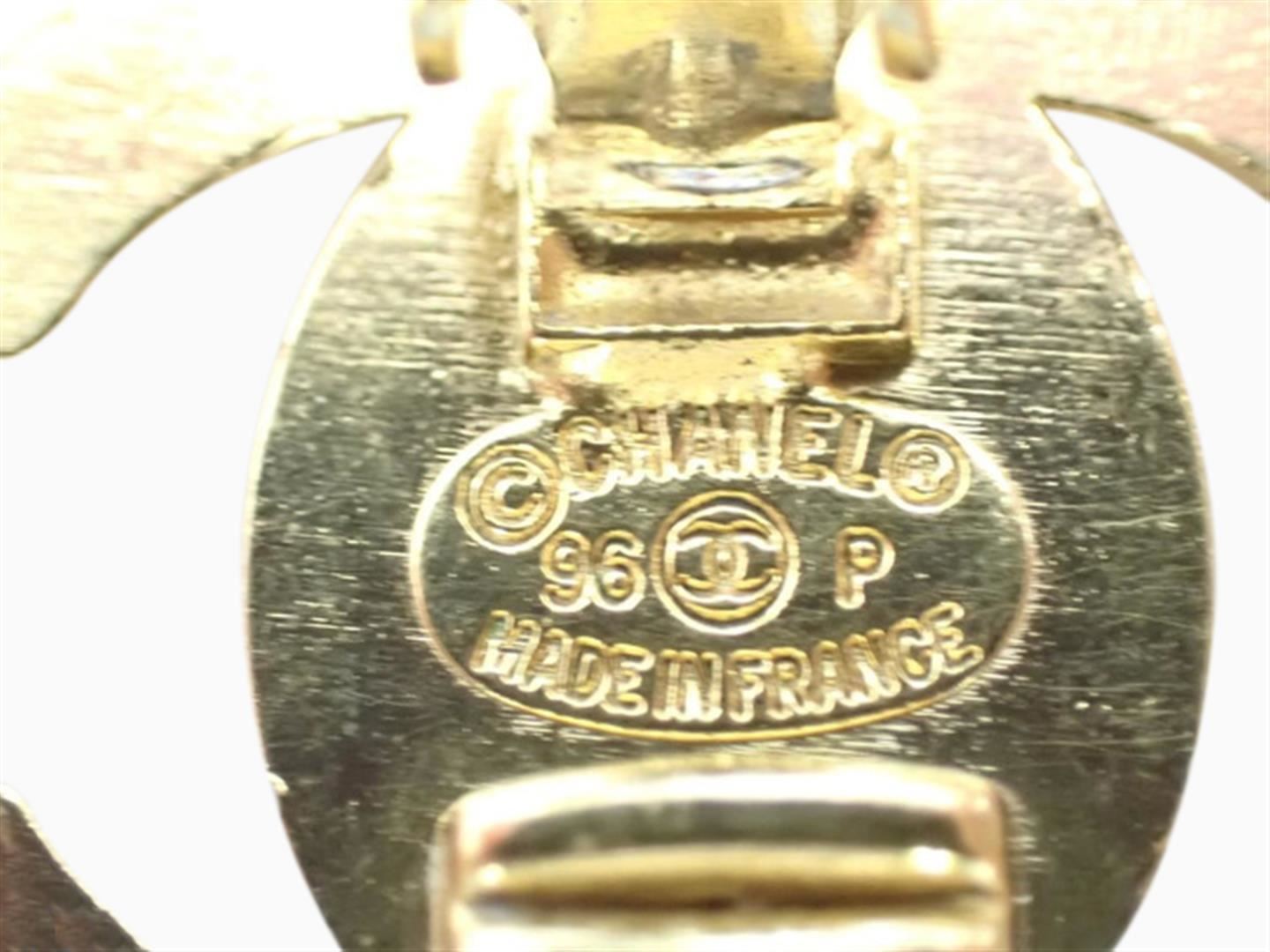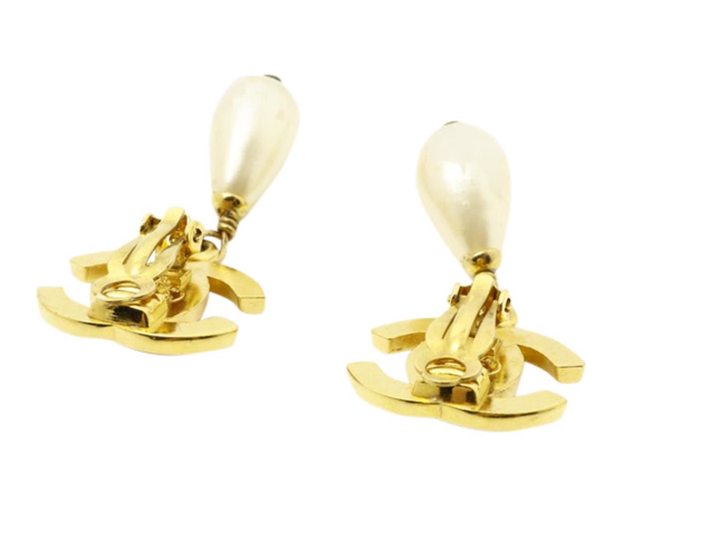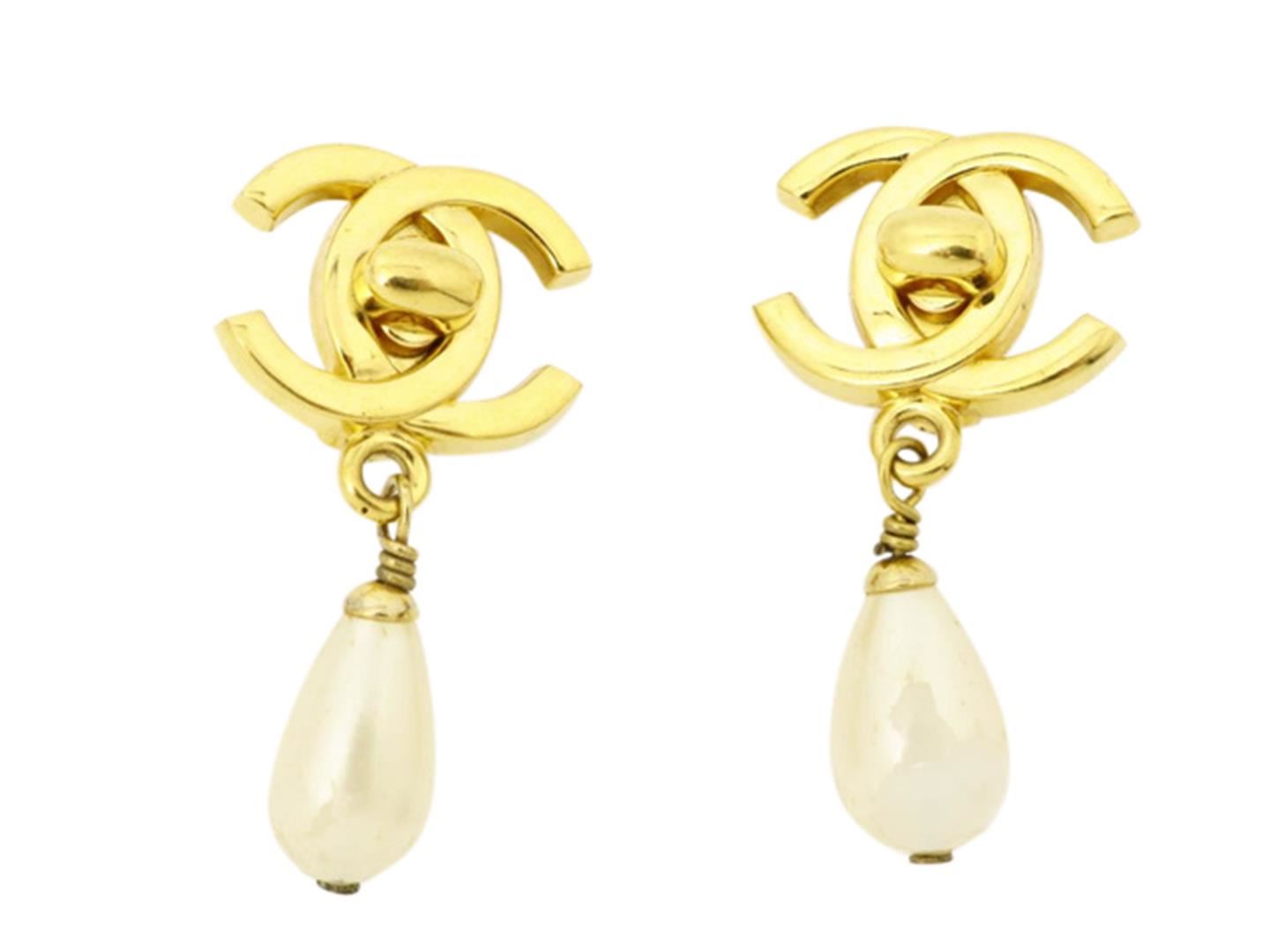 One Chanel Earrings. Item is sold AS-IS. All available information is listed in the description and shown in the photo. Interlocking CC turn-lock Chanel Earrings. Crafted from polished gold-plated brass, with a faux-pearl embellishment.