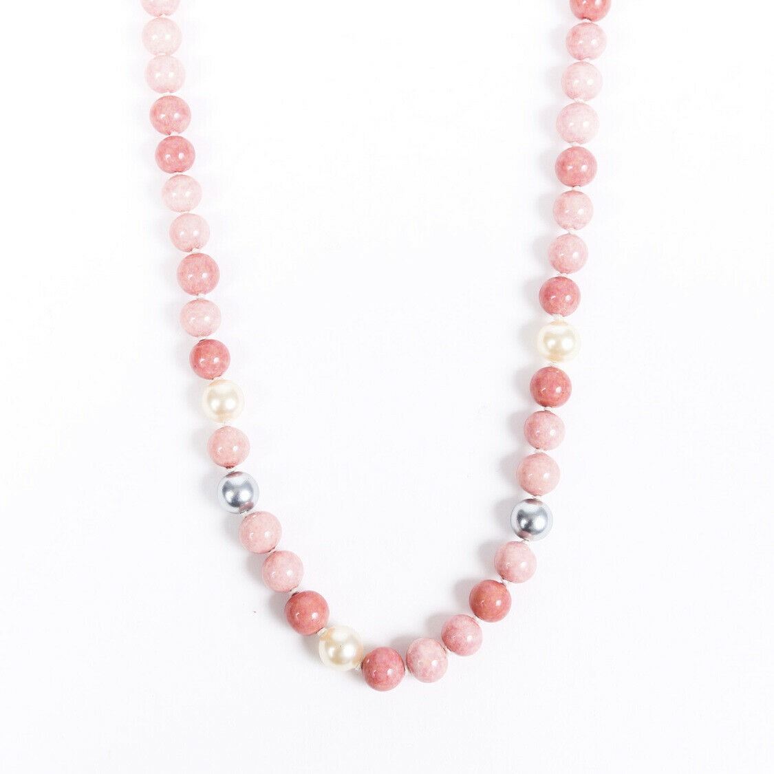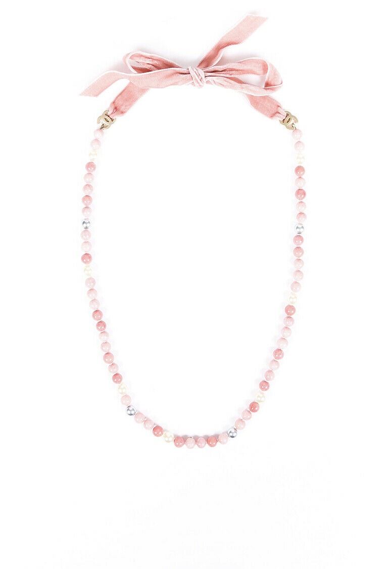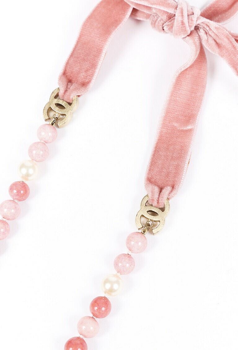 Circa Spring 2003. Chanel beaded necklace features faux pearls, CC logo accents, and a velvet ribbon tie fastening.