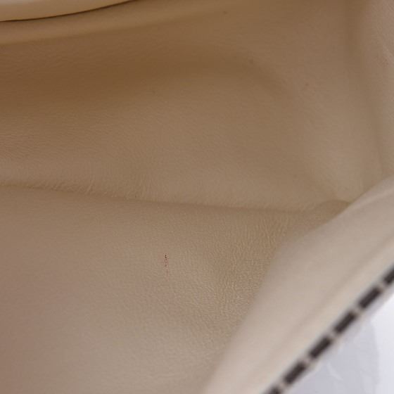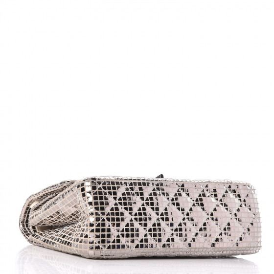 Silver structured shoulder bag is crafted of luxurious diamond quilted suede, adorned with sturdy hand painted calfskin tiles in metallic silver. There are tightly linked dark silver bijoux chain link shoulder straps. The facing flap has a squared dark silver Mademoiselle turn lock that opens to a leather interior and patch pockets.