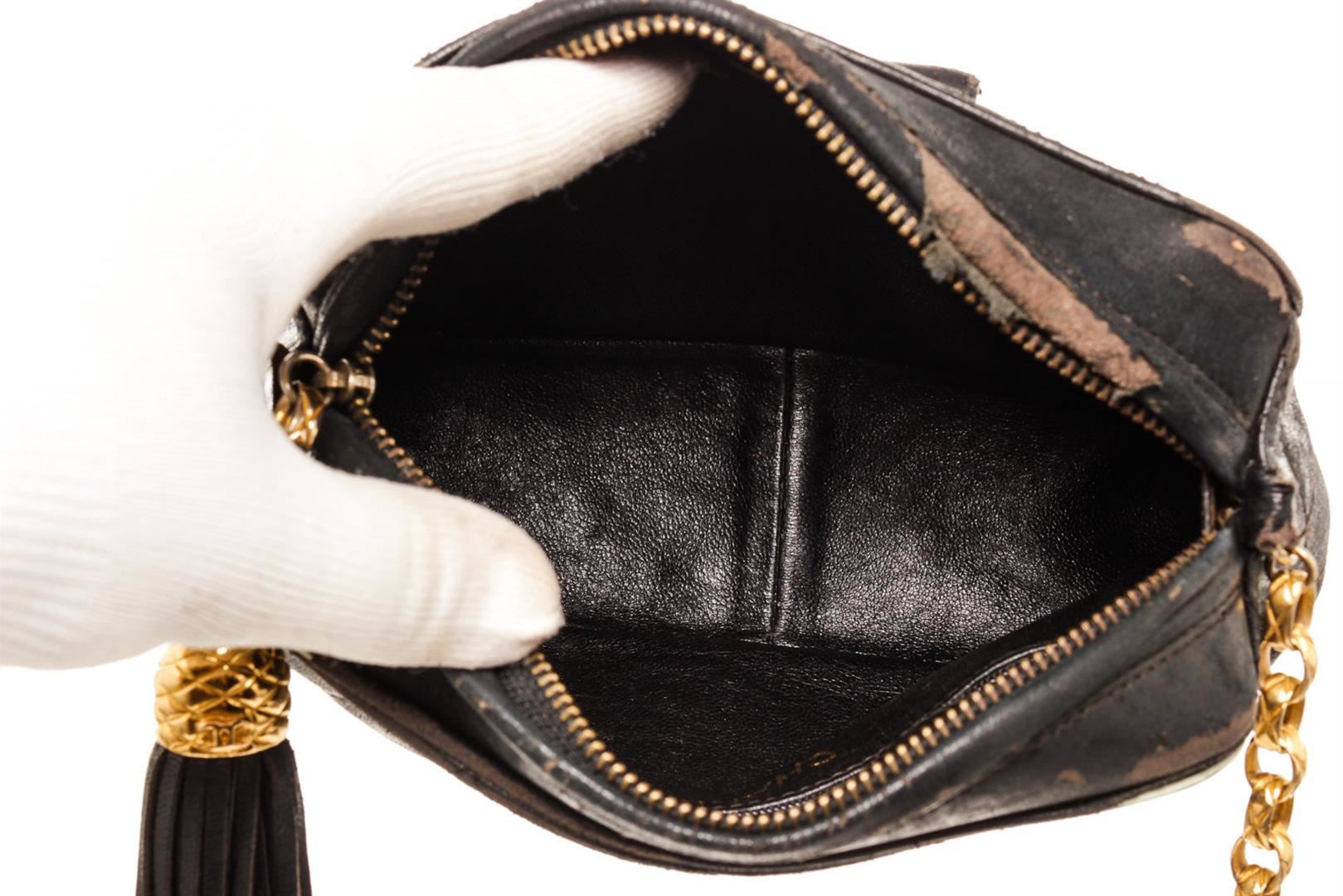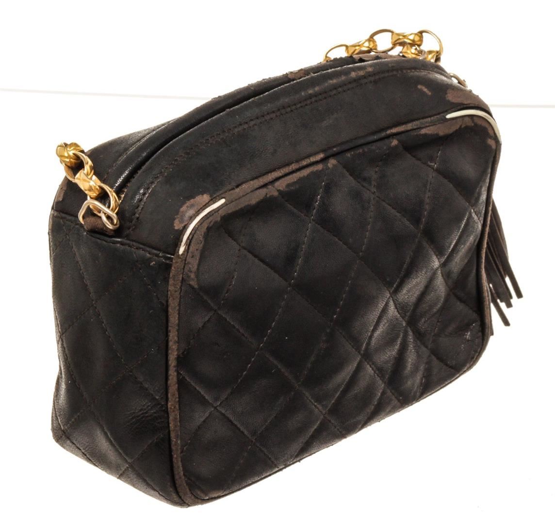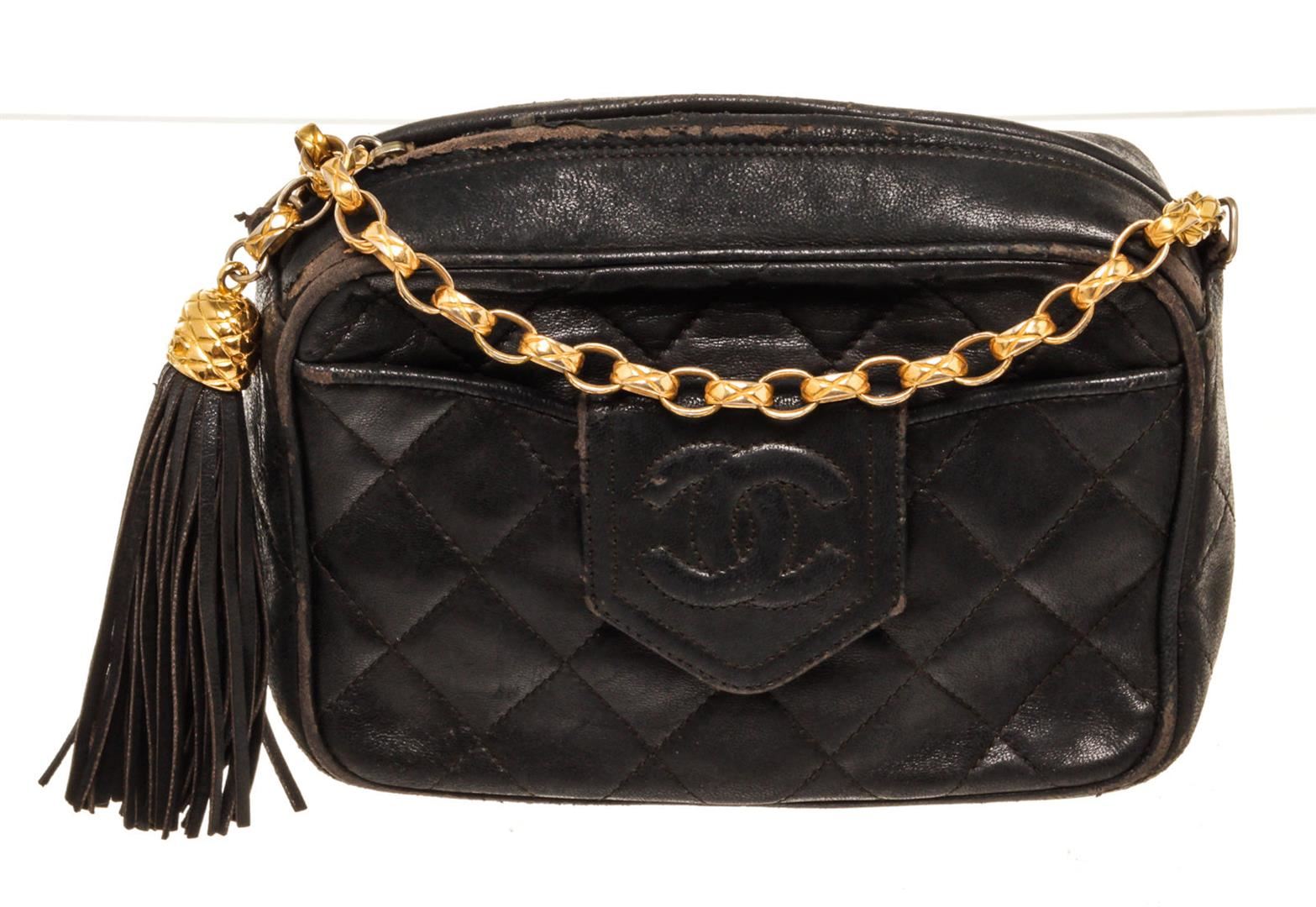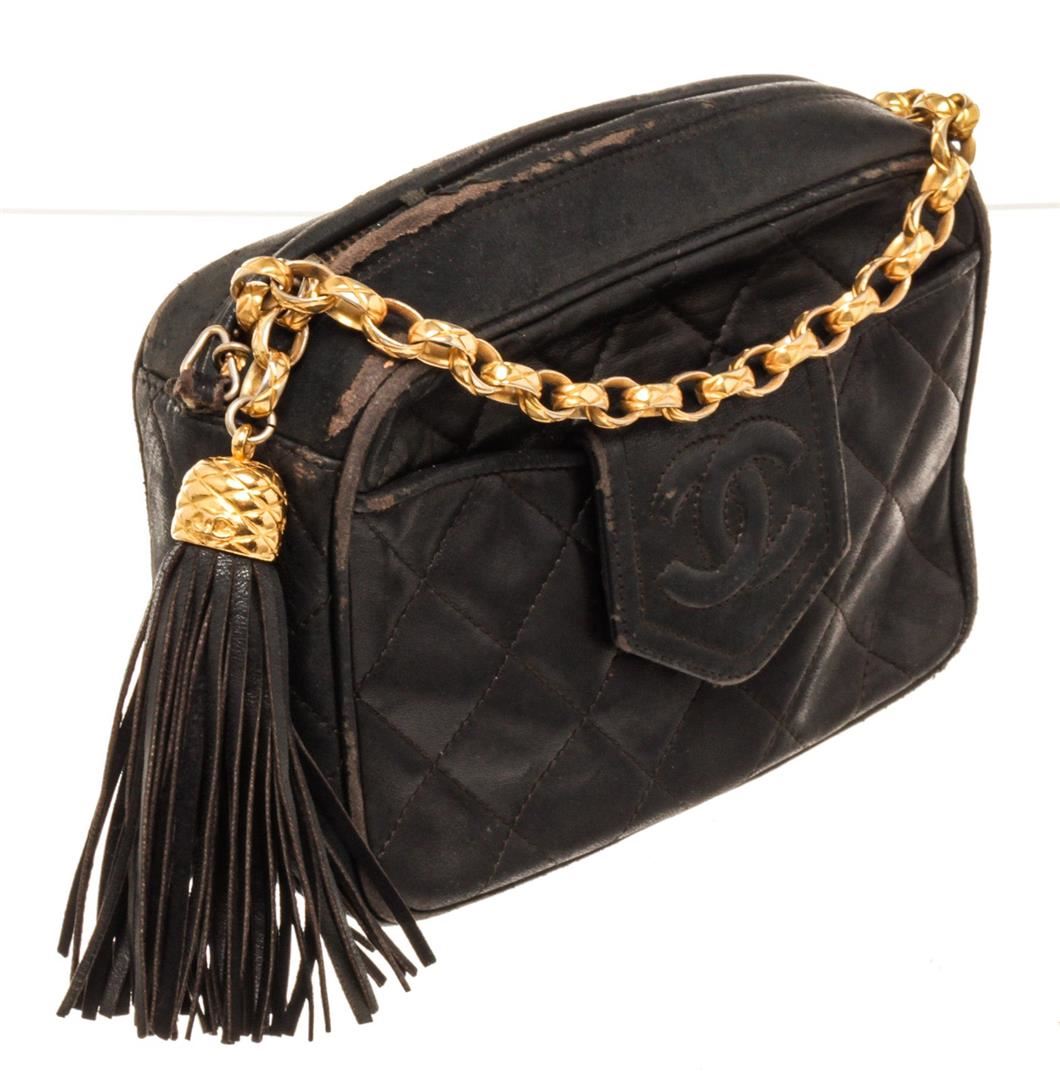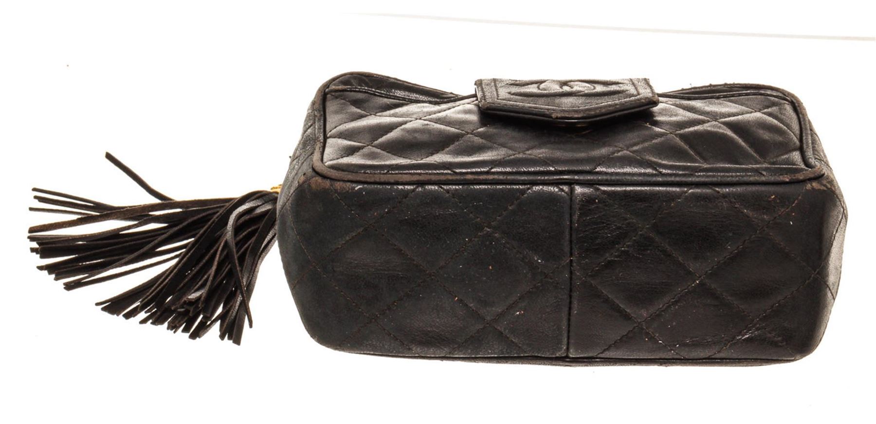 Chanel Fringe Camera Bag Shoulder Bag. Brand: Chanel, Style: Fringe Camera Bag, Type: Shoulder Bag, Exterior color: Black, Exterior material: Lambskin, Interior color: Black, Interior material: Leather, Length: 9, Width: 2.5, Height: 7. Item is sold AS-IS