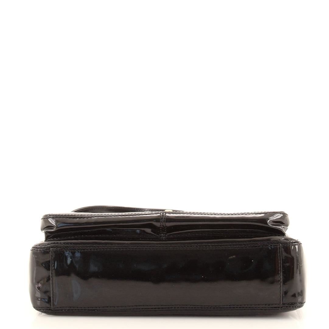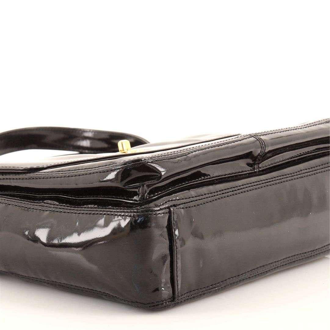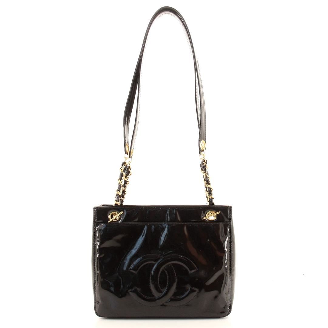 Chanel Front Pocket Chain Tote Tote. Brand: Chanel, Style: Front Pocket Chain Tote, Type: Tote, Exterior color: Black, Exterior material: Patent Leather, Interior color: Black, Interior material: Fabric, Length: 10.5, Width: 2.5, Height: 8.5. Item is sold