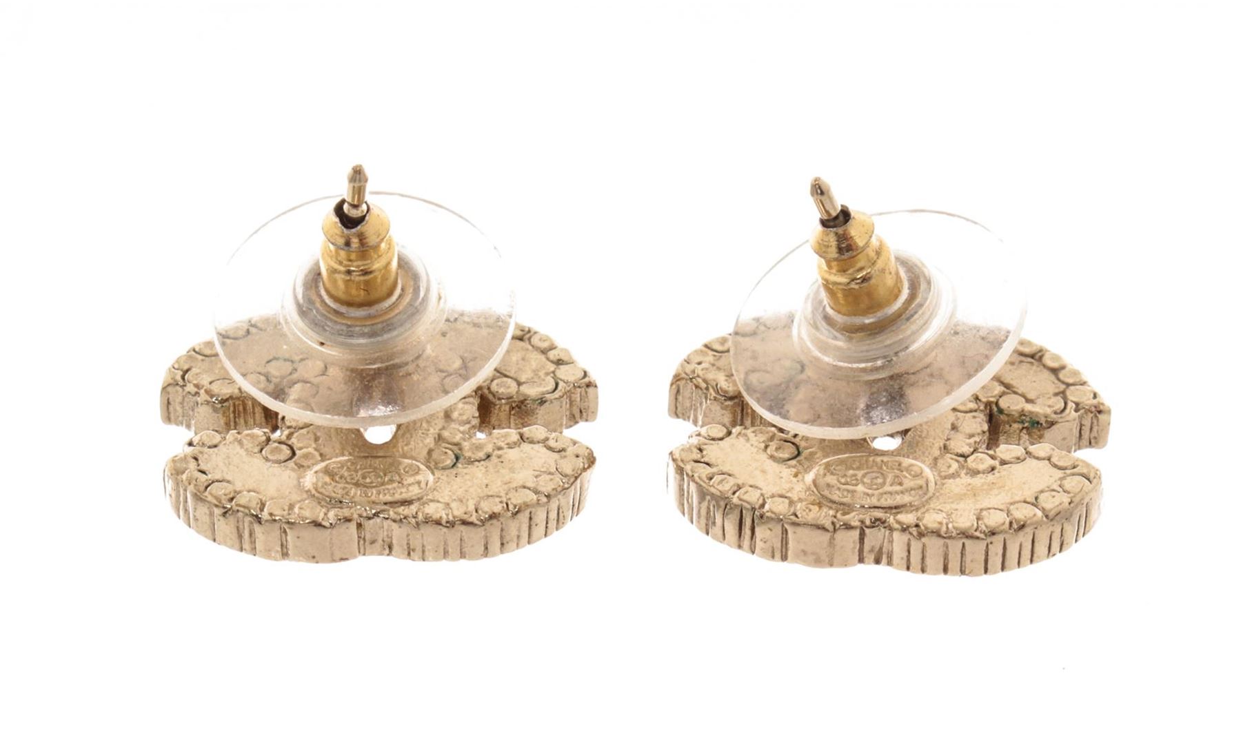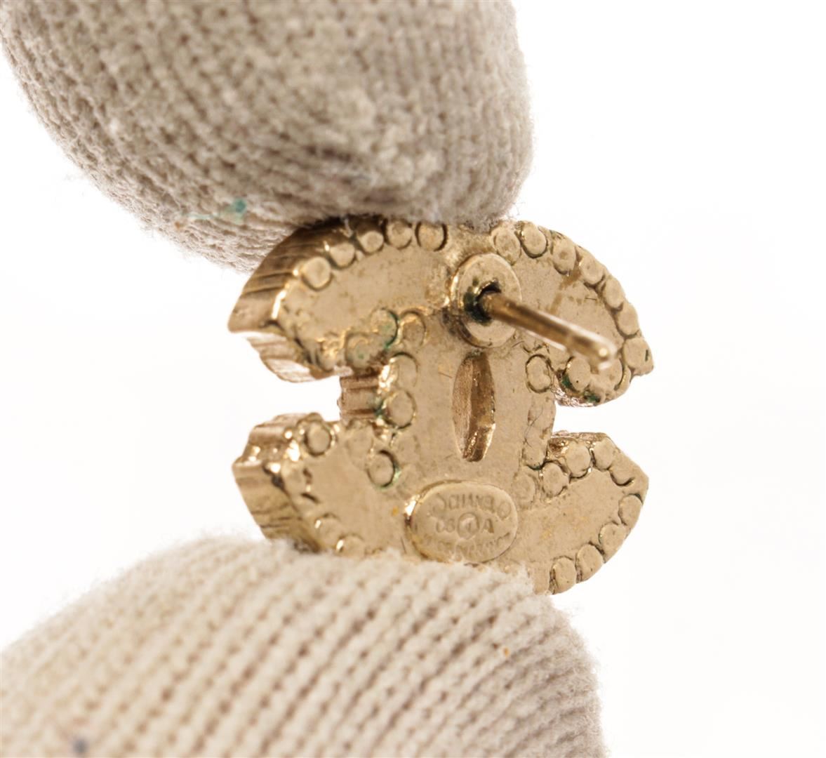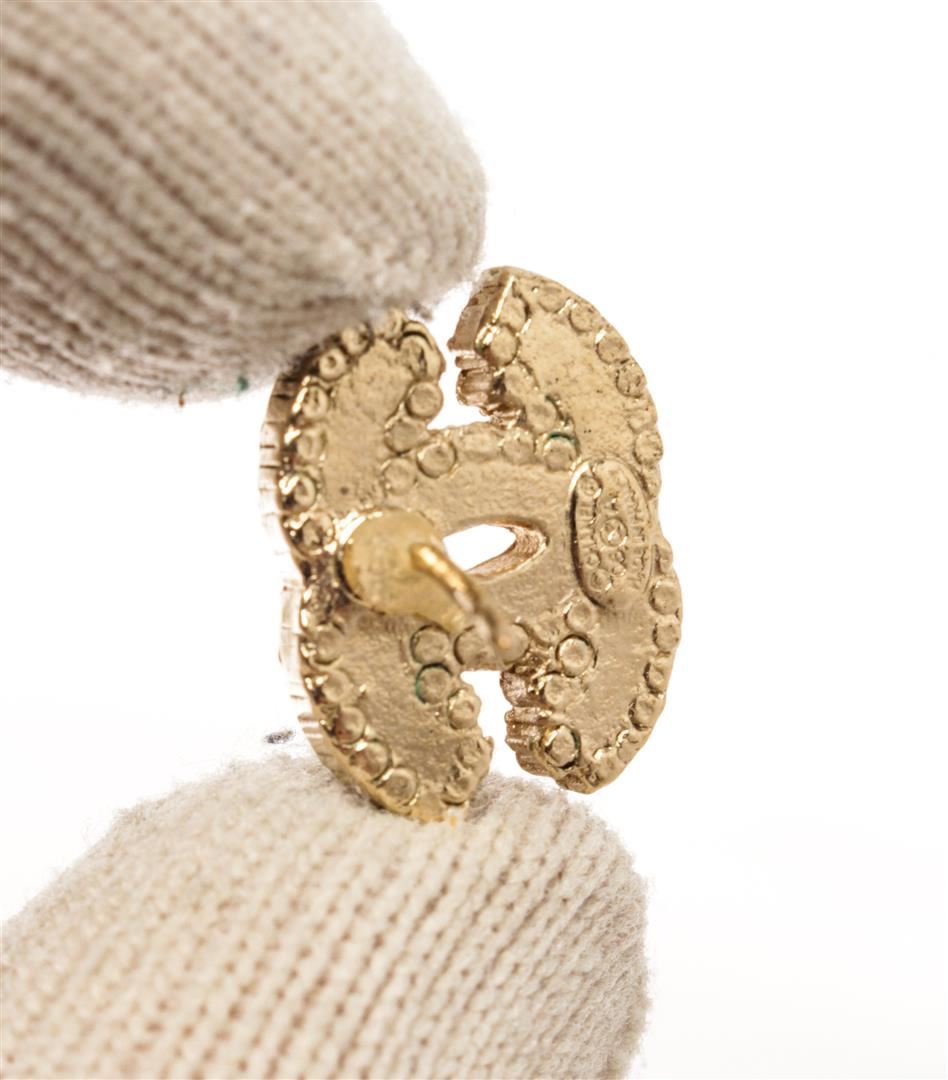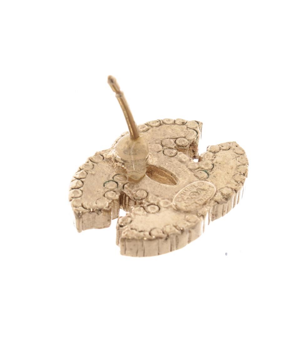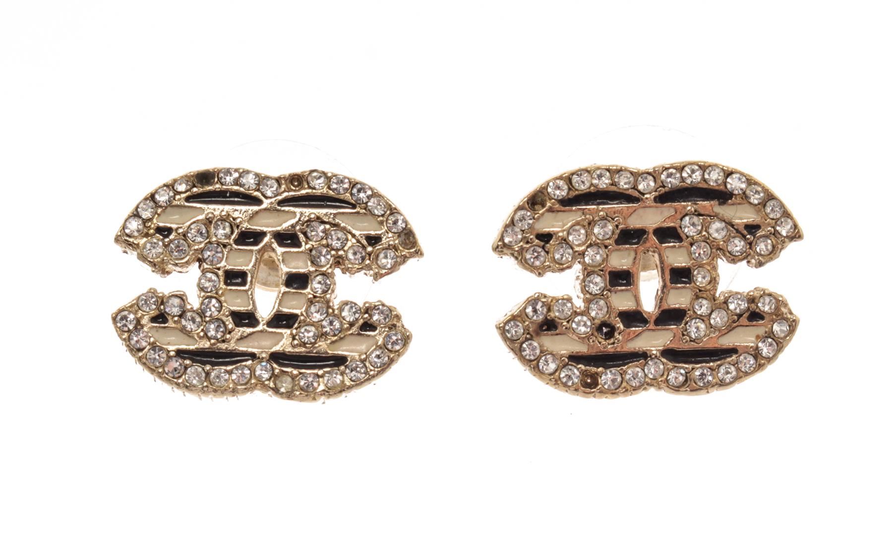 Chanel Gold Black Rhinestone CC Earrings. All available information is listed in the description and shown in the photos. Chanel Gold Black Rhinestone CC Earrings with signature cc logo, stripe earrings with white rhinestones, gold-tone hardware, secure stud closure on back.