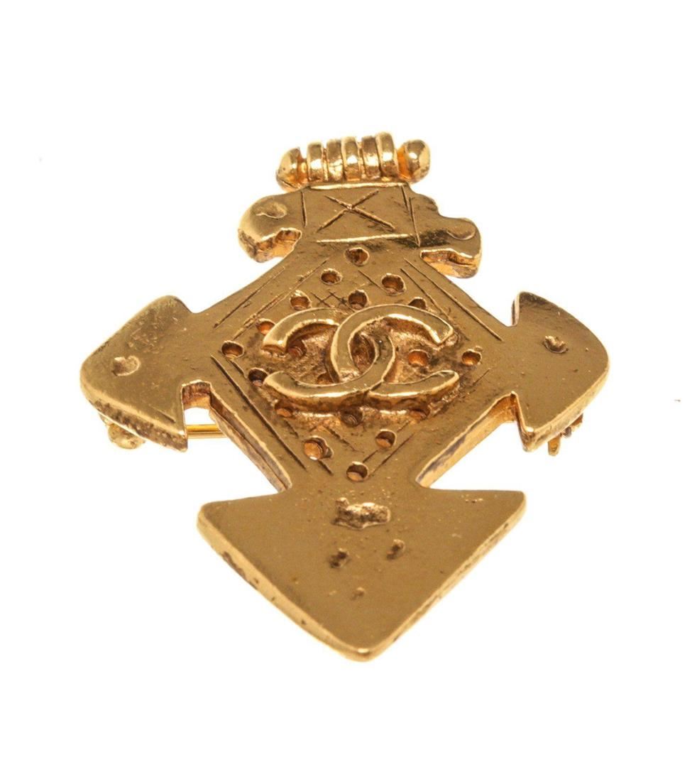Chanel Gold CC Cross Brooch with glod-tone hardware and CC turn-lock closure.