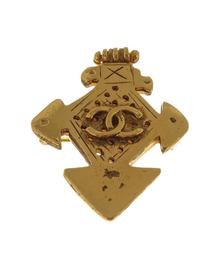 Chanel Gold CC Cross Brooch. All available information is listed in the description and shown in the photos. Chanel Gold CC Cross Brooch with gold tone metal hardware.