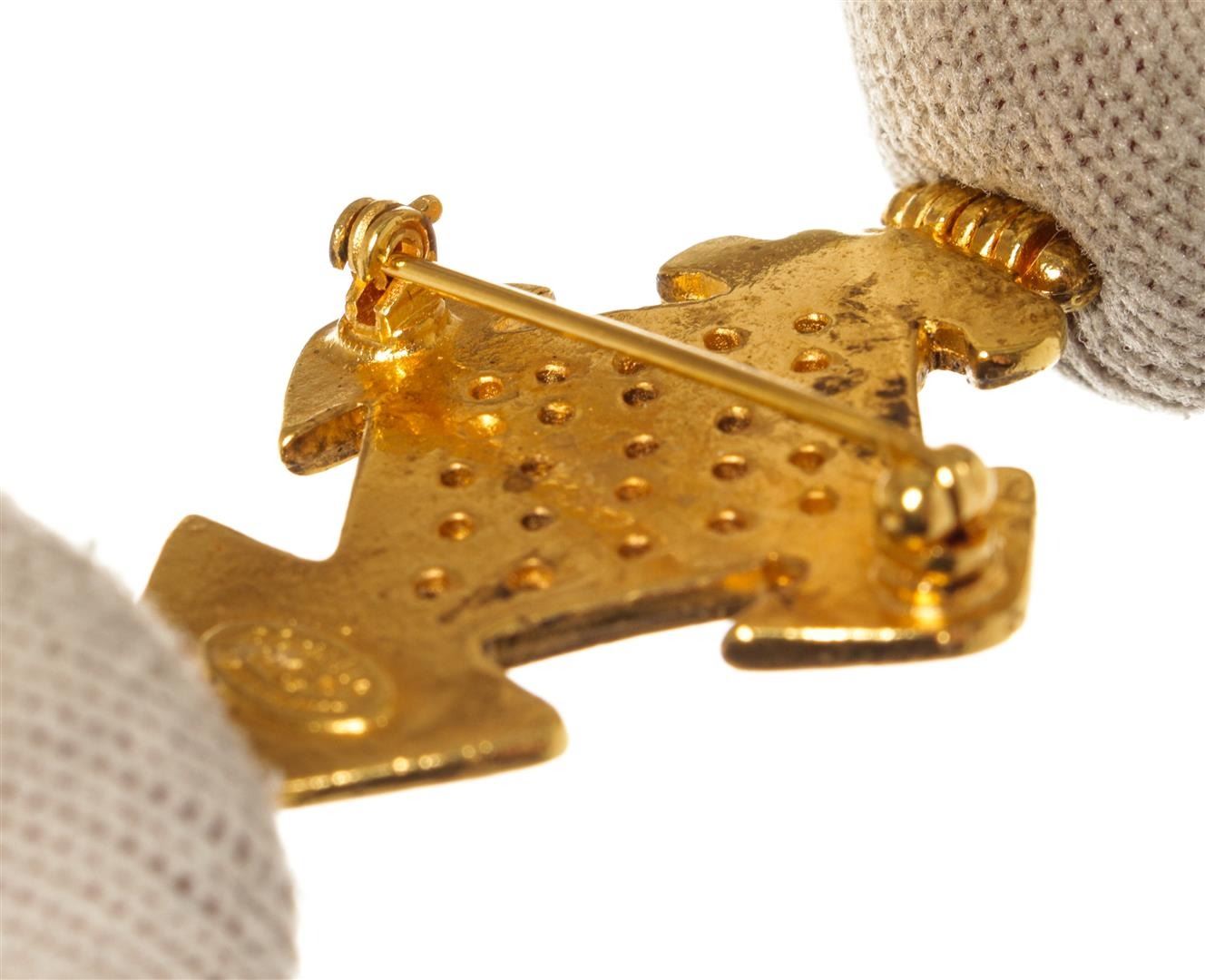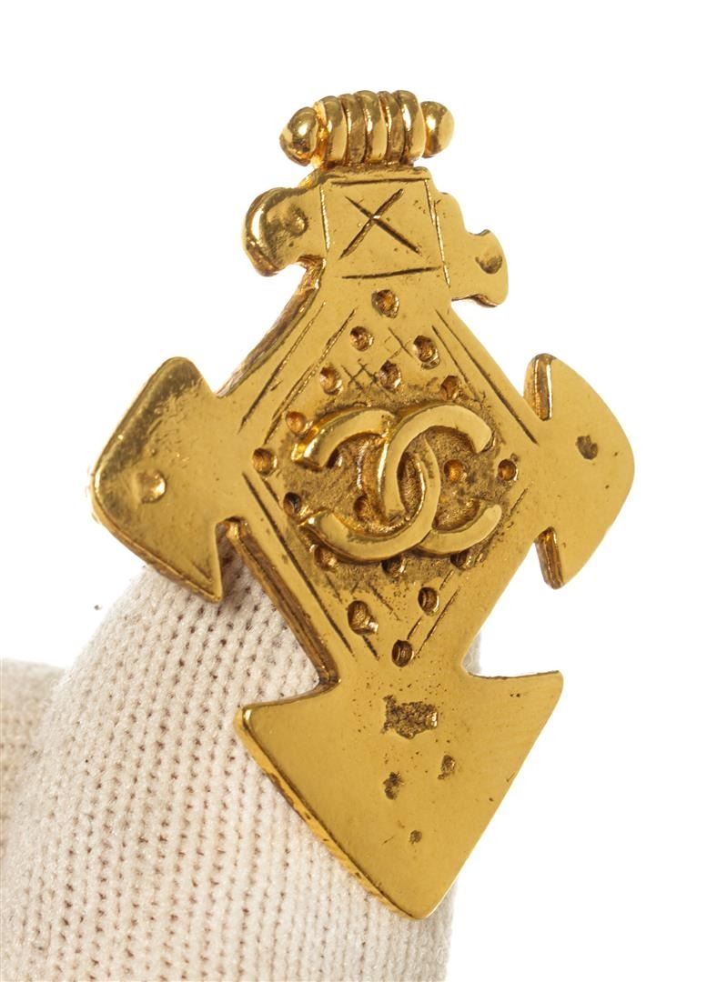 Chanel Gold CC Cross Brooch. All available information is listed in the description and shown in the photos. Chanel Gold CC Cross Brooch with gold tone metal hardware.