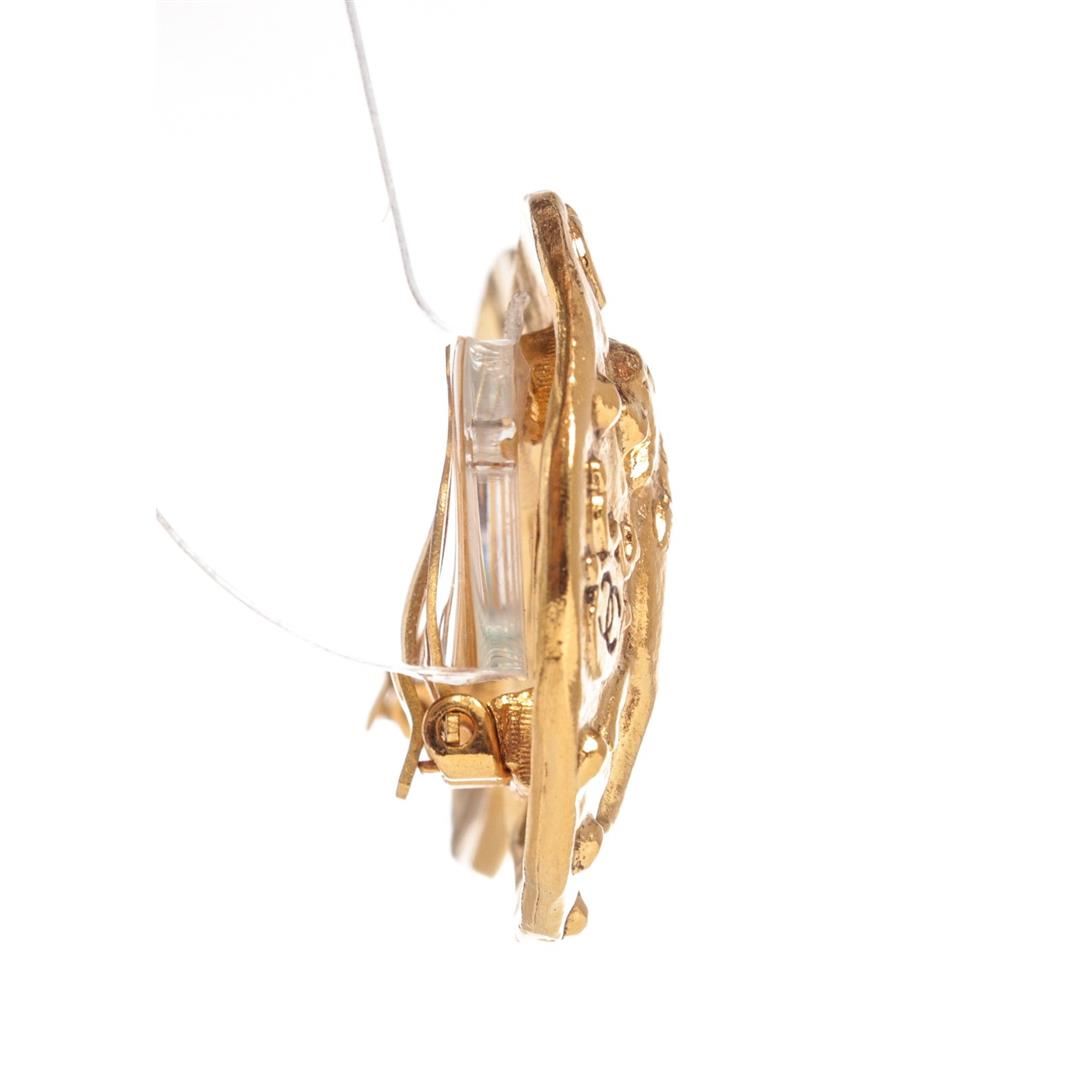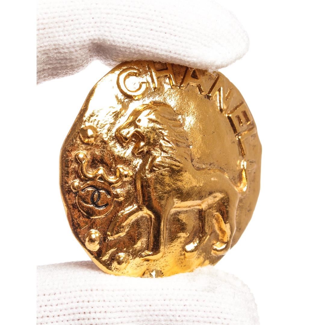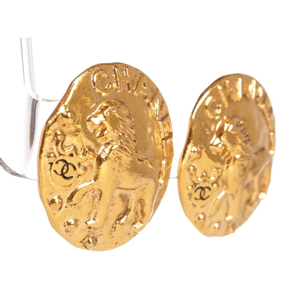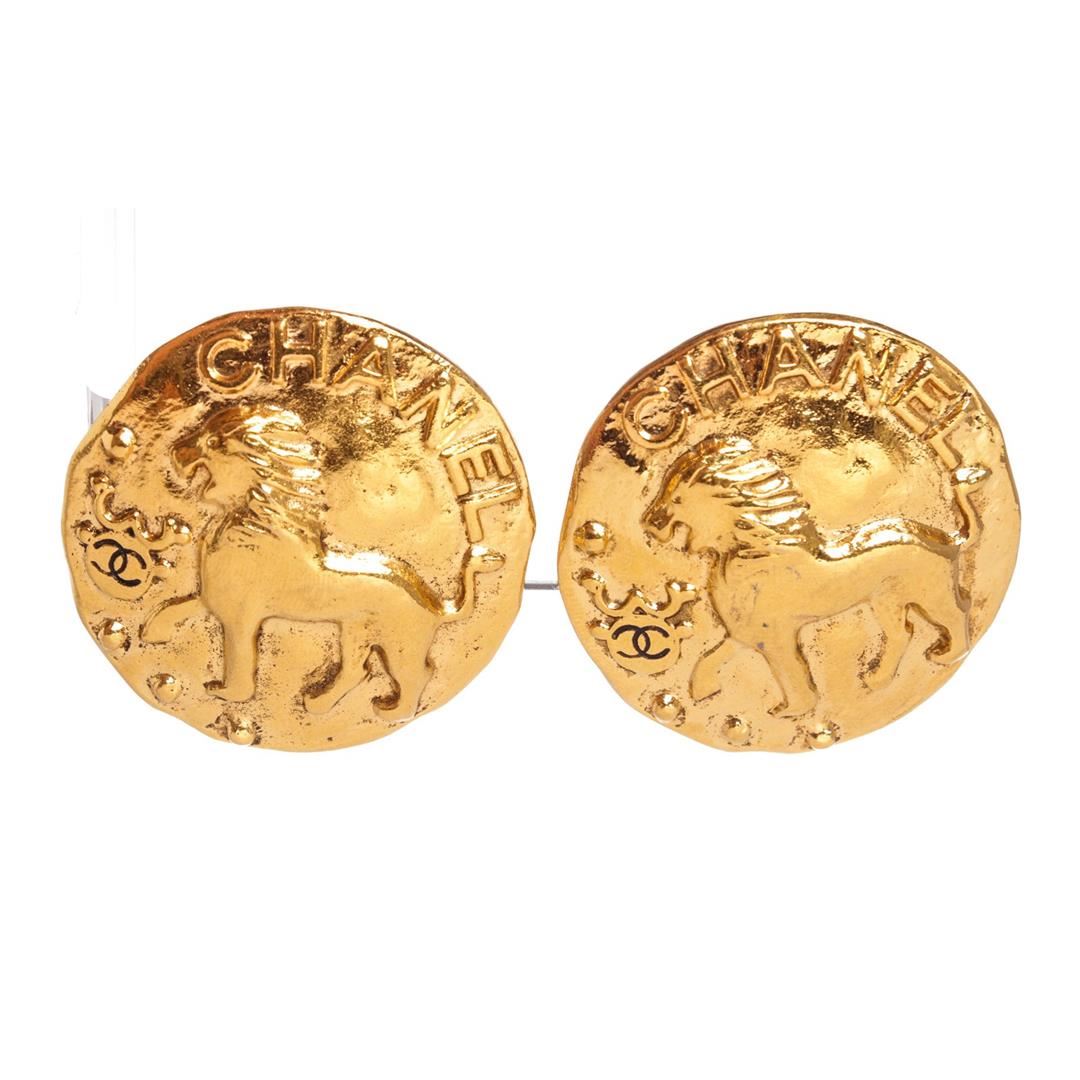 Chanel Gold CC Lion Large Disc Clip On Earrings. Clip On Backing. Dimensions = Length: 1.25"/3.1cm Height: 1.25"/3.1cm . Item is pre-owned.