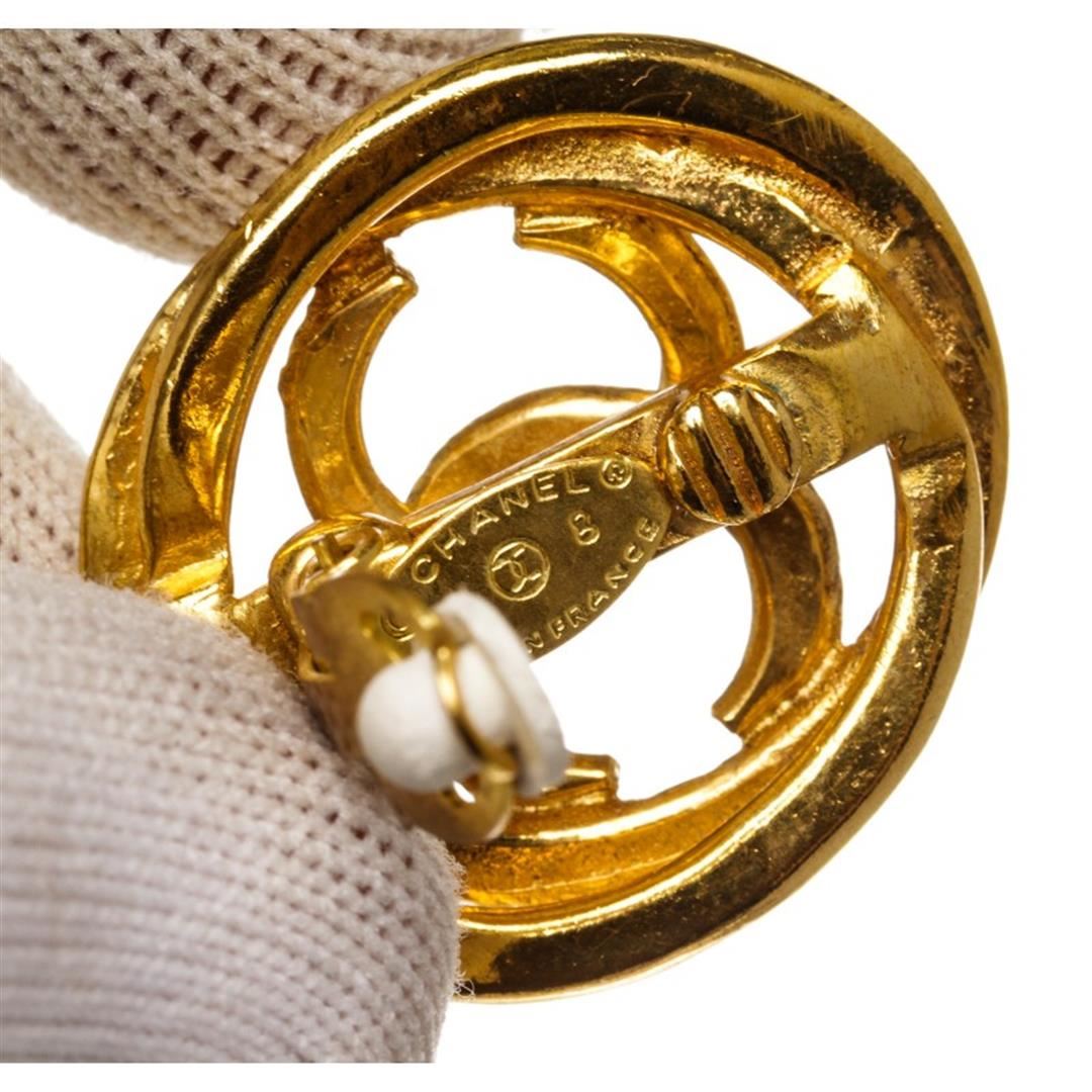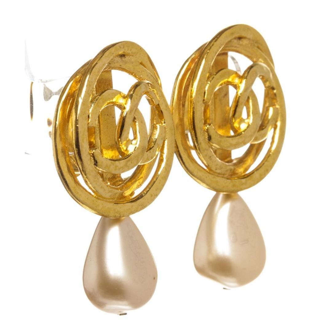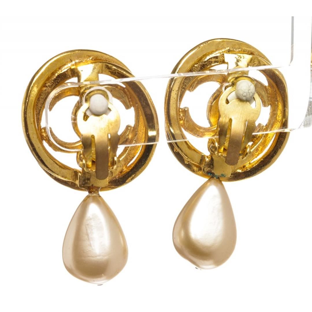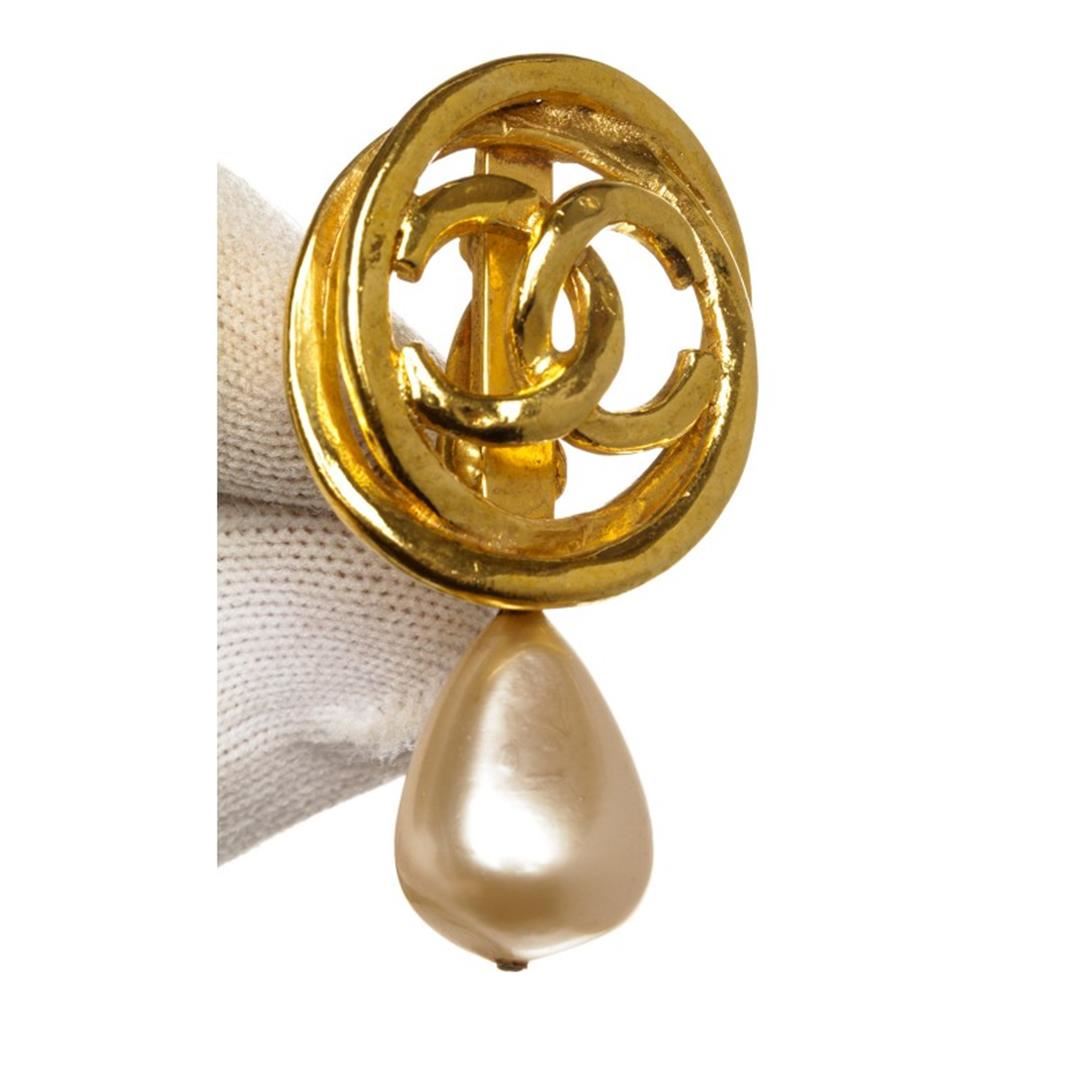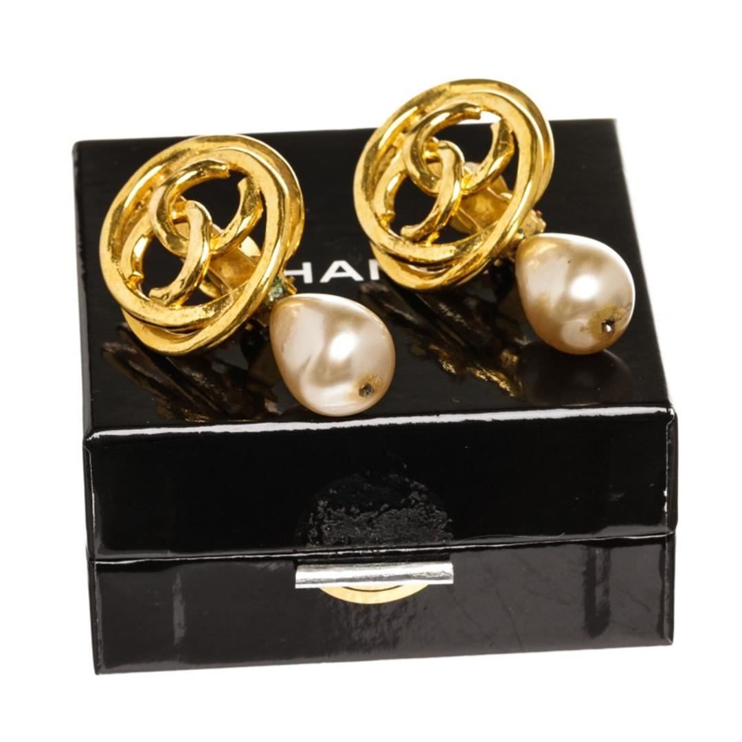 One pair of Chanel Gold CC Logo Faux Pearl Drop Clip On Earrings. Clip On Backing. Box included.