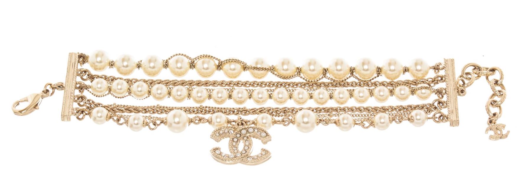 Chanel Gold CC Pearl Bracelet. All available information is listed in the description and shown in the photos. Chanel Gold CC Pearl Bracelet with gold-tone hardware and faux pearls, signature interlocking cc logo, adjustable fit, pearl detailing, lobster claw fastening.