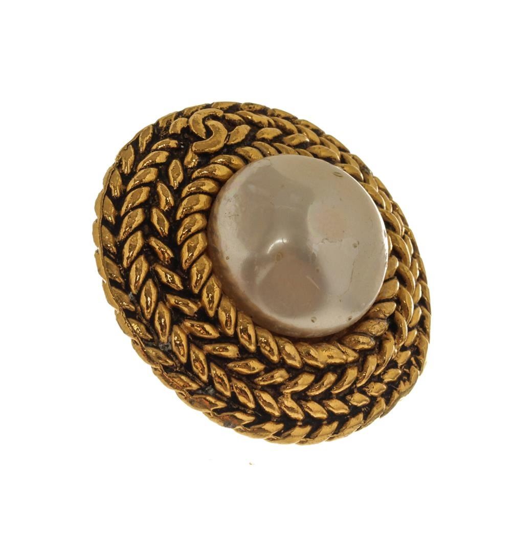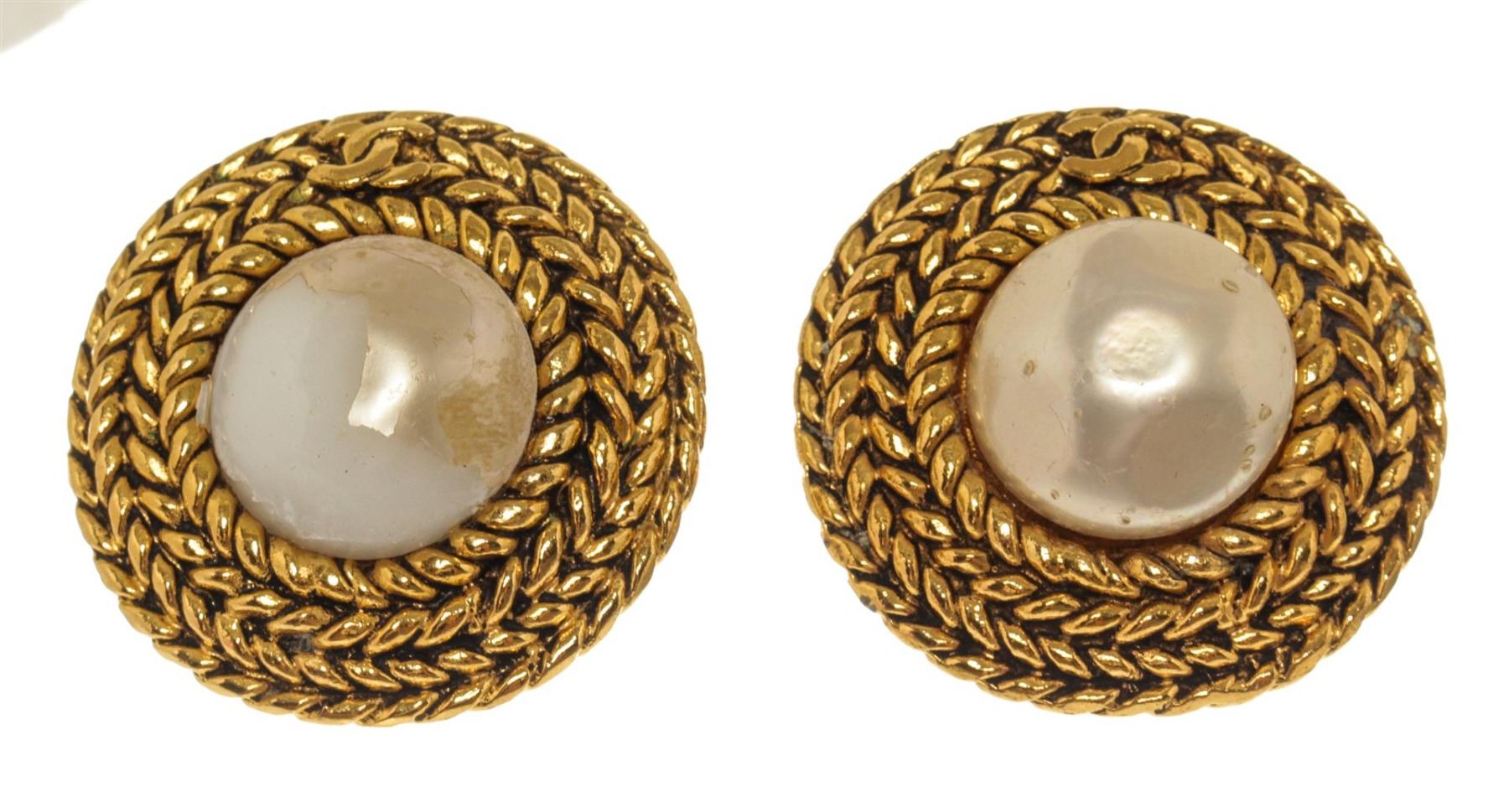 Chanel Gold CC Pearl Braided Disc Earrings. All available information is listed in the description and shown in the photos. Chanel Gold CC Pearl Braided Disc Earrings with gold tone metal hardware, and faux pearls.