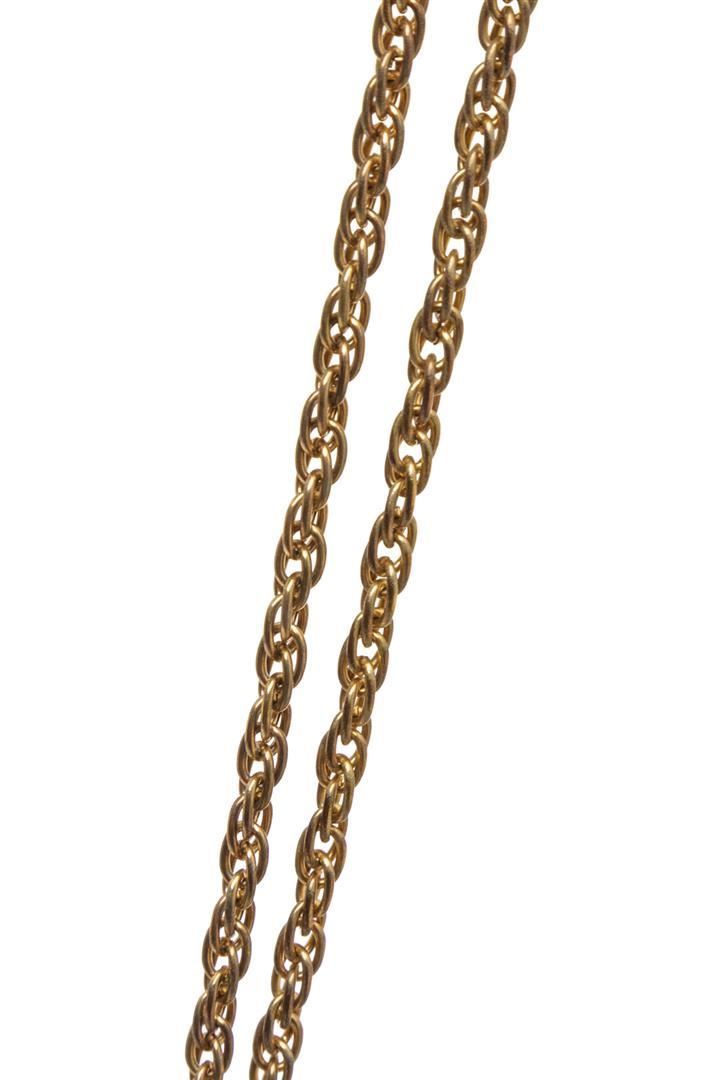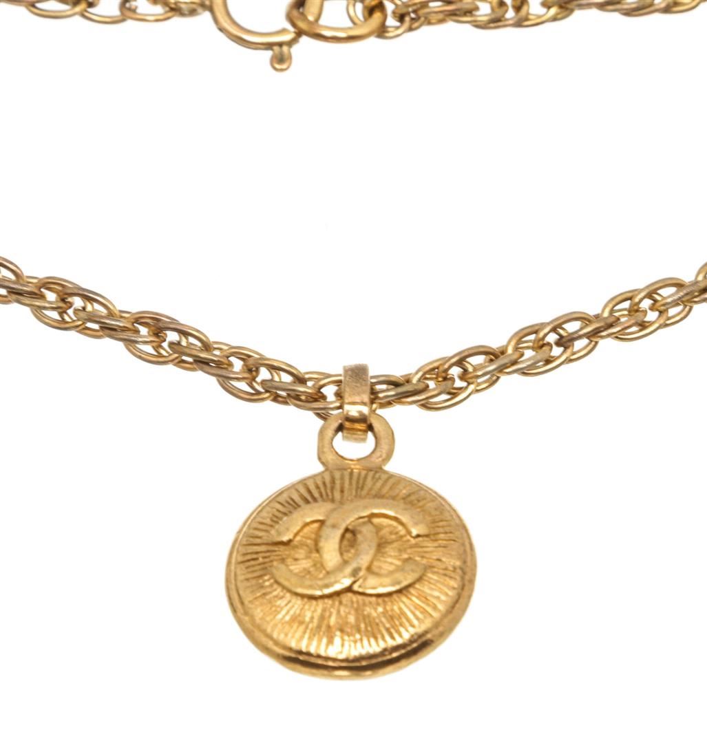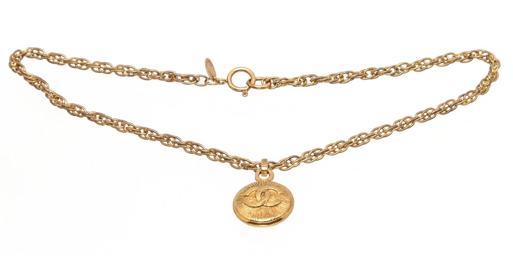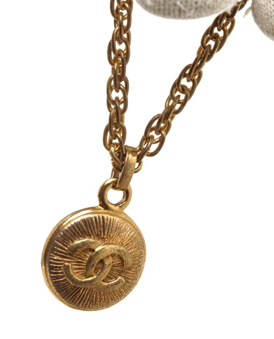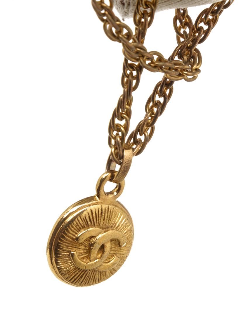 One Chanel Gold CC Pendant Chain Necklace. Chanel gold-tone CC pendant necklace with wheat chain and round clasp.
