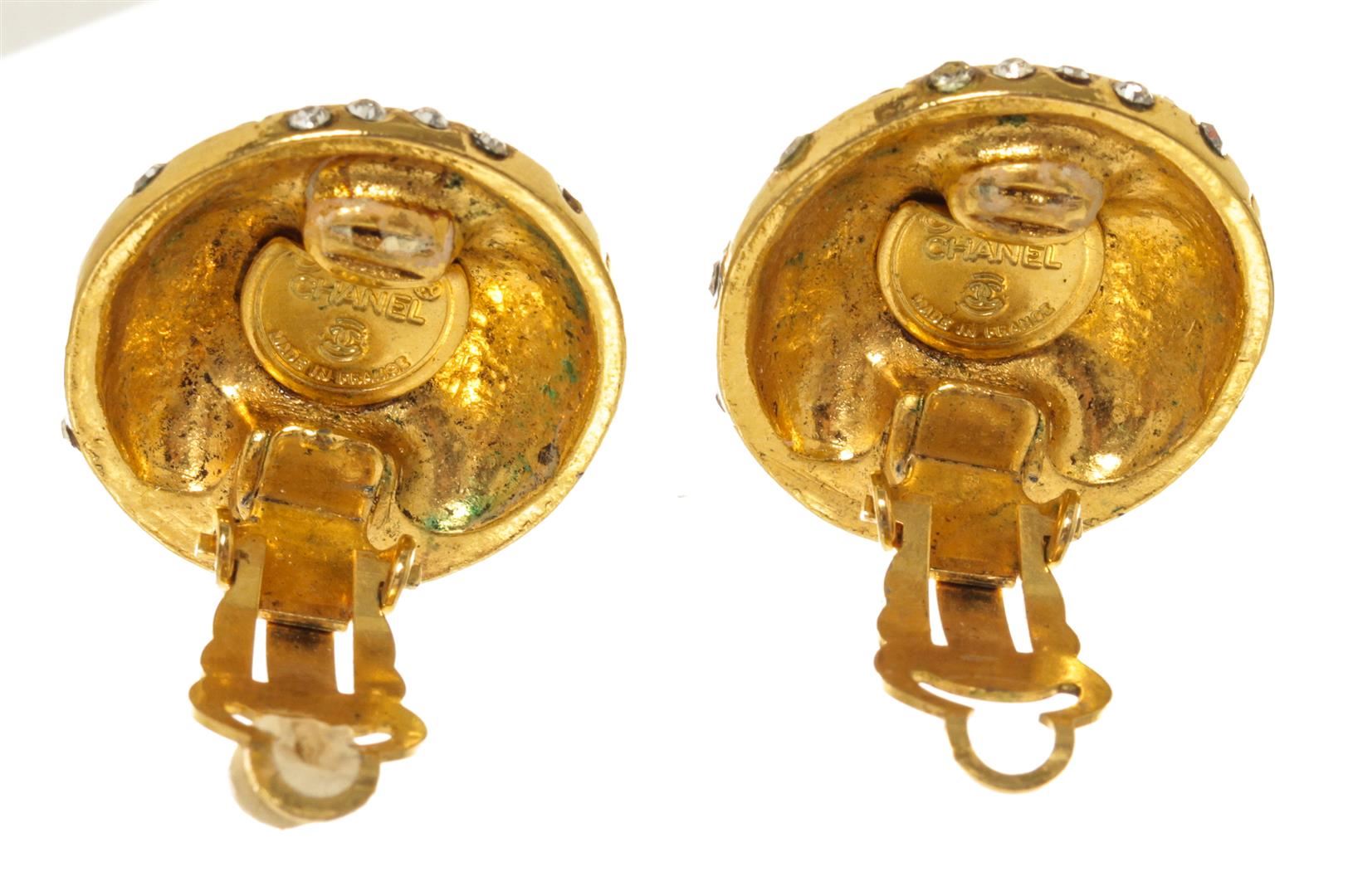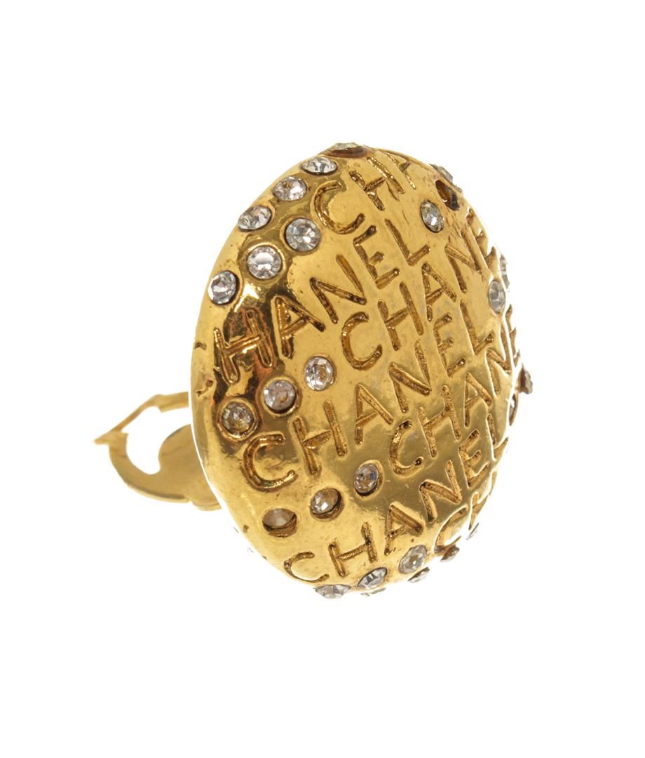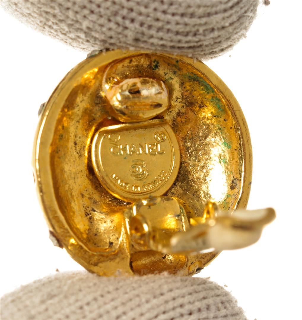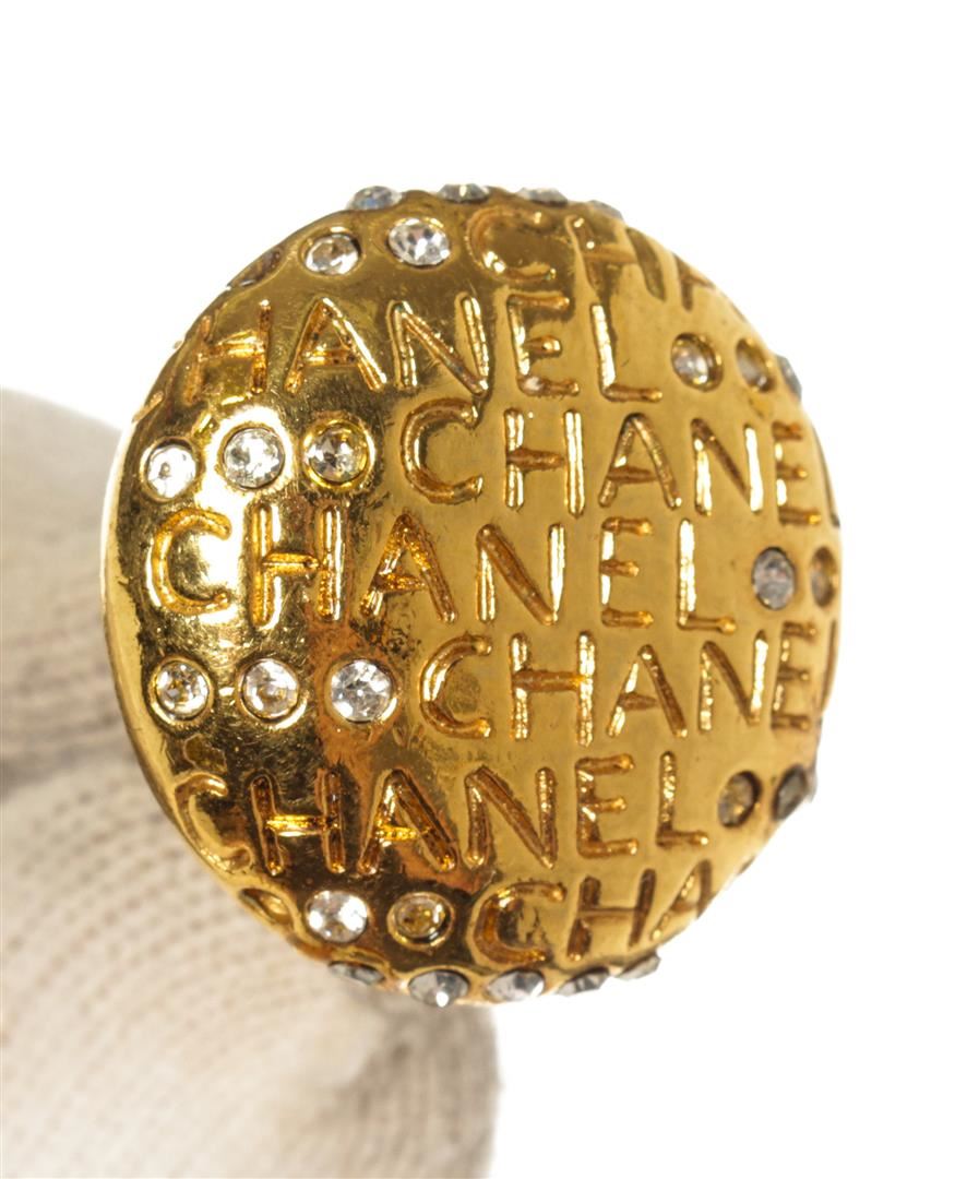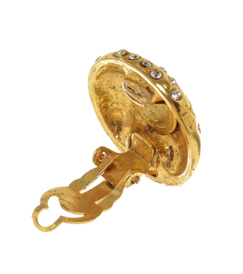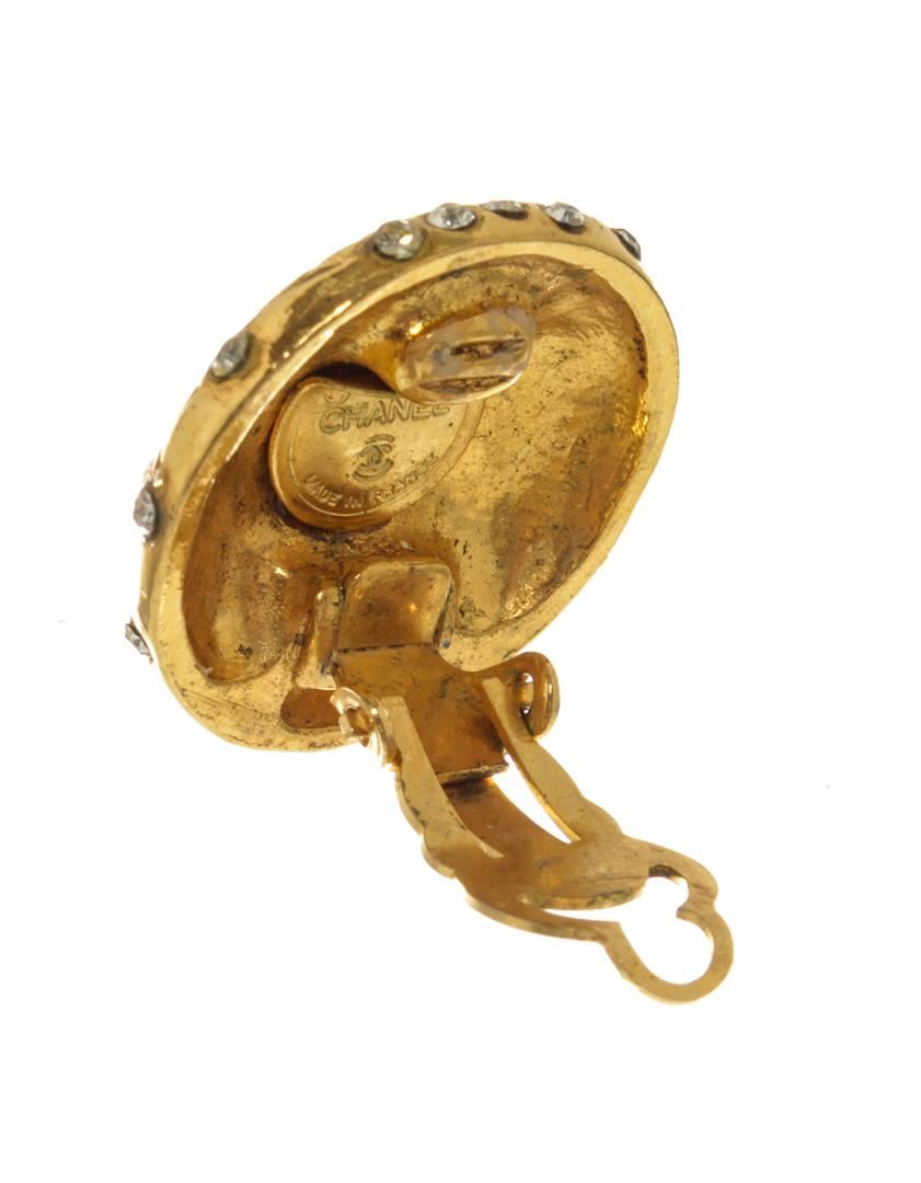 Chanel Gold CC Rhinestone Clip On Earrings. All available information is listed in the description and shown in the photos. Chanel Gold CC Rhinestone Clip On Earrings with gold tone metal hardware, rhinestones, and clip one closure.