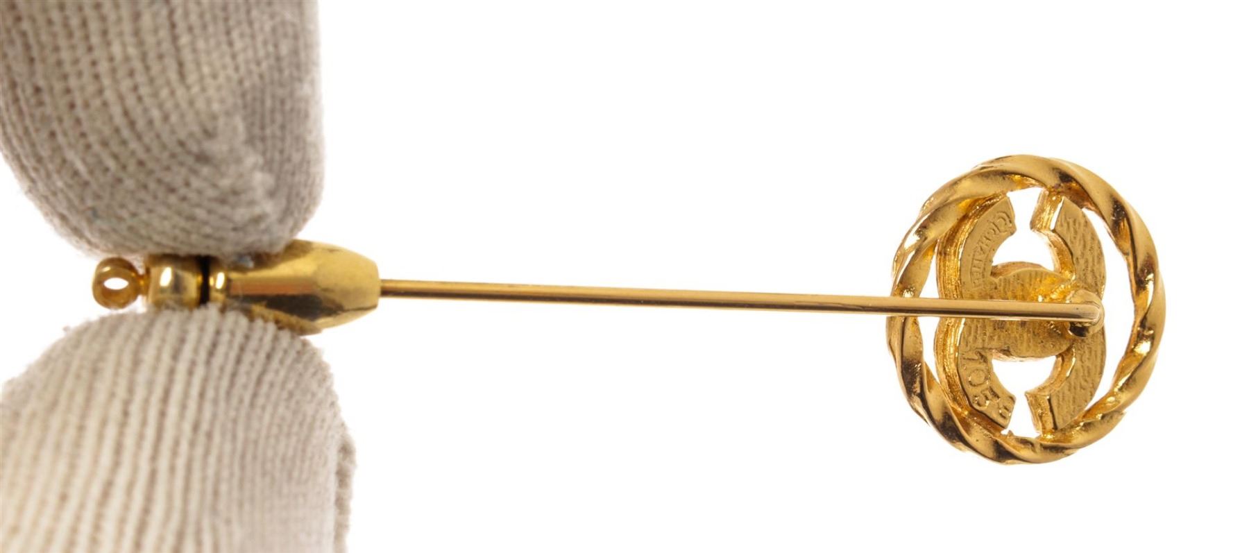 Chanel Gold CC Rhinestone Pin Brooch. All available information is listed in the description and shown in the photos. Chanel Gold CC Rhinestone Pin Brooch with cc logo with rhinestones all over with a single pin, gold-tone hardware.