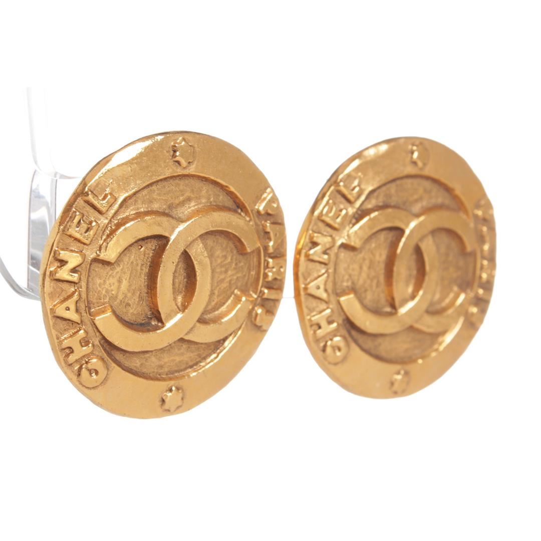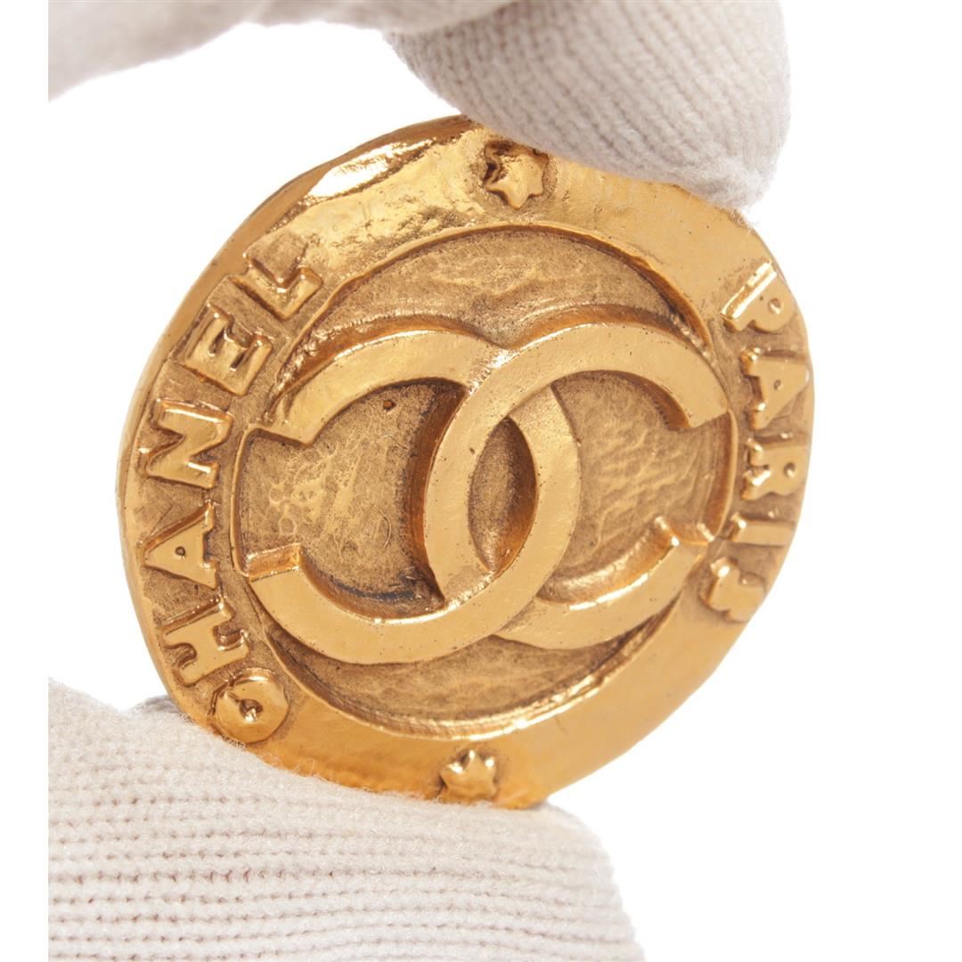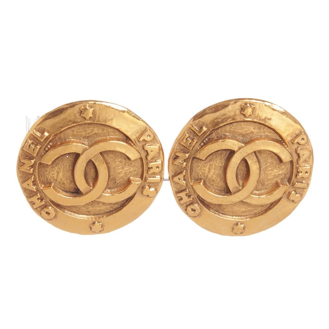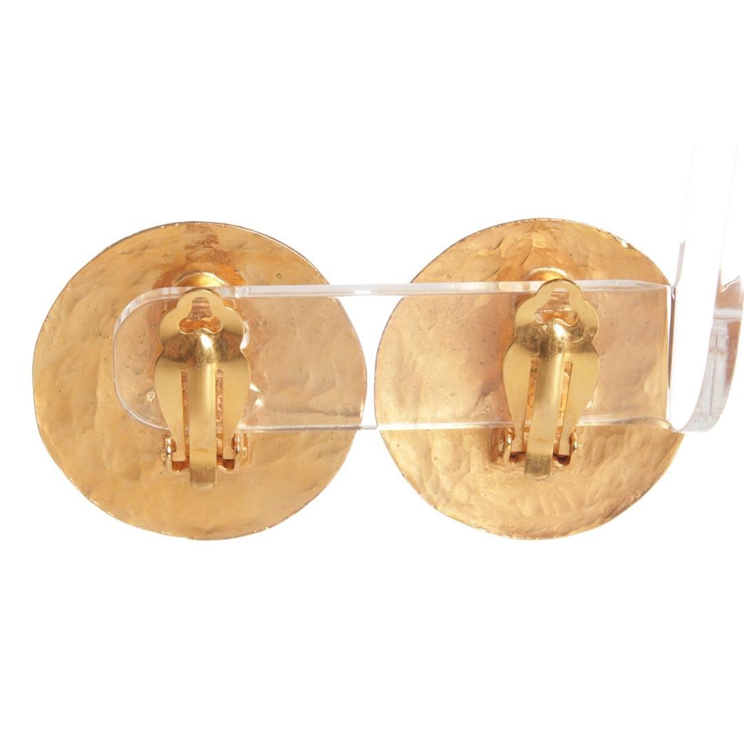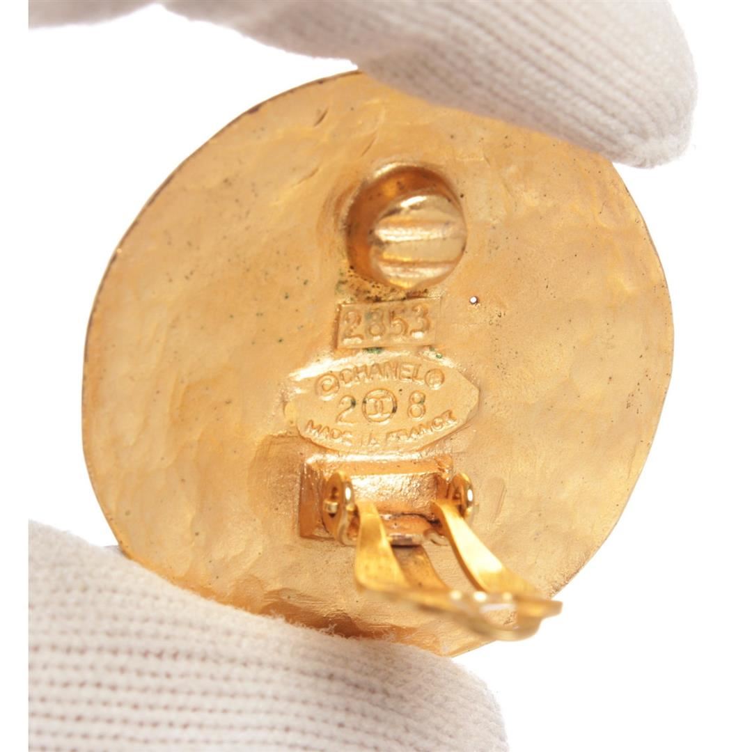 Chanel Gold CC Round Disk Hammered Large Clip On Earrings. Clip On Backing. Dimensions = 1.25"x1.25"/3.1cmx3.1cm. Item is pre-owned.
